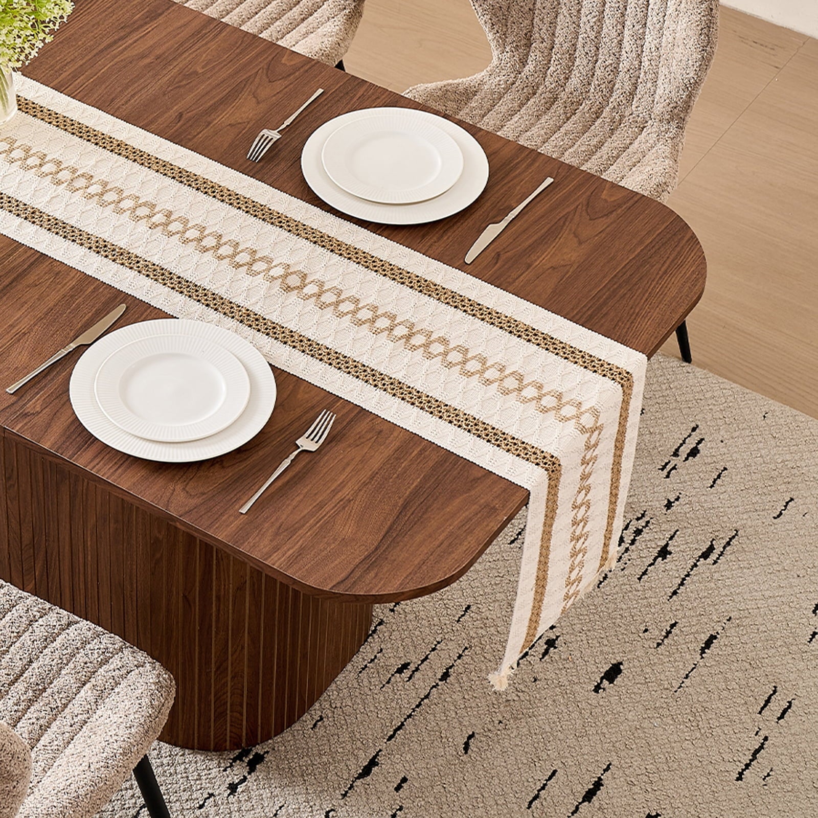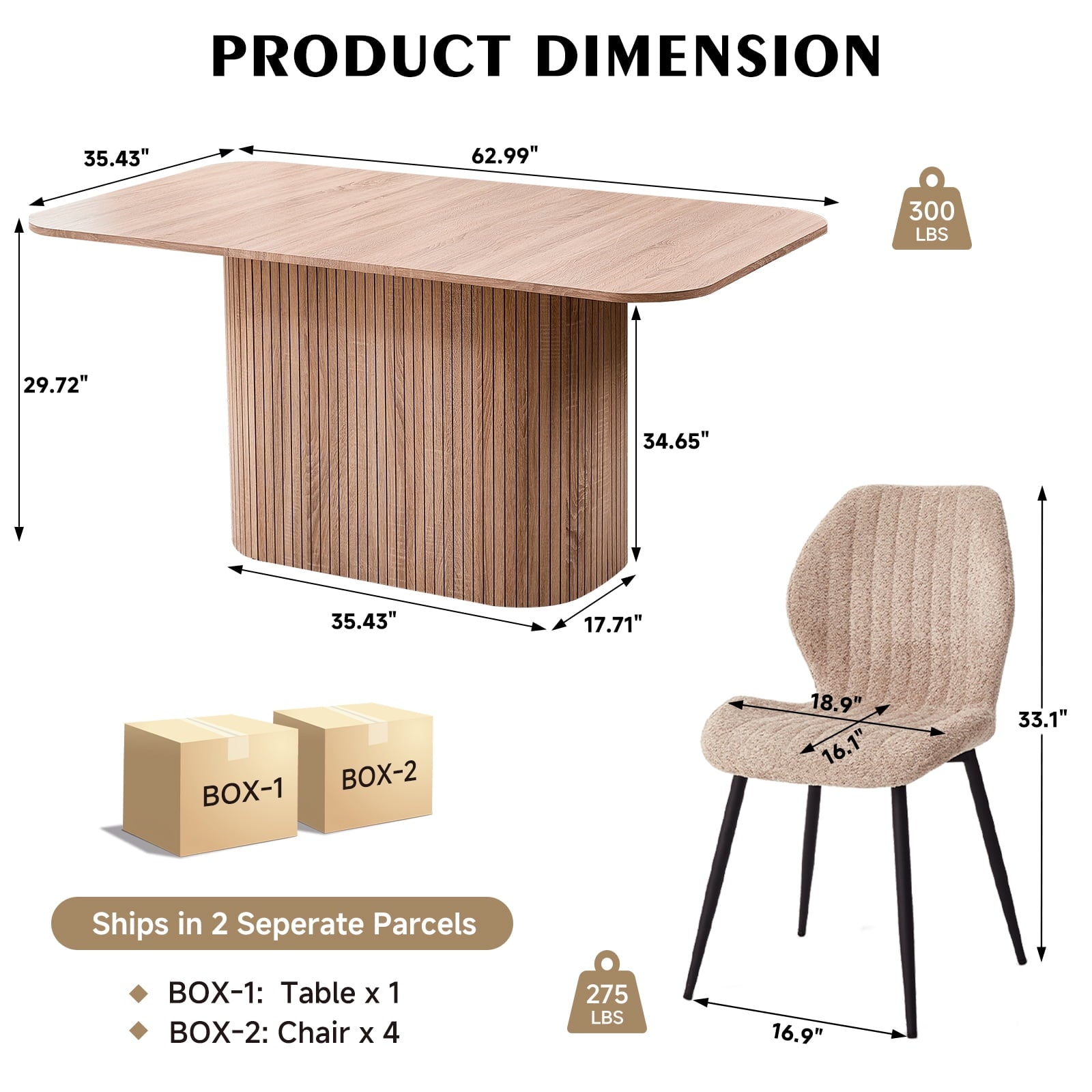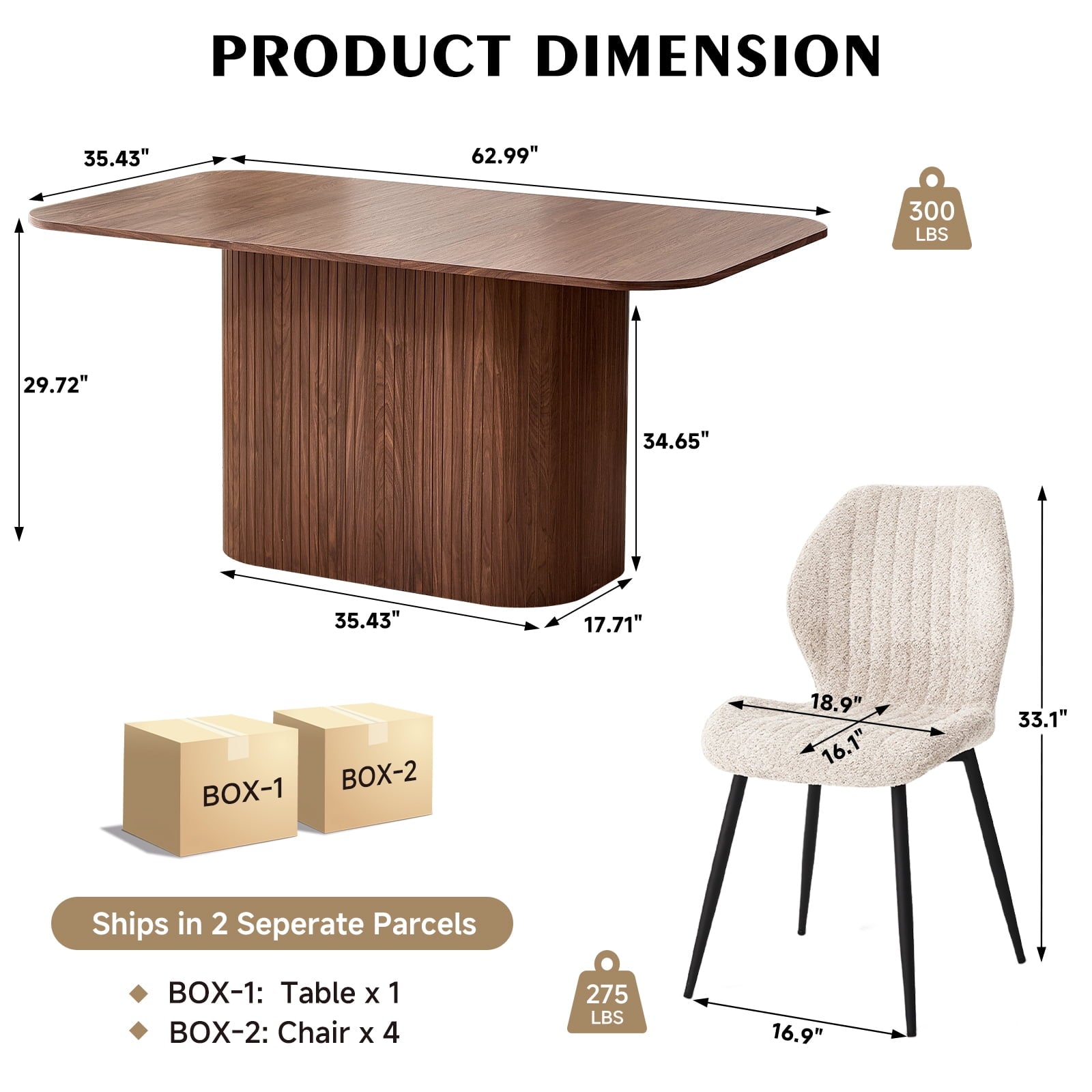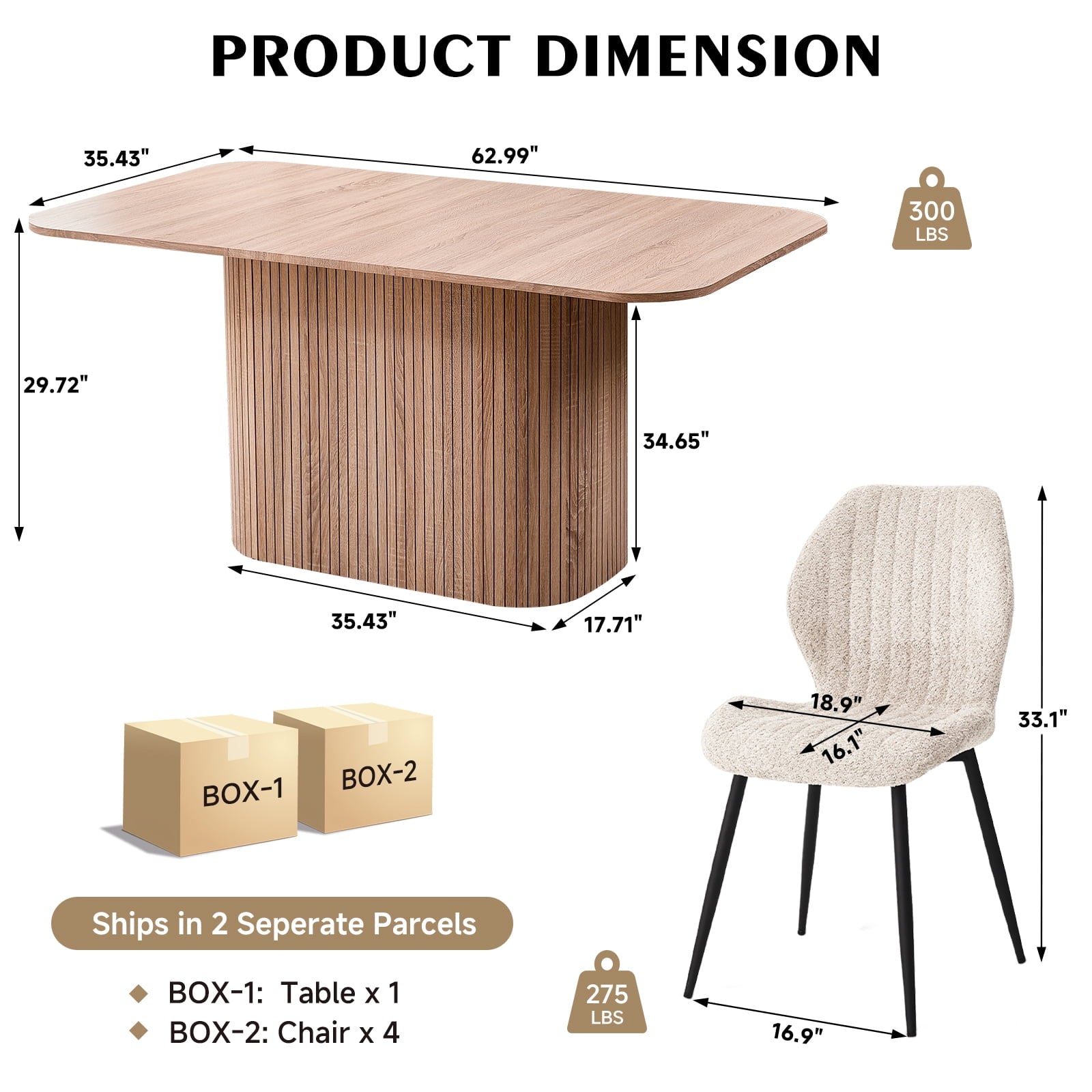 This 4-seat dining set blends functionality with style, ideal for diverse home layouts. The table measures 35.4″ D x 62.9″ L x 29.7″ H, and each chair (16.1″ D x 18.9″ W, 33.1″ overall height) is thoughtfully proportioned for comfort—no cramped meals here. Its compact design fits apartments to kitchens, complementing decor from modern to farmhouse.The table has an engineered wood top with realistic wood grain, supported by a sturdy metal frame. Chairs feature soft, textured boucle upholstery (adds elegance!) and stable metal legs—combining durability, coziness, and contemporary flair for daily use.Softly rounded table corners boost safety (fewer bumps!) and a sleek look, plus make moving/positioning easier—enhancing your dining space’s flow.