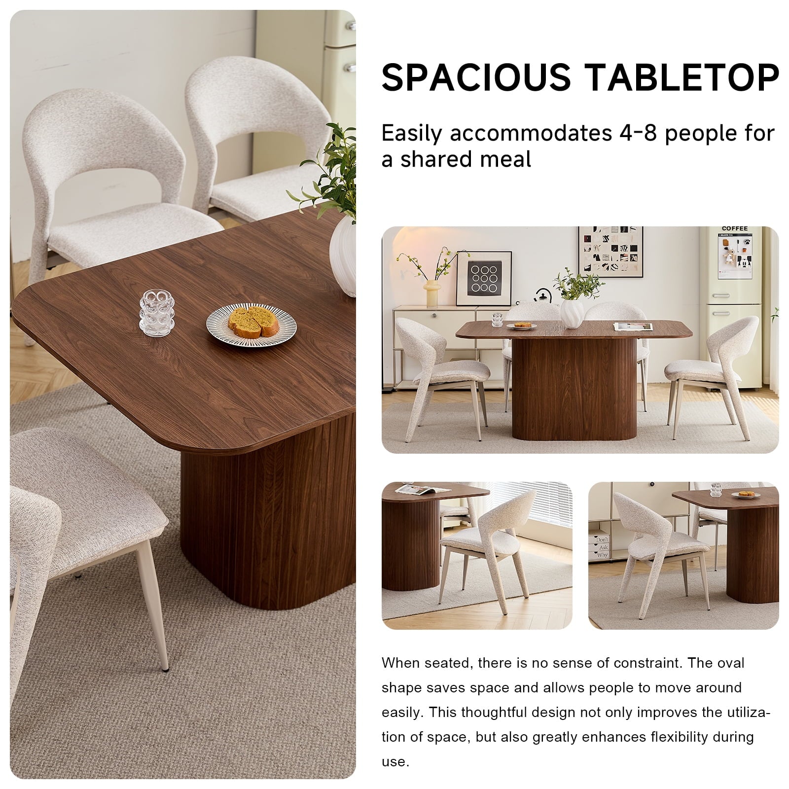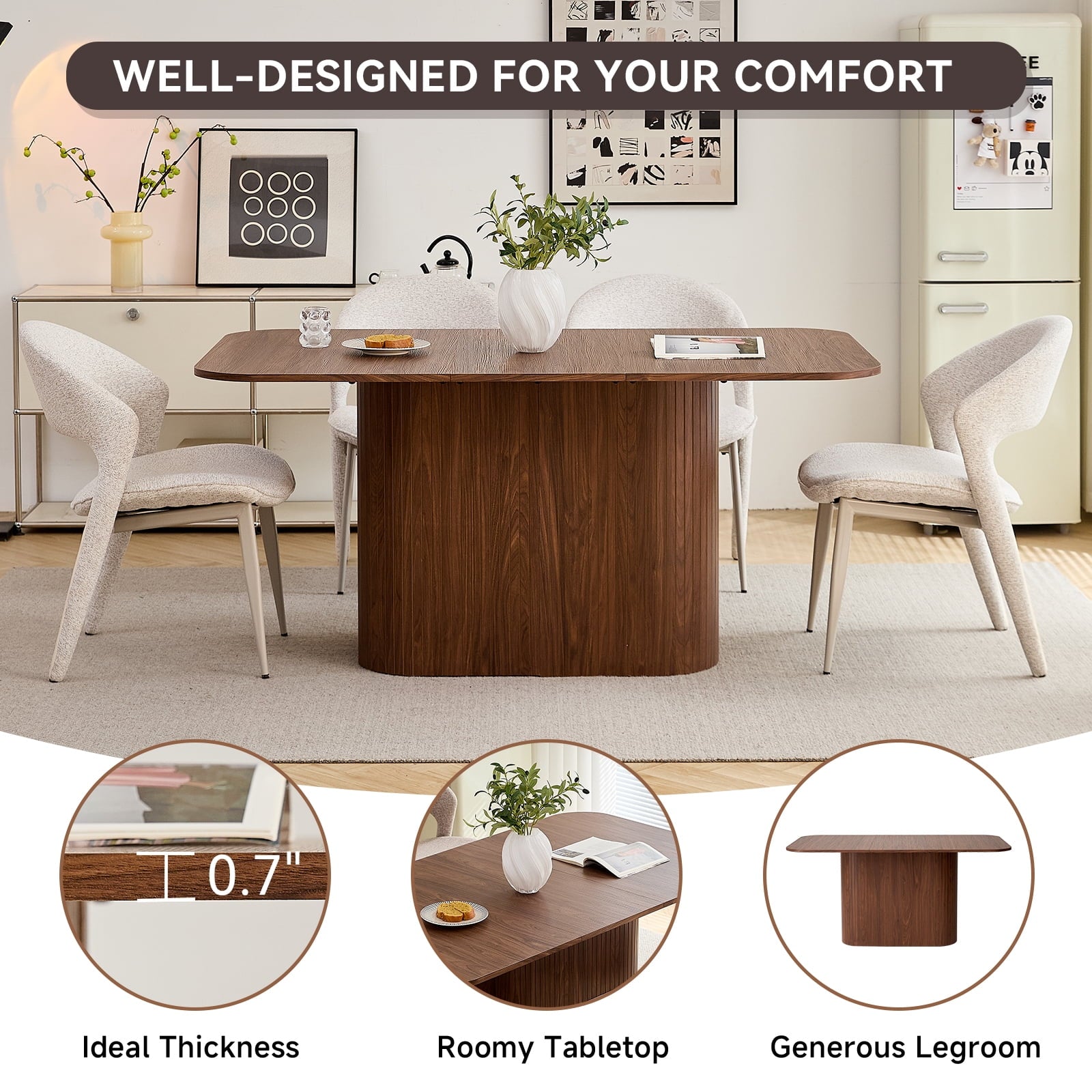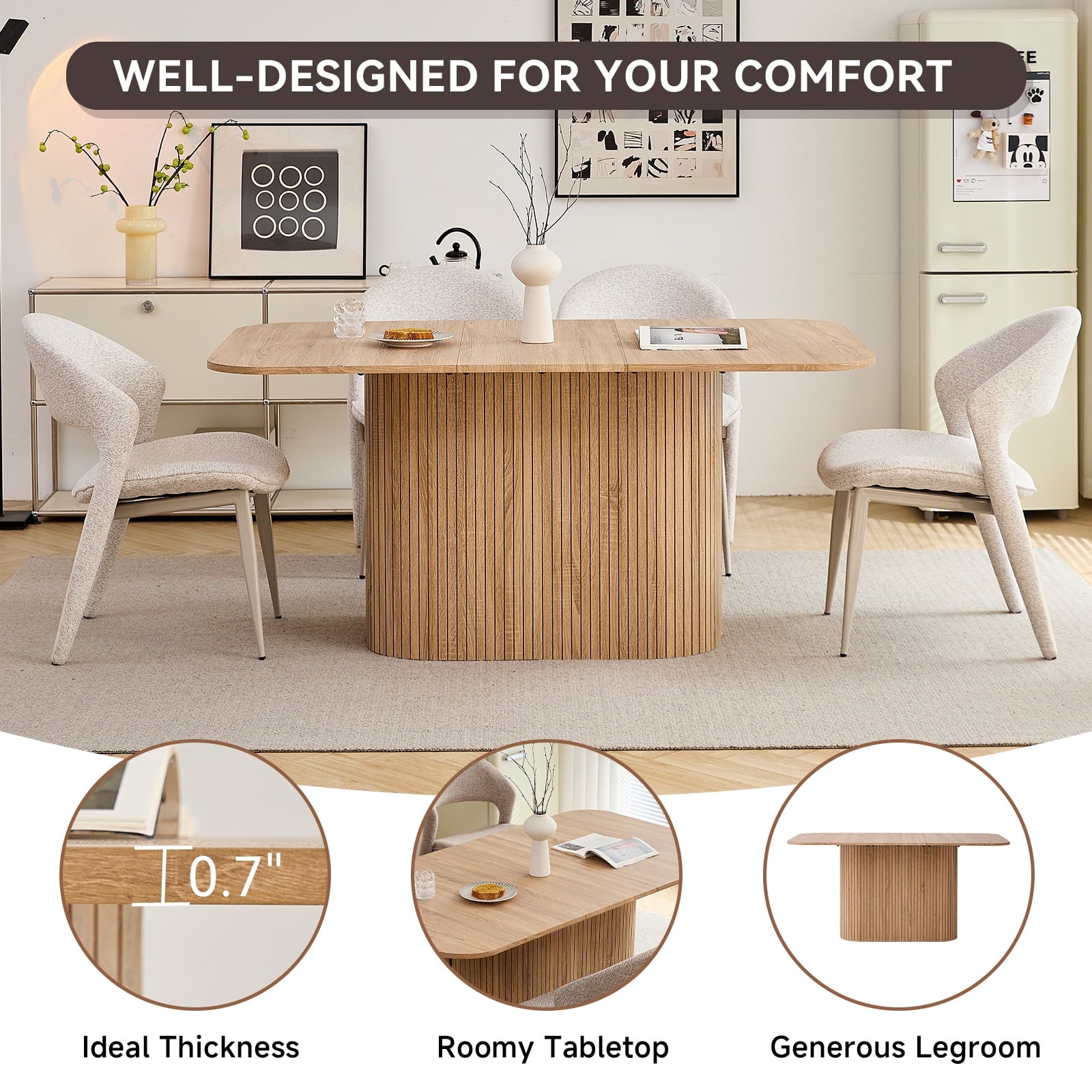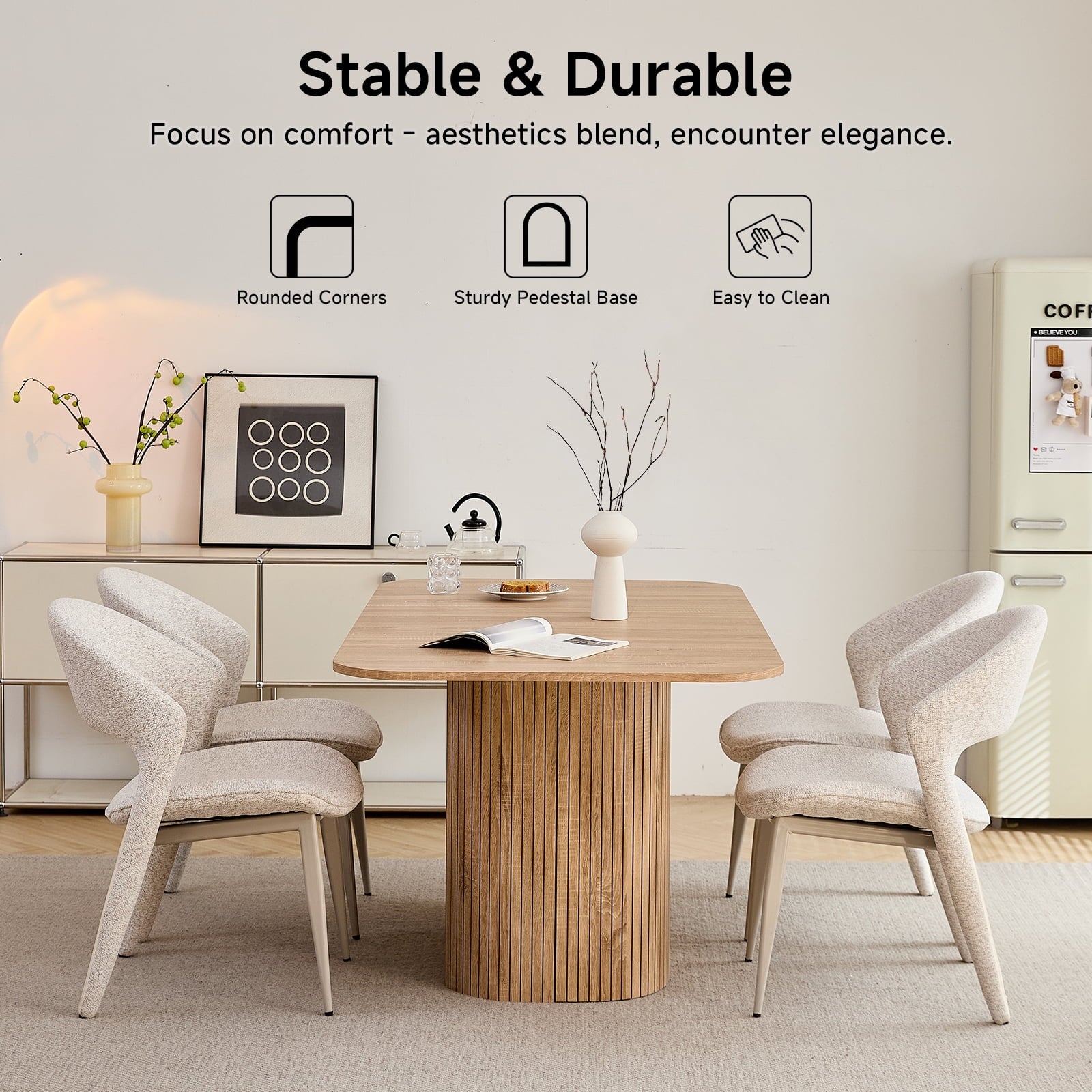 • The table’s rounded corners boost safety (reduces bumps) and sleek look, while making it easier to move. This thoughtful detail enhances both the function and flow of your dining space, adding practicality to aesthetics.