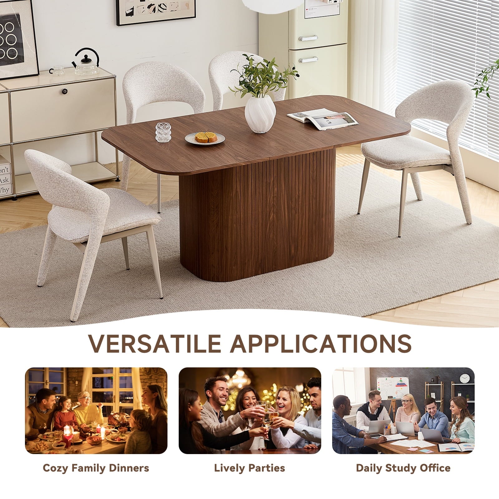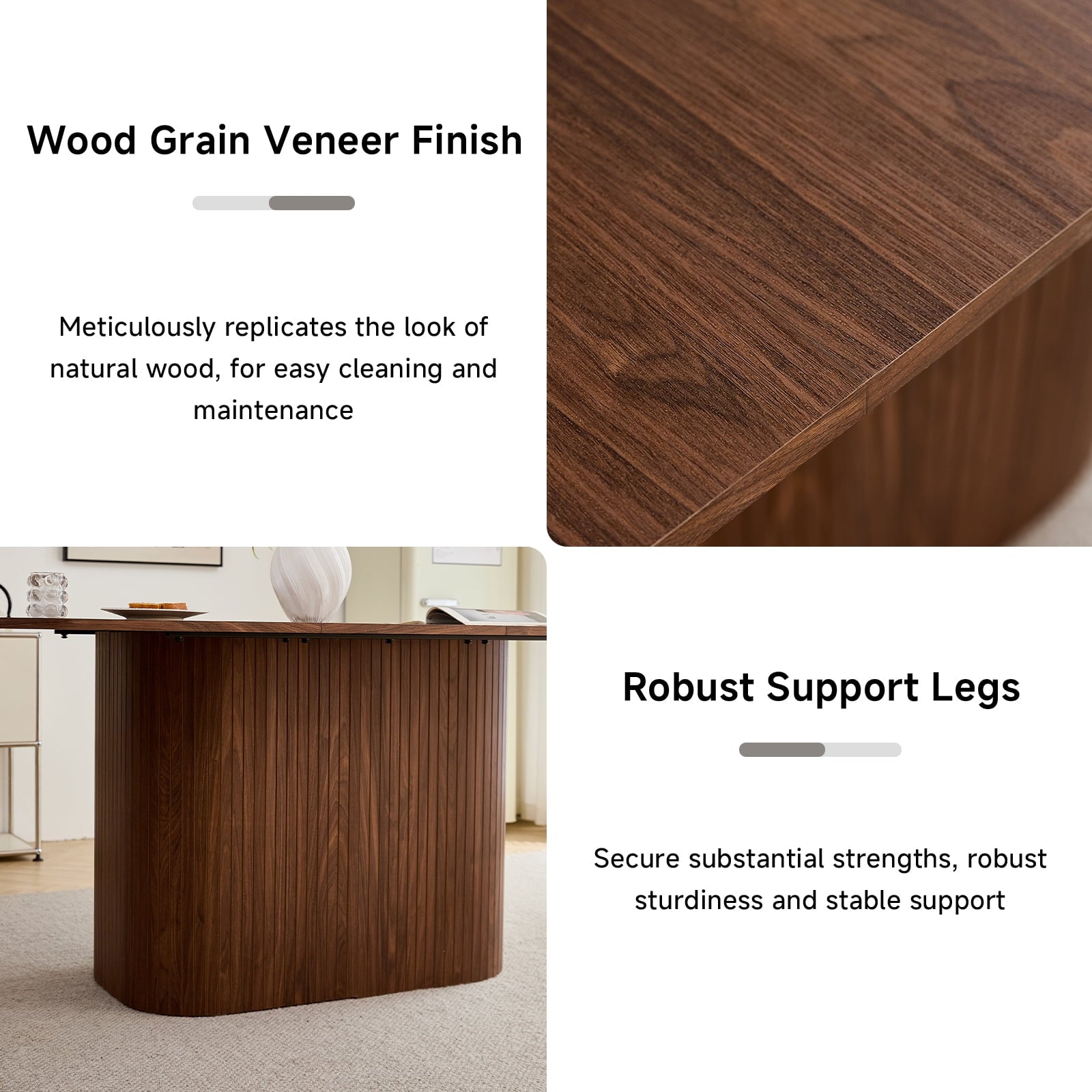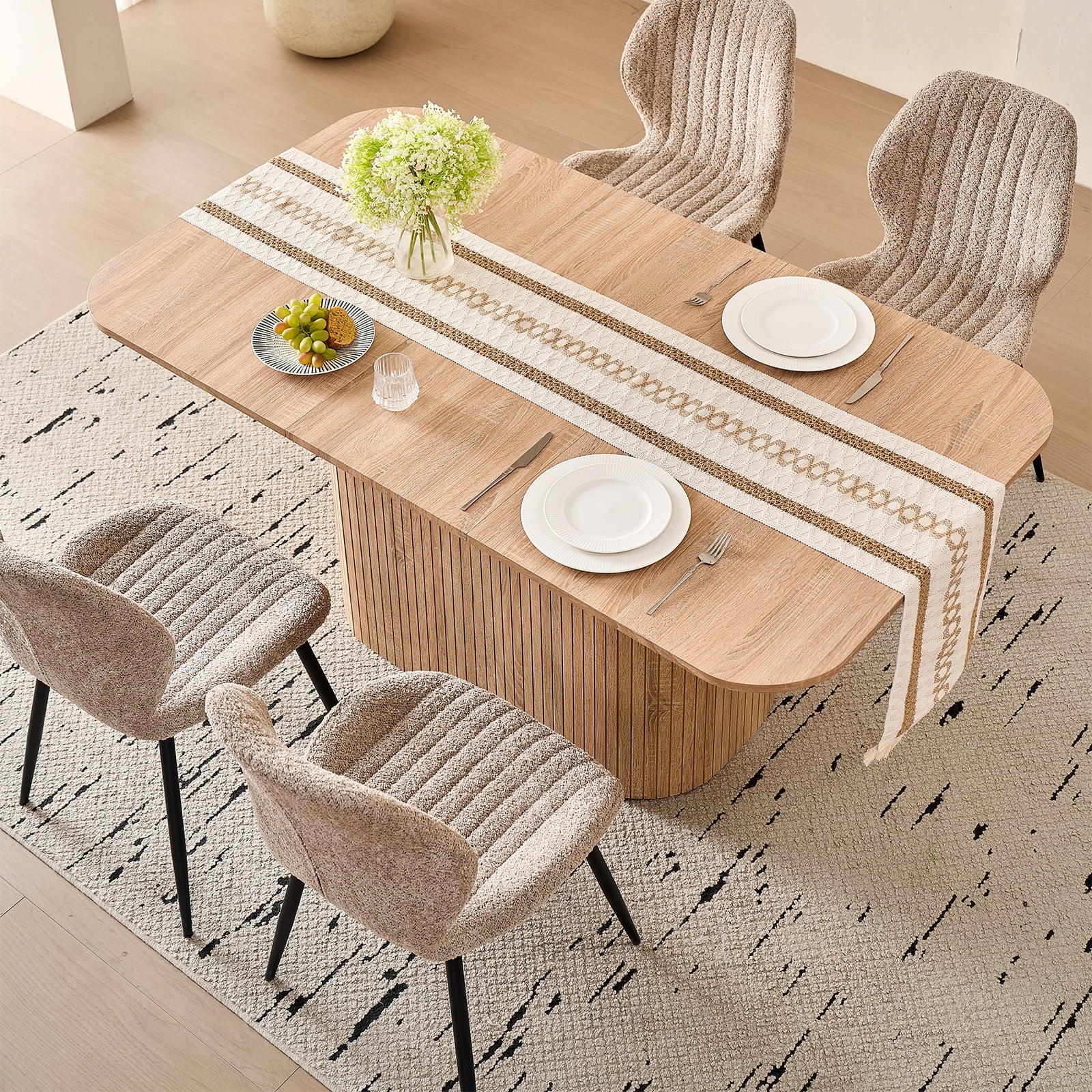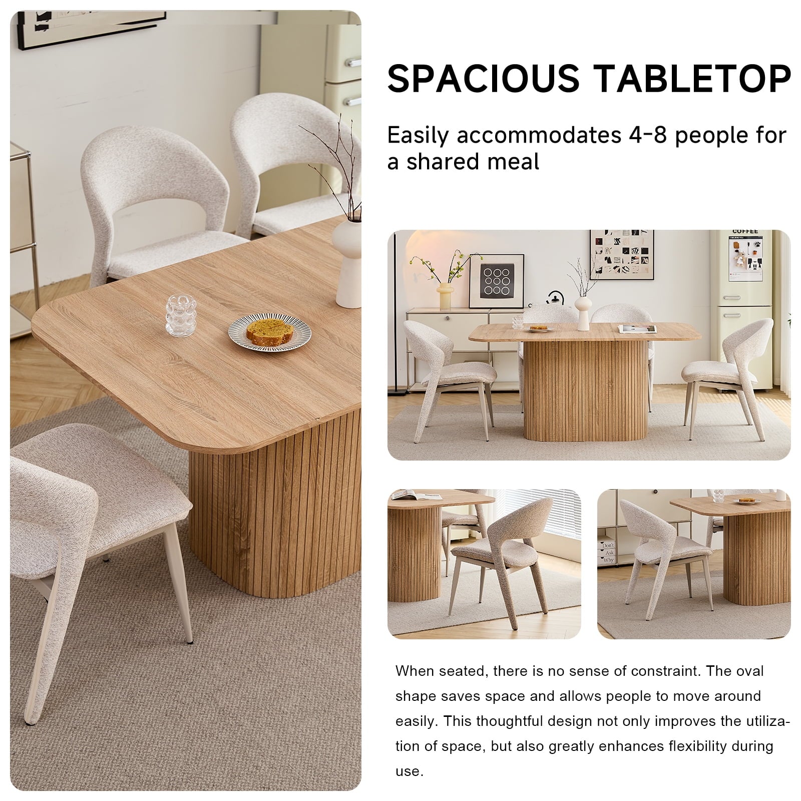 • The table’s rounded corners boost safety (reduces bumps) and sleek look, while making it easier to move. This thoughtful detail enhances both the function and flow of your dining space, adding practicality to aesthetics.