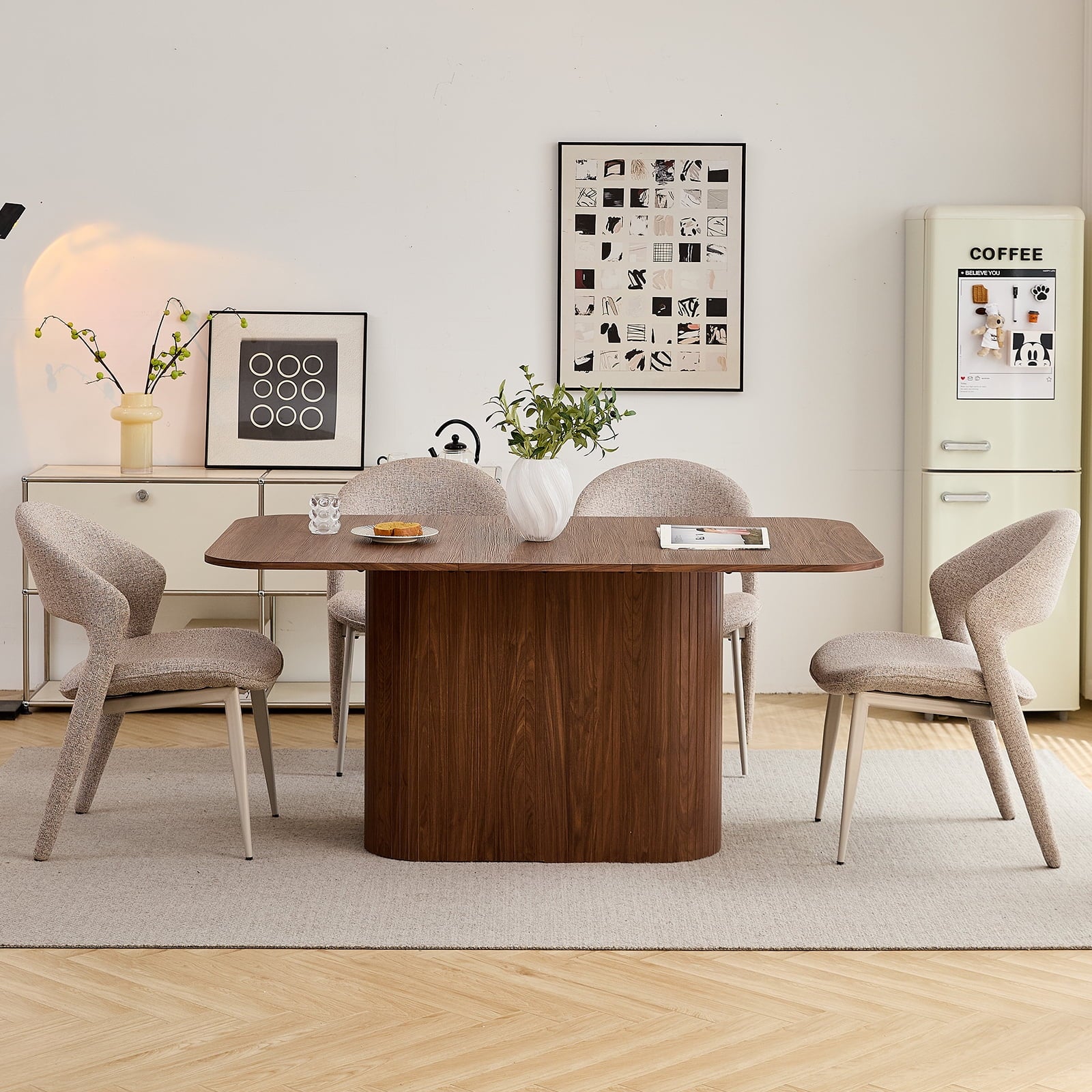 • 63" Walnut Table + 4 Beige Chairs