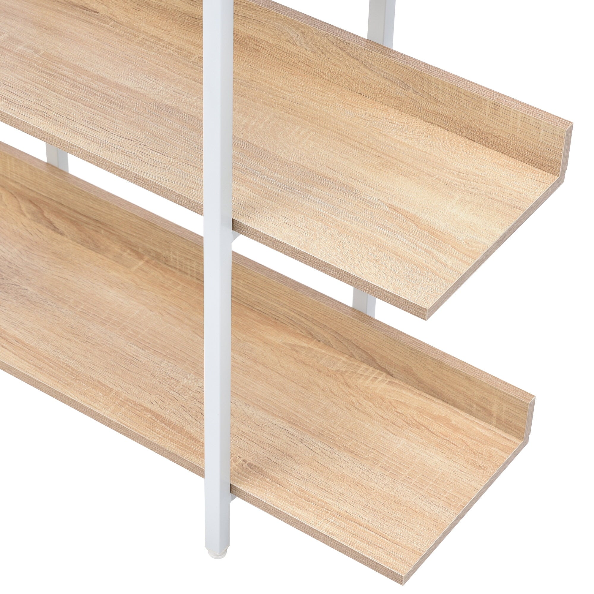 - Industrial Chic Design – Combines White Metal Frame with Warm Oak Mdf Shelves for Stylish Storage
