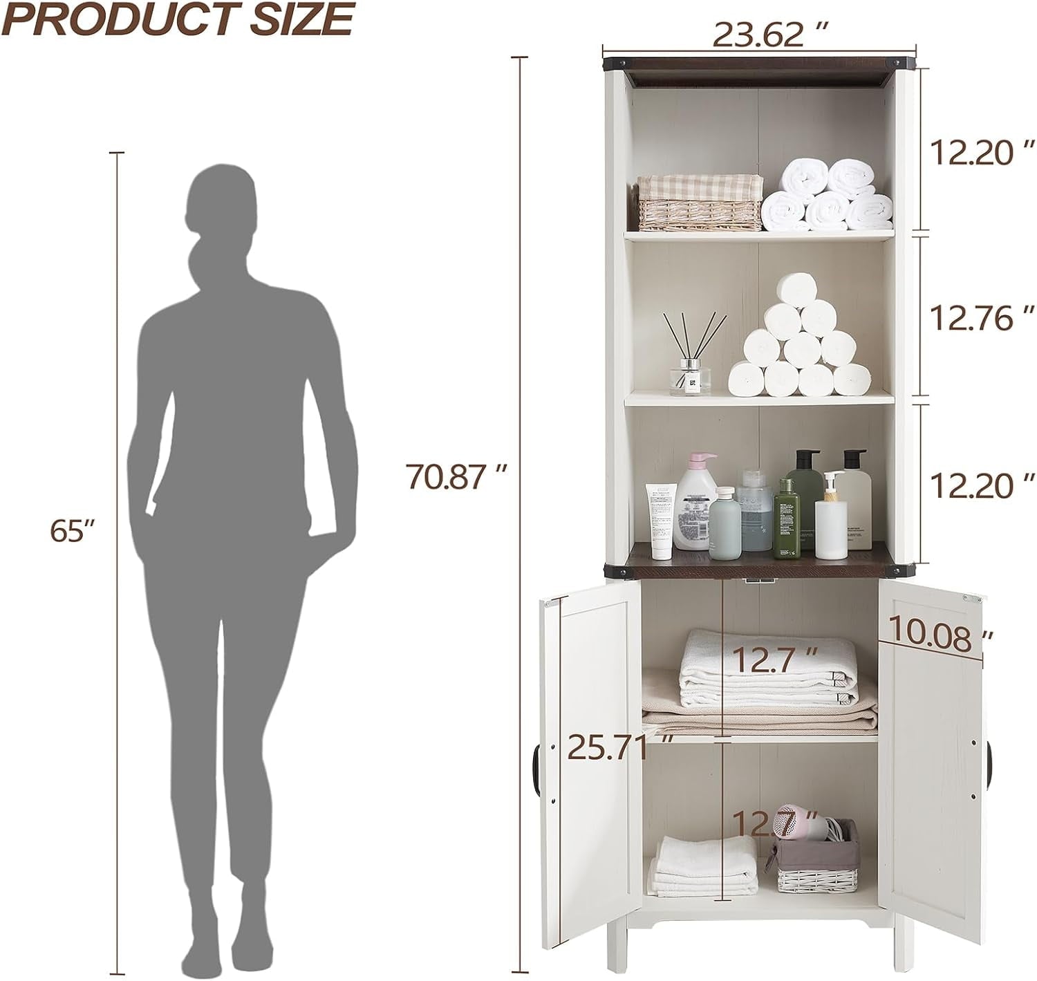 Multifunctional Storage: The bathroom cabinet with two doors and three spacious open shelves offers multifunctional storage options. Whether it is shampoo, body wash, or bath towels, towels, are all in this storage space, so that your bathroom is organized and life is more convenient
