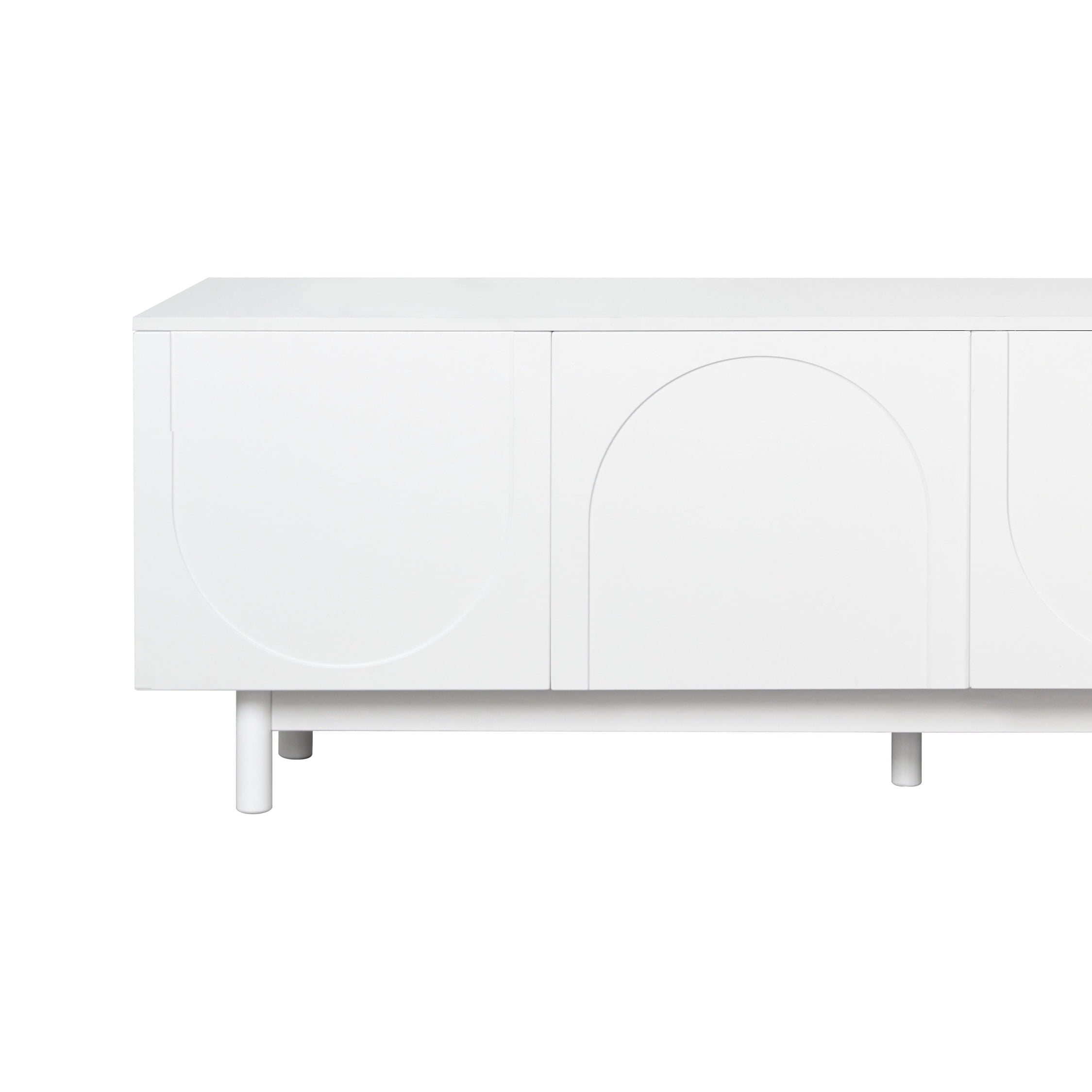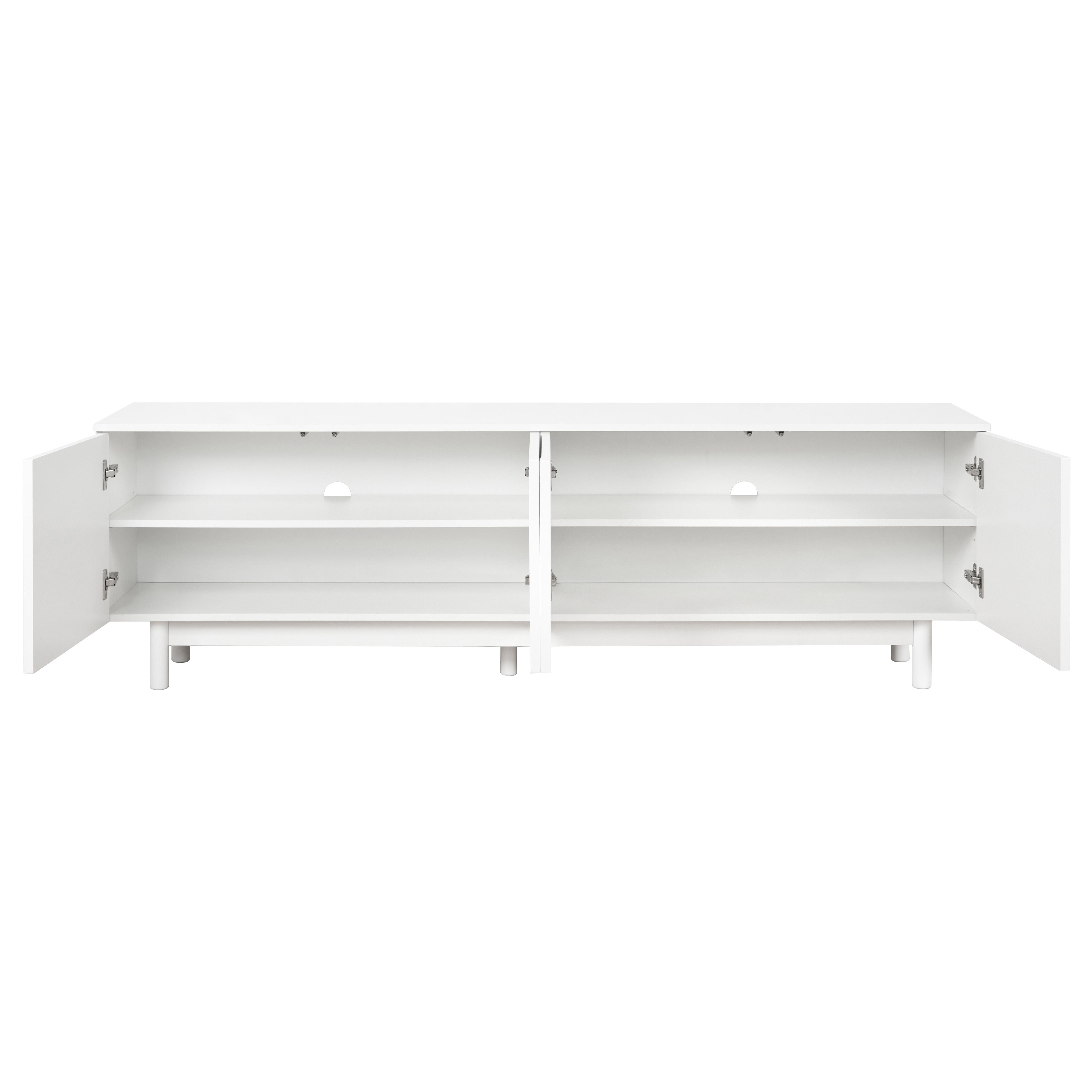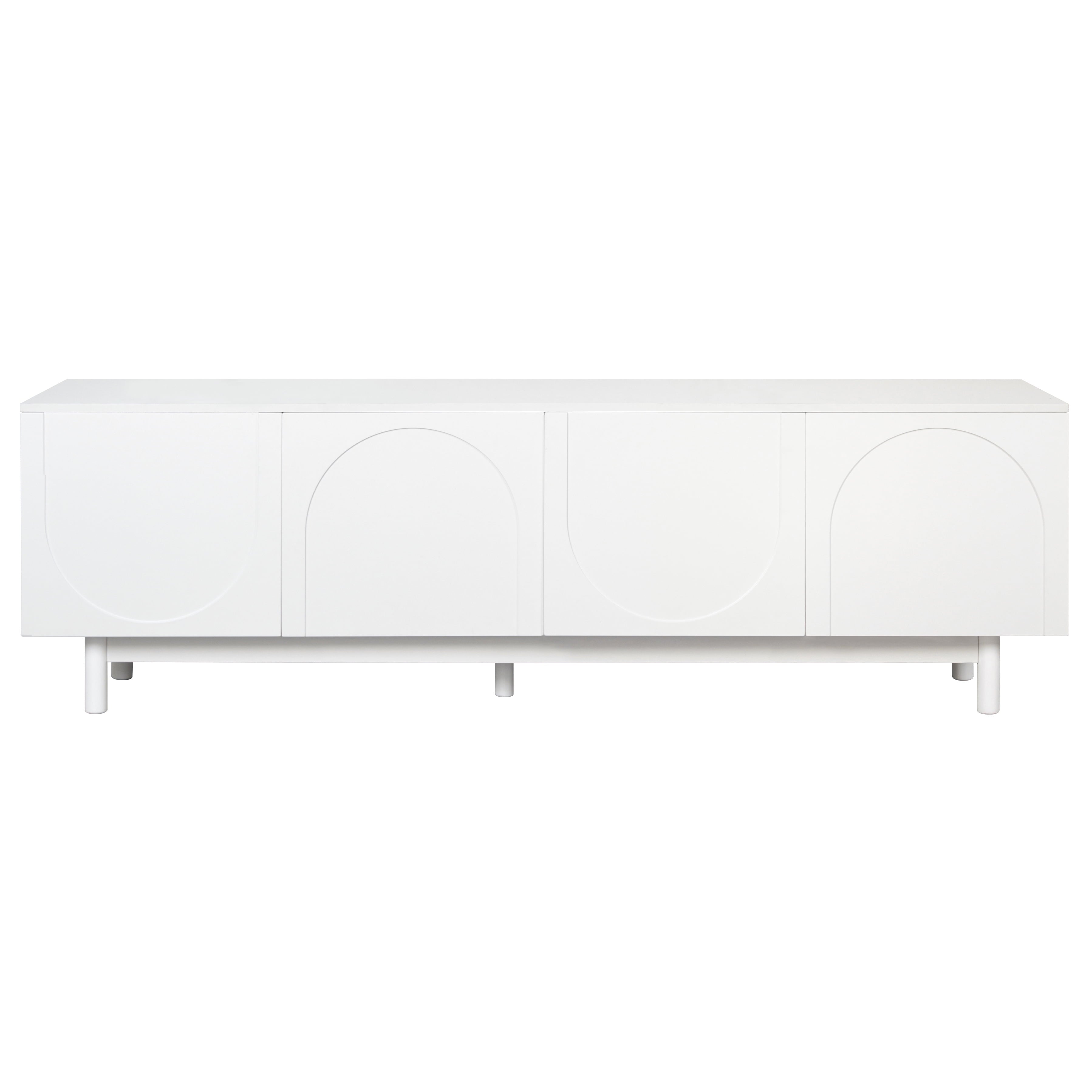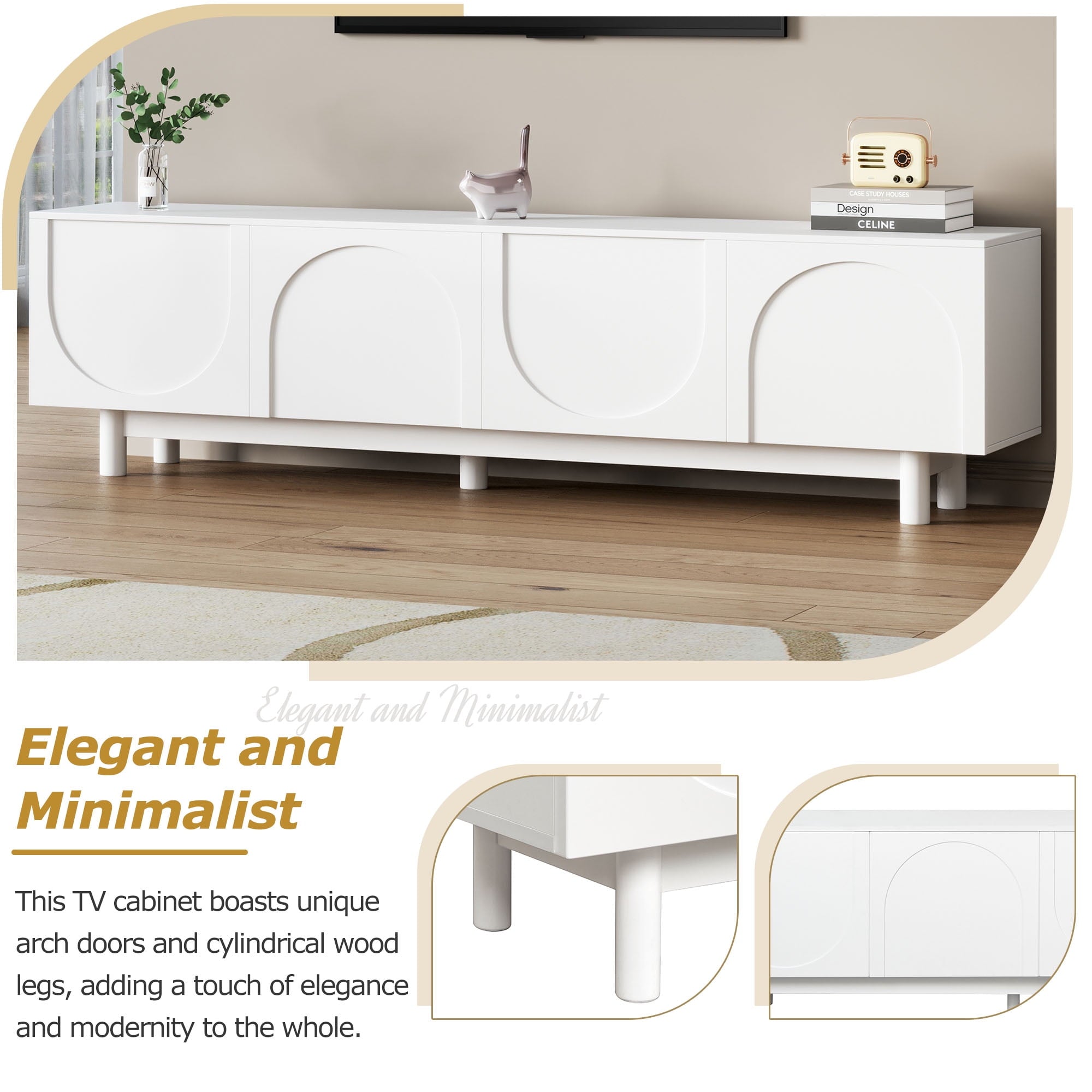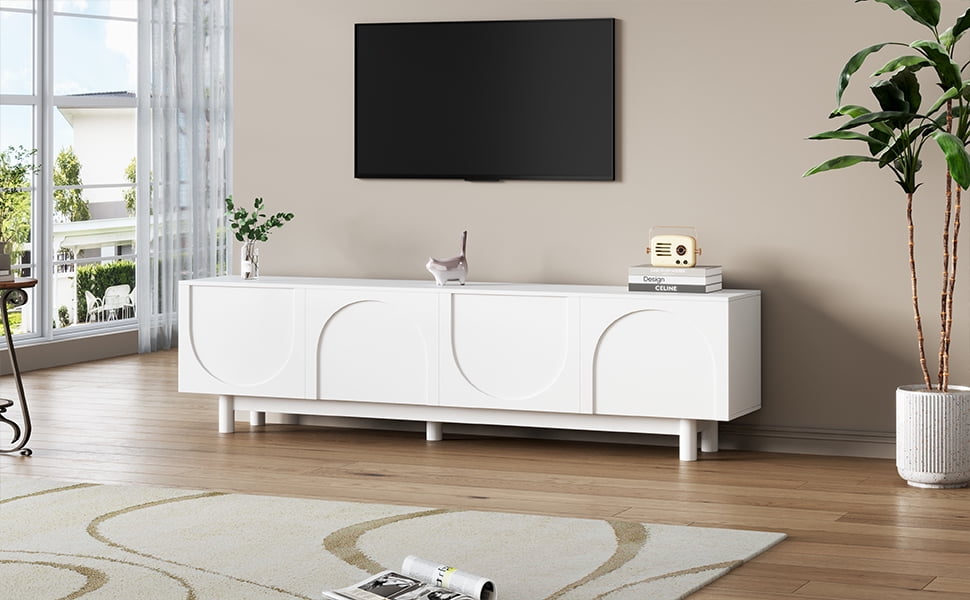Elevate your entertainment space with this 71″ minimalist TV stand, featuring soothing arched cabinets, cylindrical wood legs, and adjustable shelves. Designed for TVs up to 78″ (88 lb capacity), this white media console blends Scandinavian-inspired design with practical organization—perfect for modern living rooms.