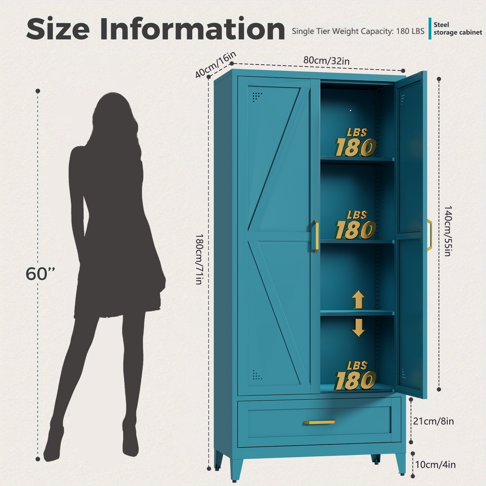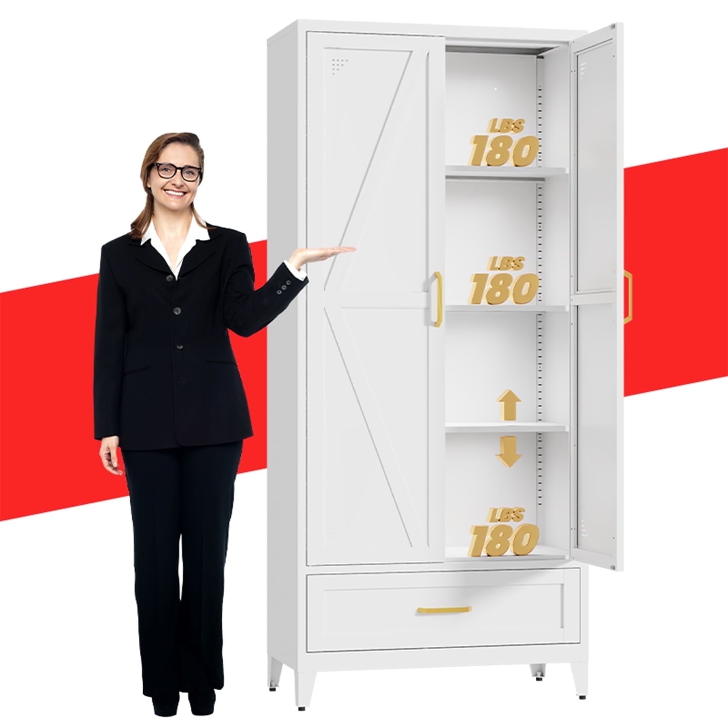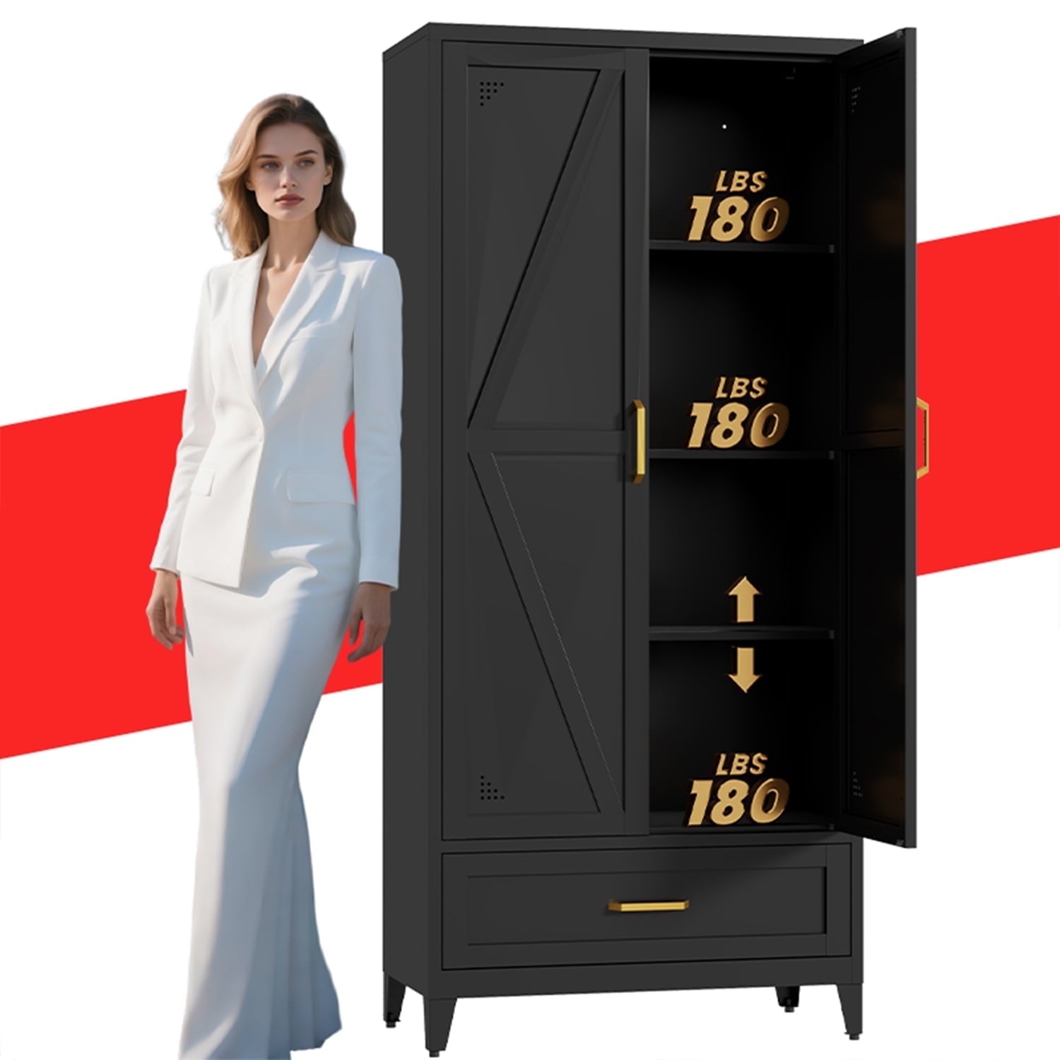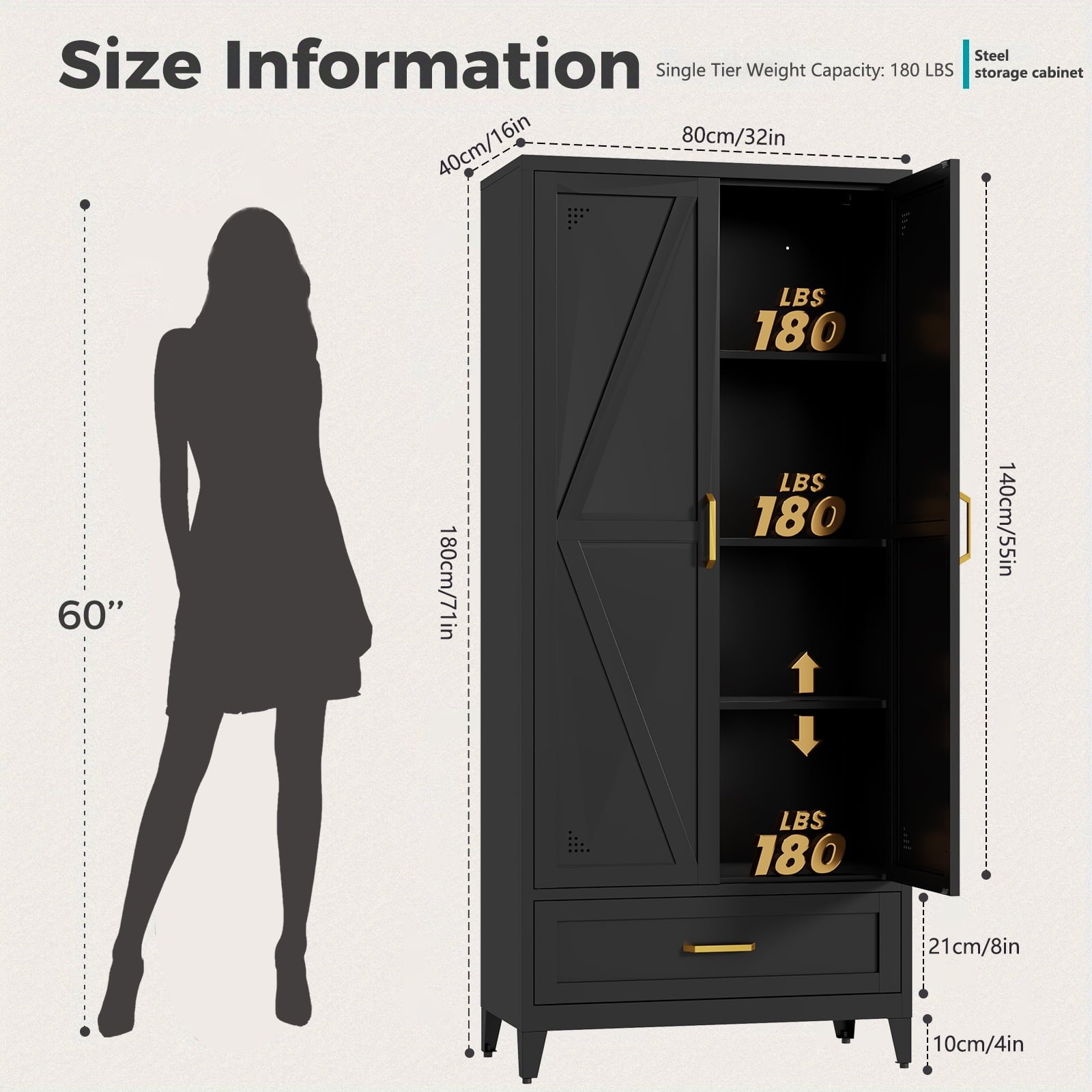 High-quality steel cabinet body, with a powder coating on the surface, is scratch-resistant and rust-proof. It features magnetic door closing and anti-overturning functions, ensuring the safety of you and your family. Each shelf has a rated support capacity of up to 180 pounds, providing excellent load-bearing capacity and being able to withstand the challenges of long-term use