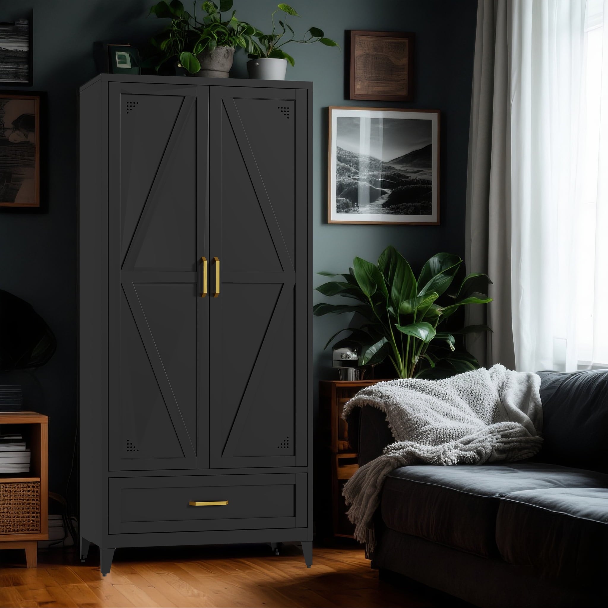 Our storage cabinets feature a farmhouse style, with two barn doors and custom metal handles. It seamlessly blends modern rural aesthetics with the warmth of an old-fashioned farmhouse, complementing your living space with various decorative styles.