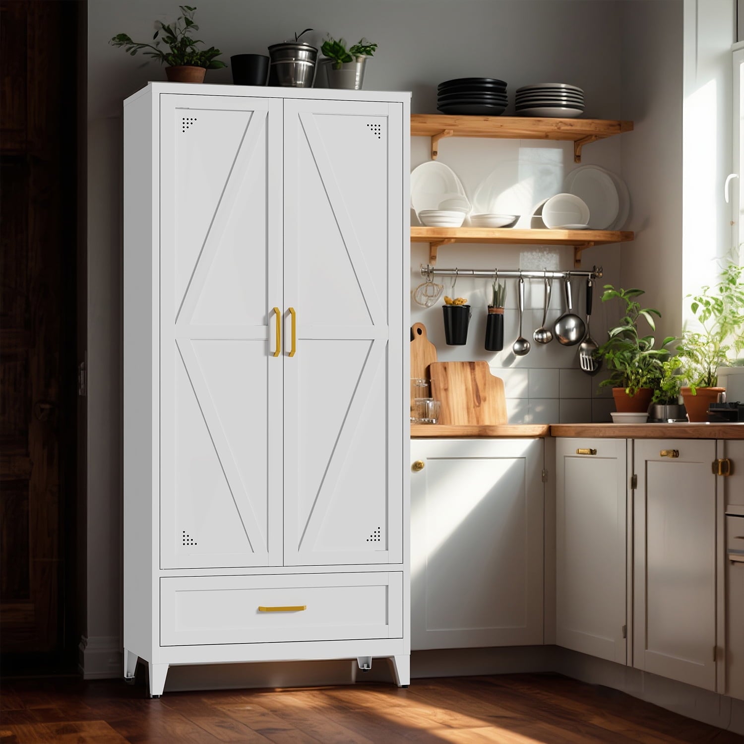 - 【 Elegant Farmhouse Style 】 : Our storage cabinets feature a farmhouse style, with two barn doors and custom metal handles. It seamlessly blends modern rural aesthetics with the warmth of an old-fashioned farmhouse, complementing your living space with various decorative styles
