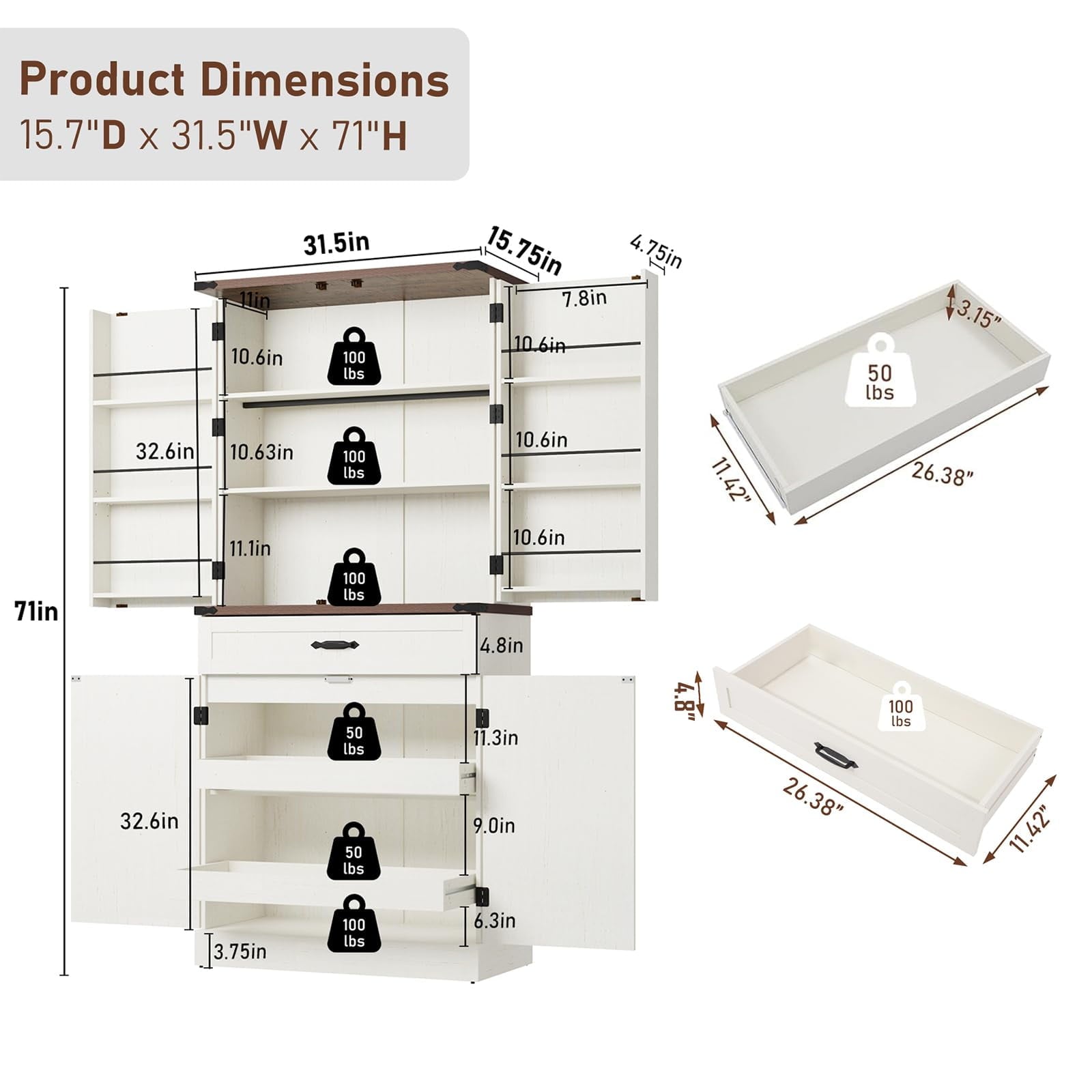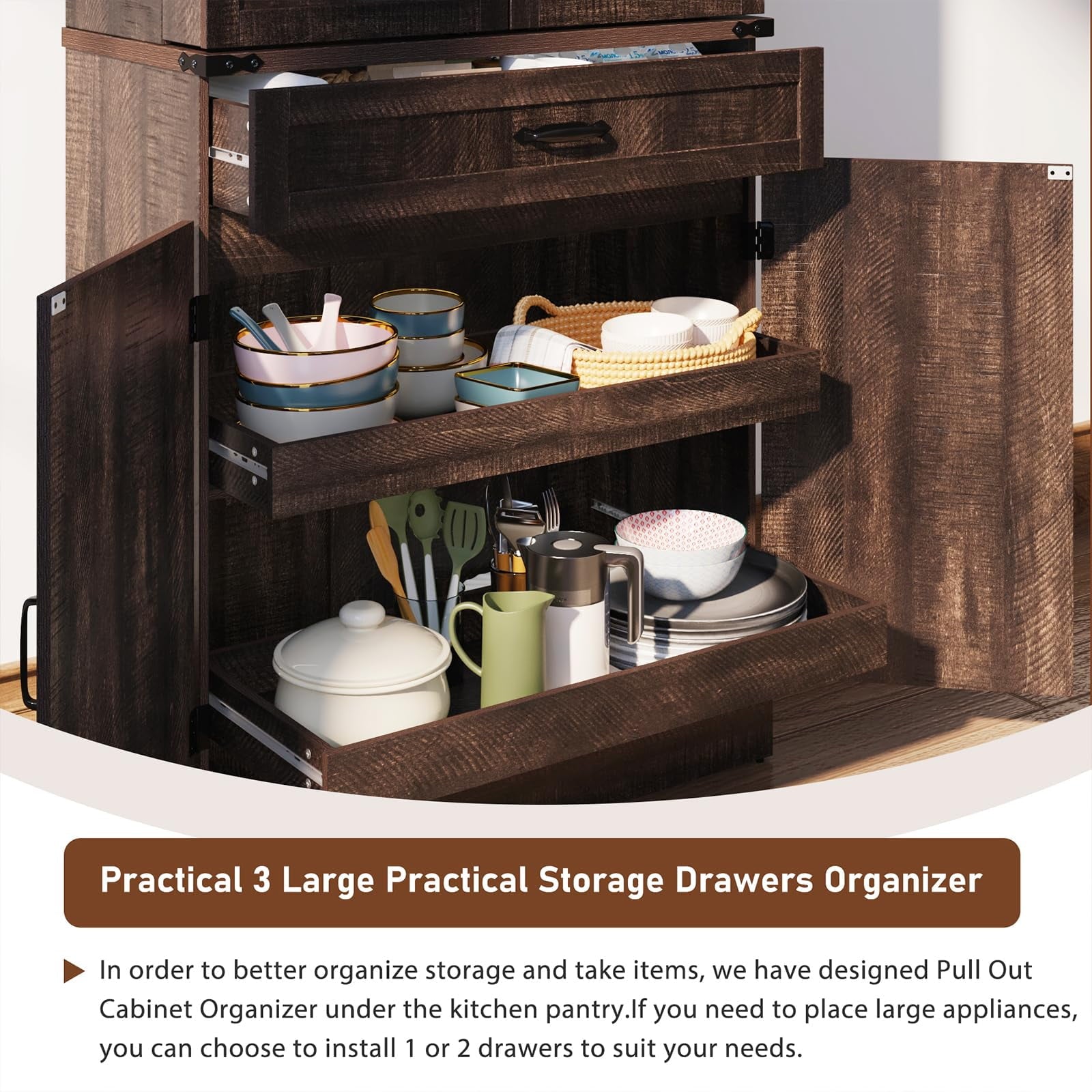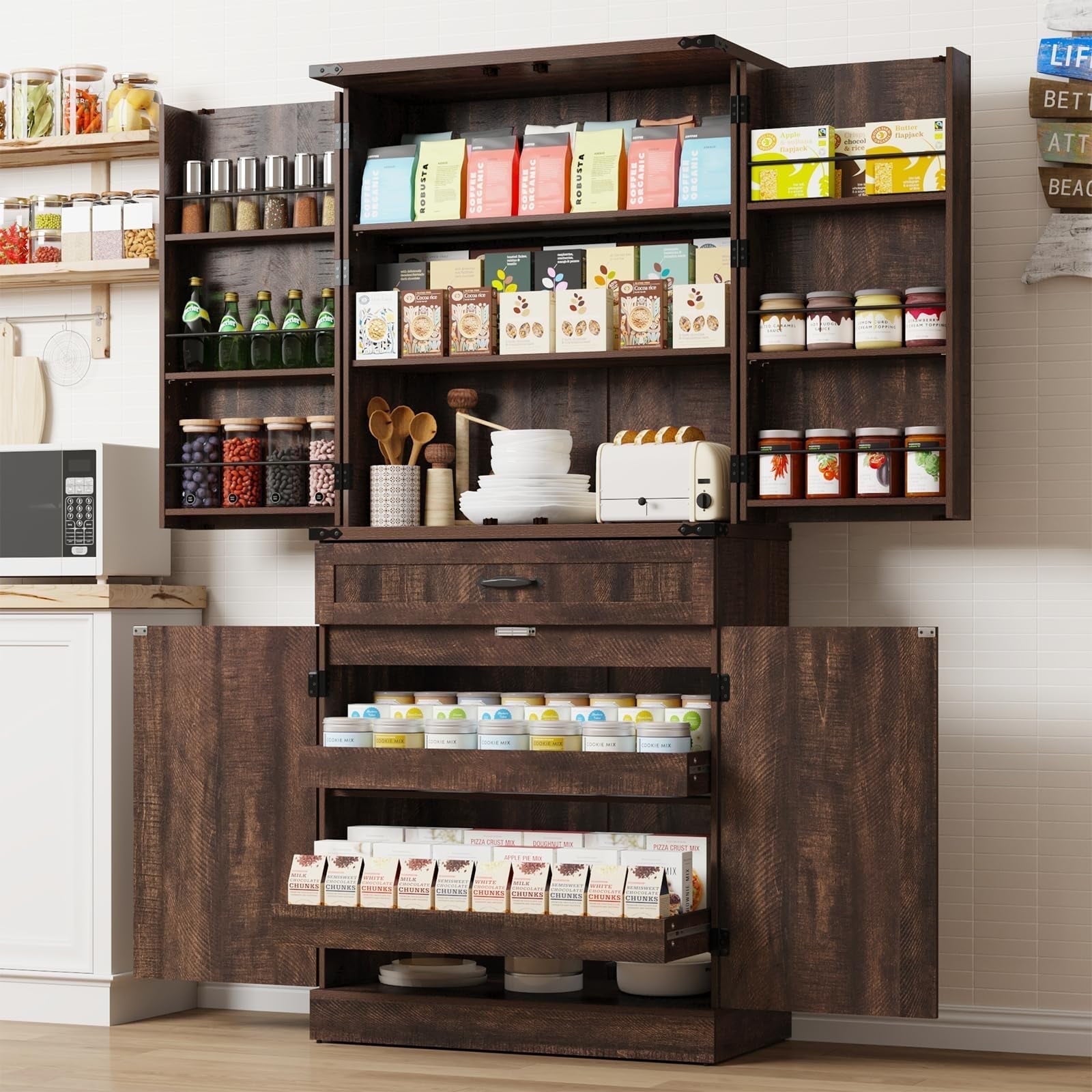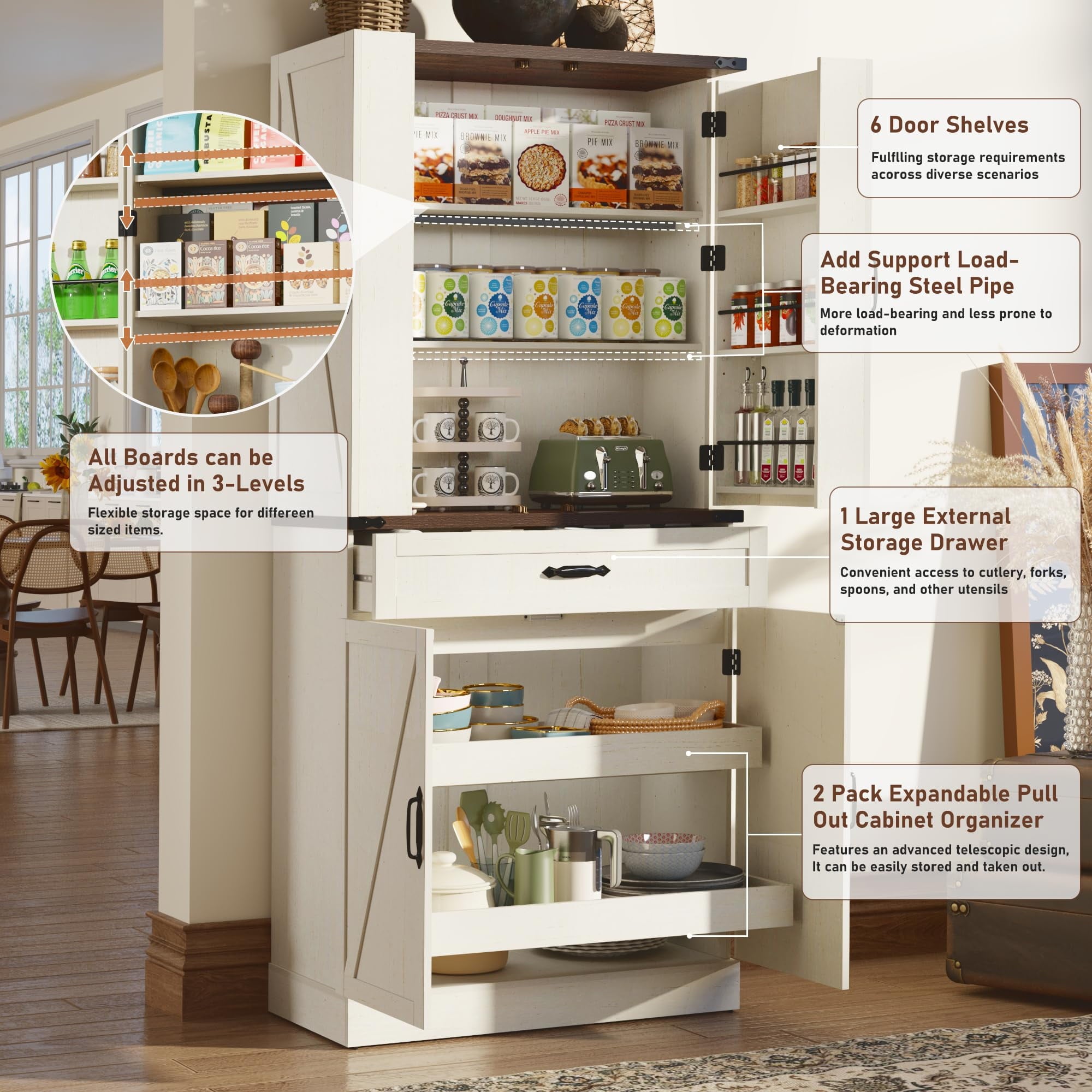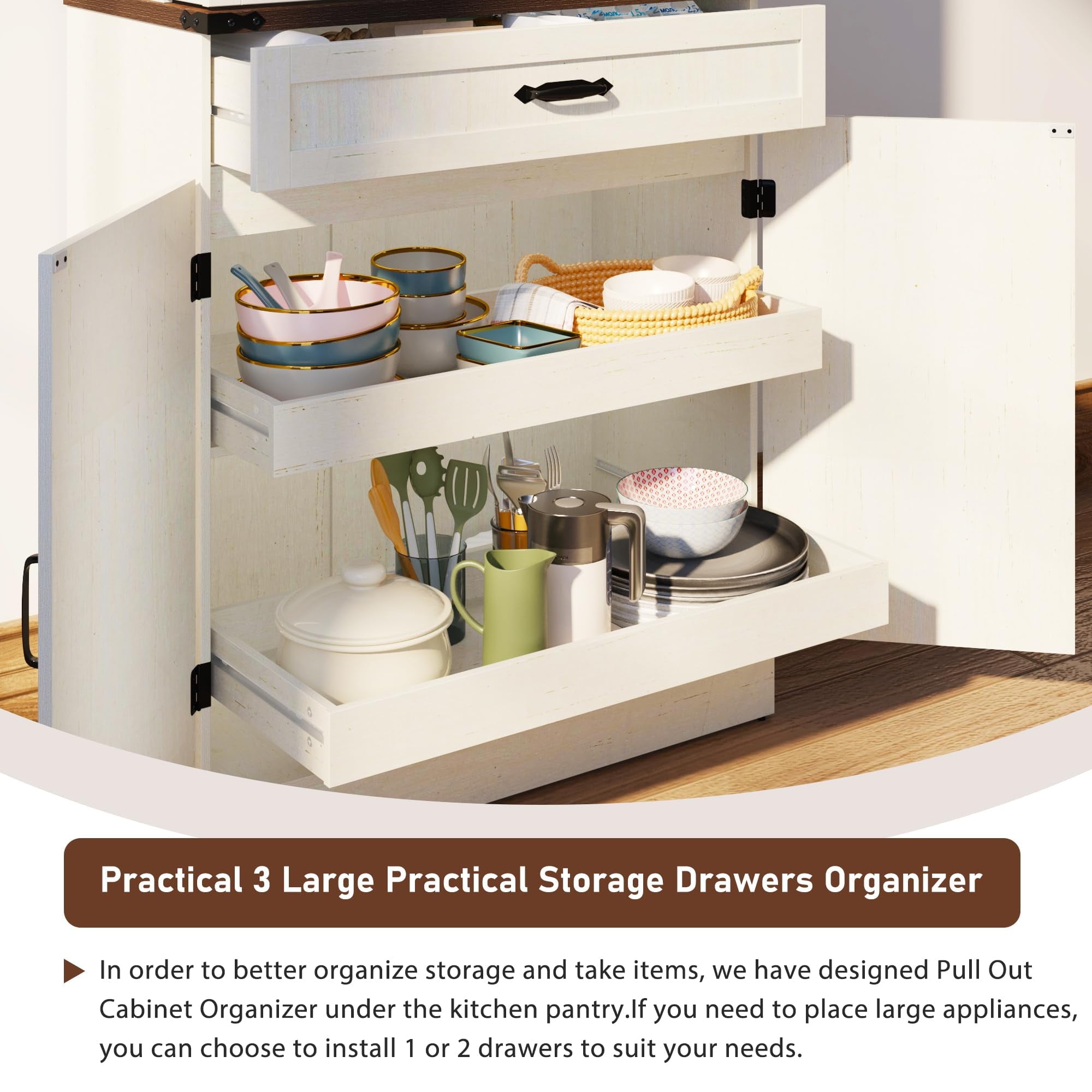 • 4、Note:Assembly and Customer Service:We provide installation instructions and Videos for the Farmhouse Storage Cabinet, and all screws and parts are numbered. Check all the accessories laying flat on the floor before assembly, then follow the instructions for quick assembly. If your kitchen pantry has any issues, do not hesitate to reach out, we are earnestly devoted to aiding you in resolving any queries.