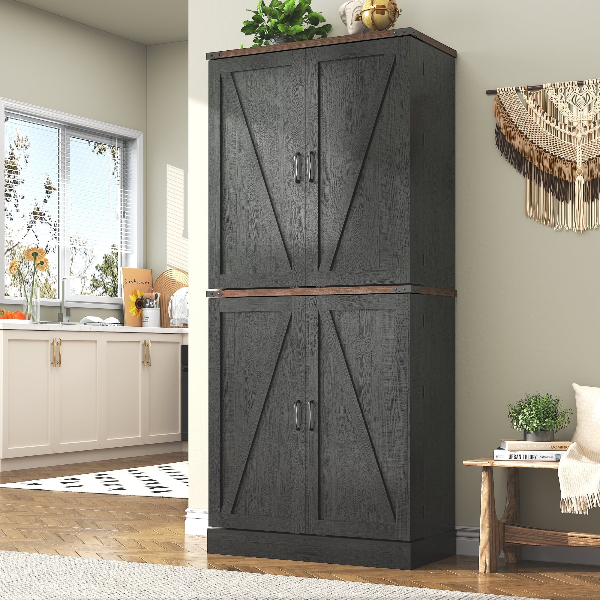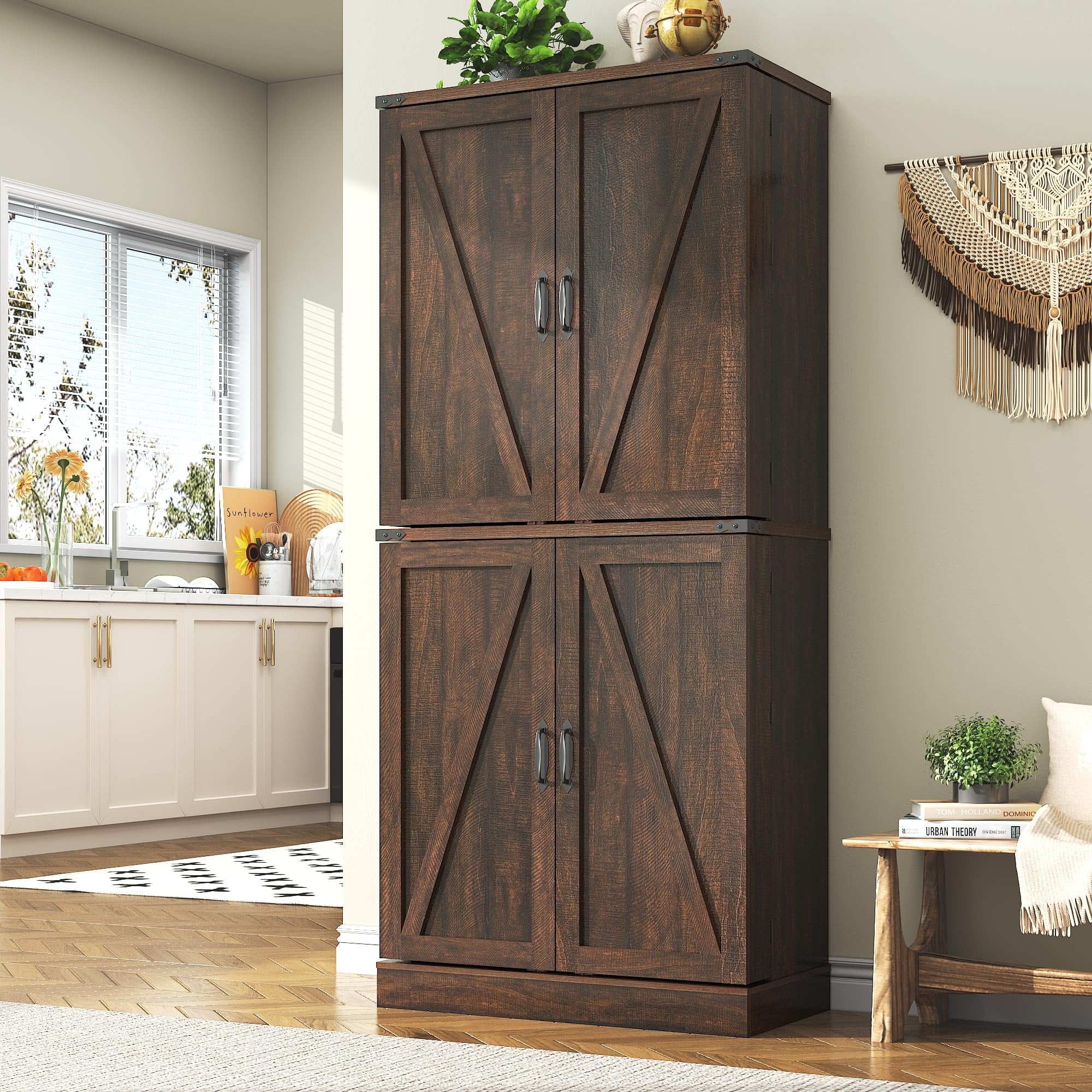 1、Blotout 71″ Tall Farmhouse Kitchen Pantry with 12 Side Shelves, 5 Layers Pantry Storage Cabinet w/Load-Bearing Steel Pipe & 4 Barn Doors/Adjustable Shelves for Kitchen, Dining Room, Living Room
