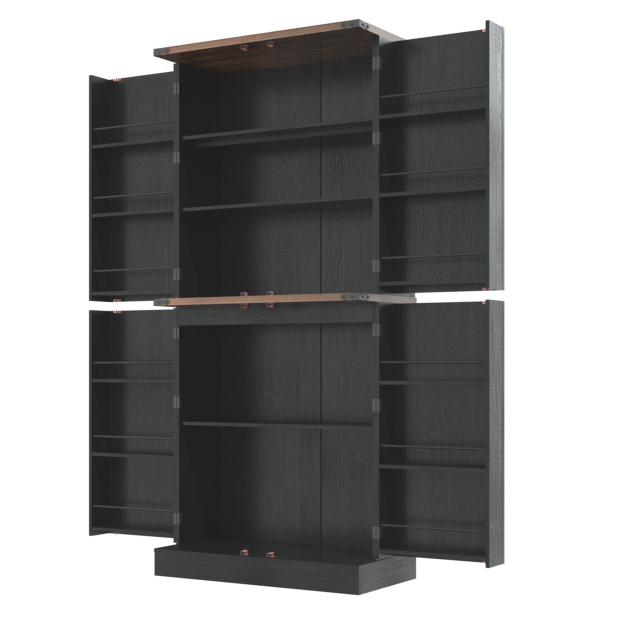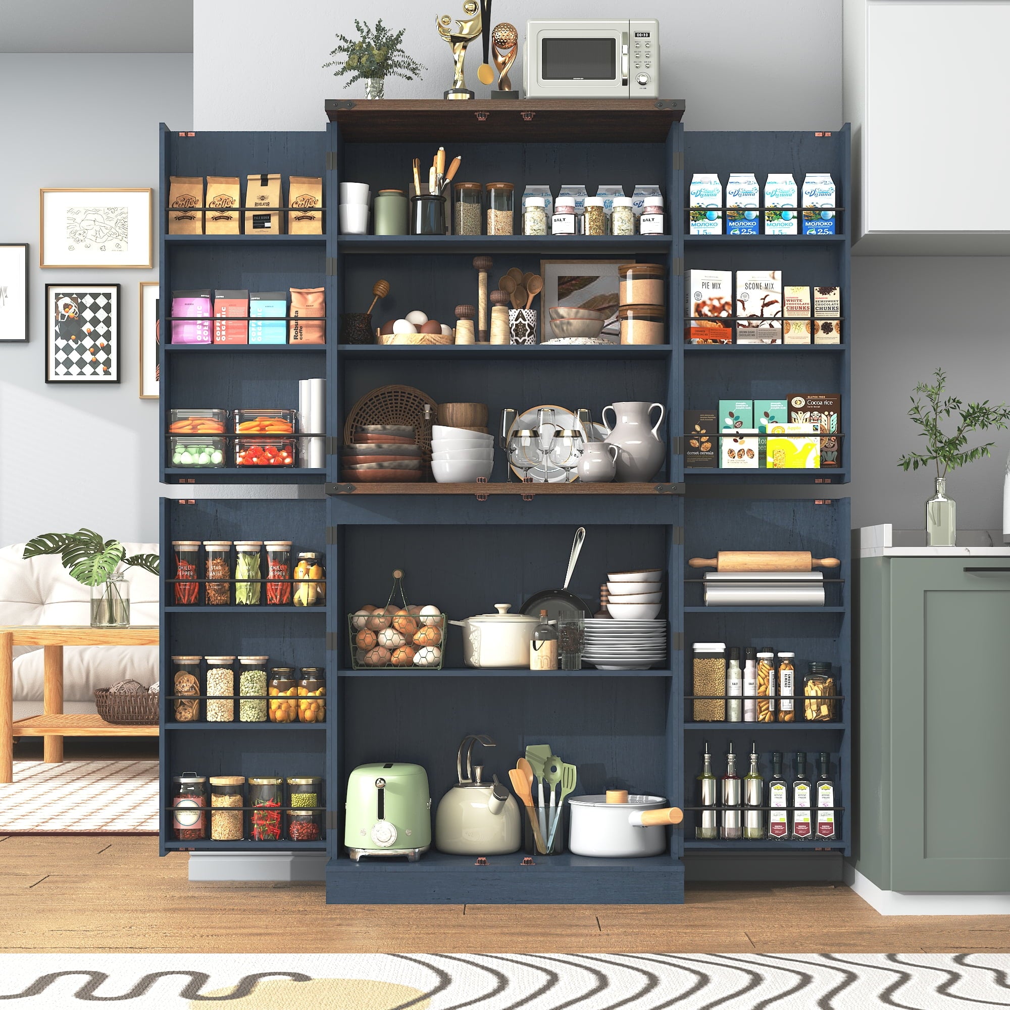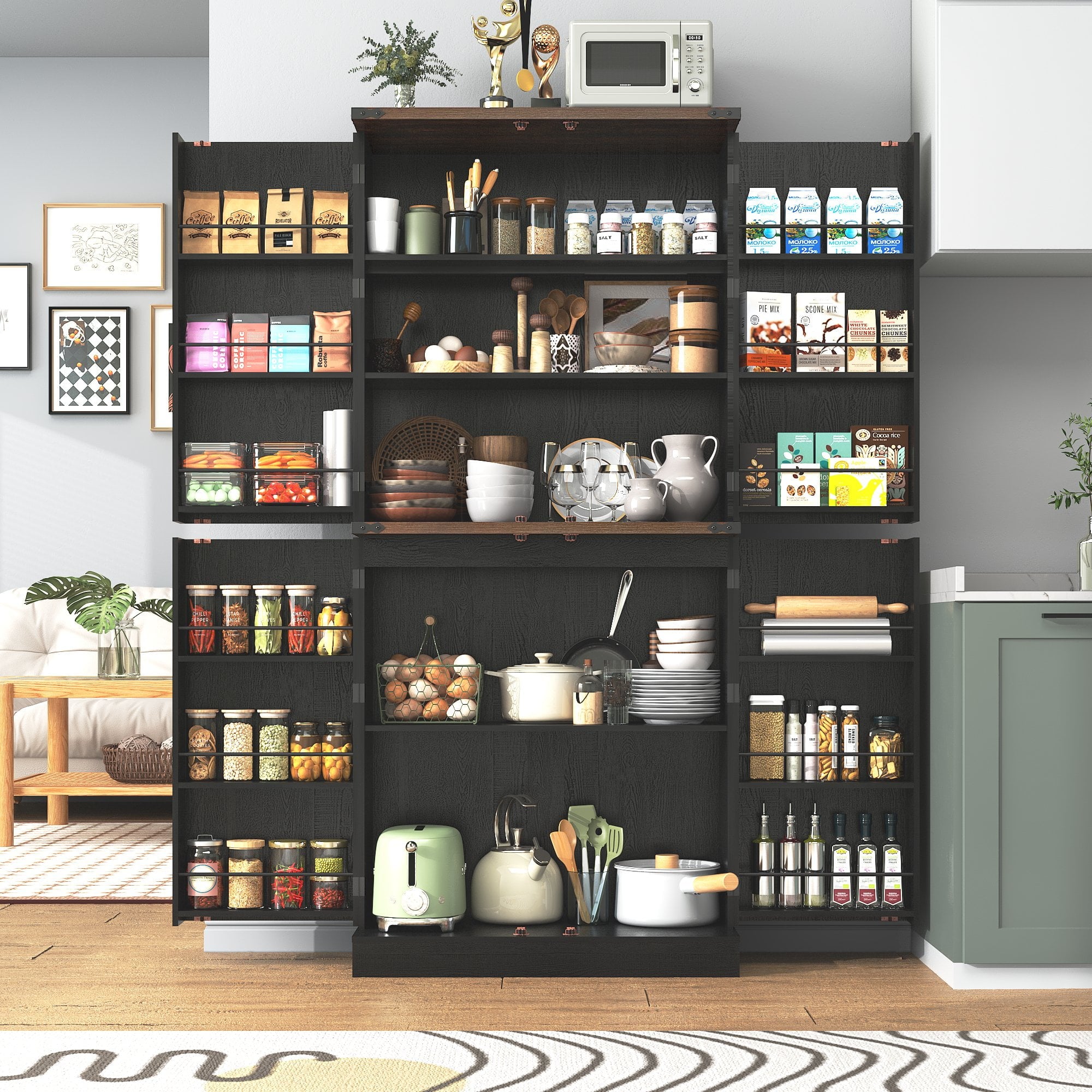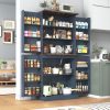 • 1、71″ Tall Farmhouse Kitchen Pantry with 12 Side Shelves, 5 Layers Pantry Storage Cabinet w/Load-Bearing Steel Pipe & 4 Barn Doors/Adjustable Shelves for Kitchen, Dining Room, Living Room