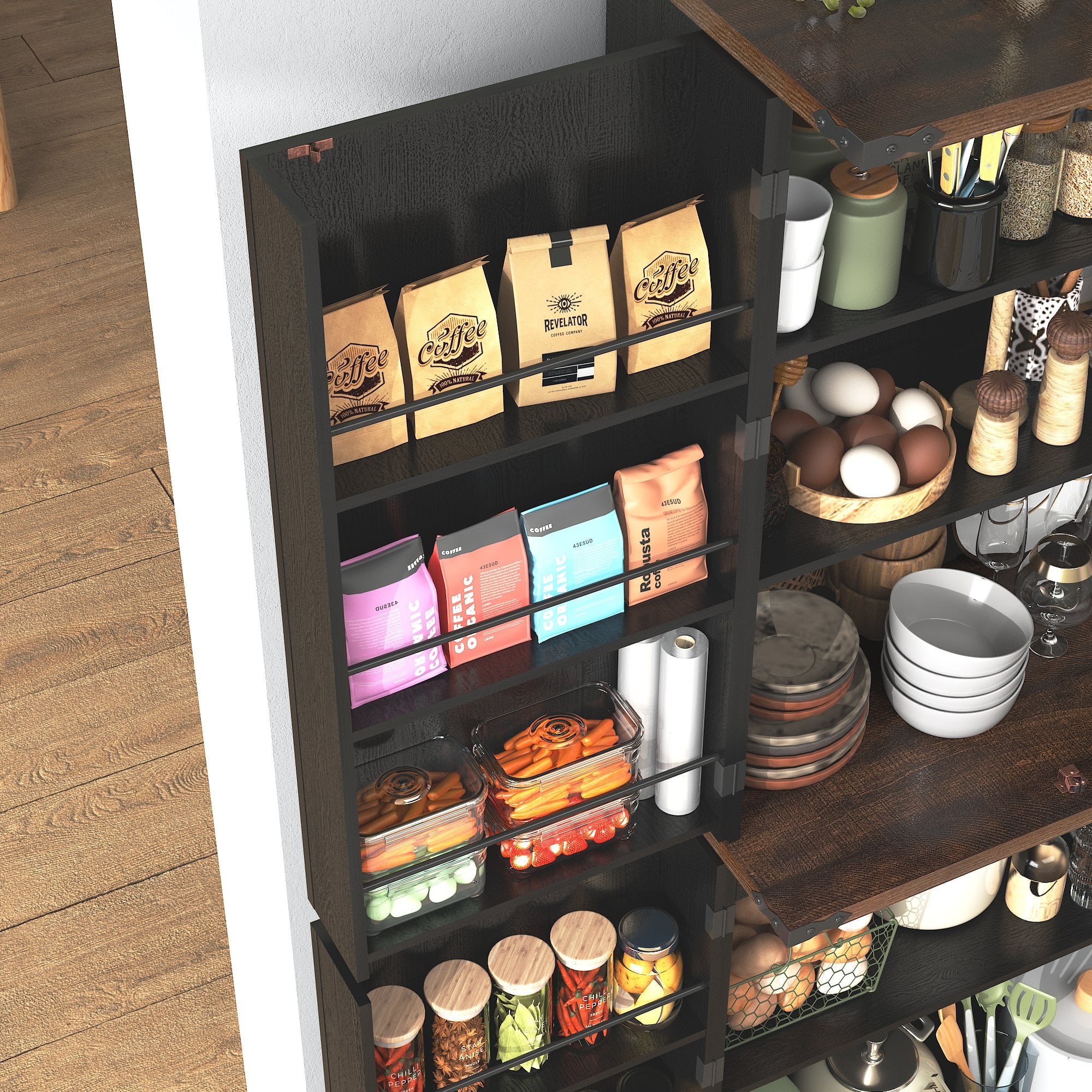 4、Versatile Use: Our multipurpose cabinet is ideal for various settings, whether you need extra storage in your kitchen, a stylish display in your dining room, or practical organization in your bathroom.