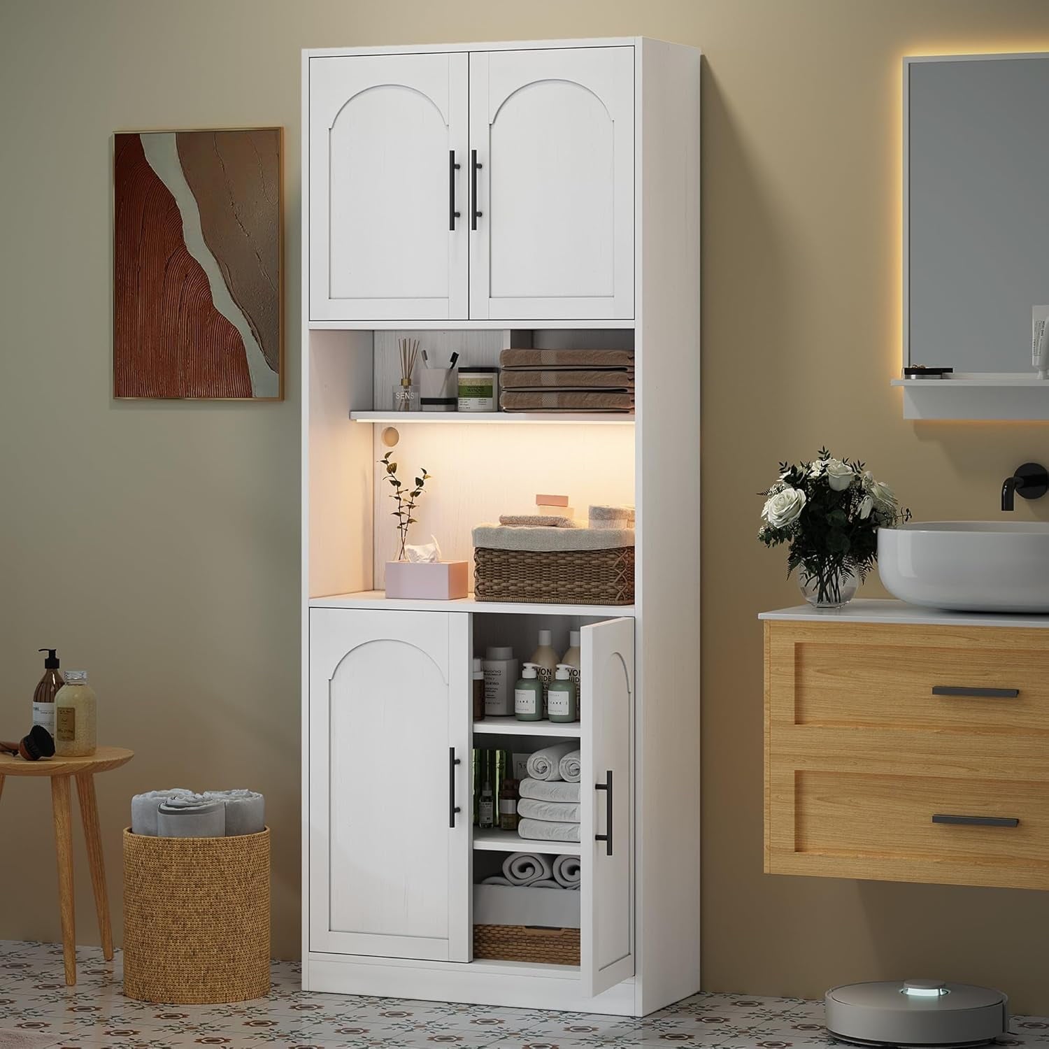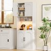 - Functionality Meets Style: This standalone pantry cabinet is an important member of modern kitchens, a storage cabinet with RGB LED lights for microwave, and it can hold many necessities. A classic choice for the modern home, the white storage cabinet brings a timeless popular color with a muted twist and adds a touch of modern sophistication to your kitchen, guaranteed to make your neighbors jealous.