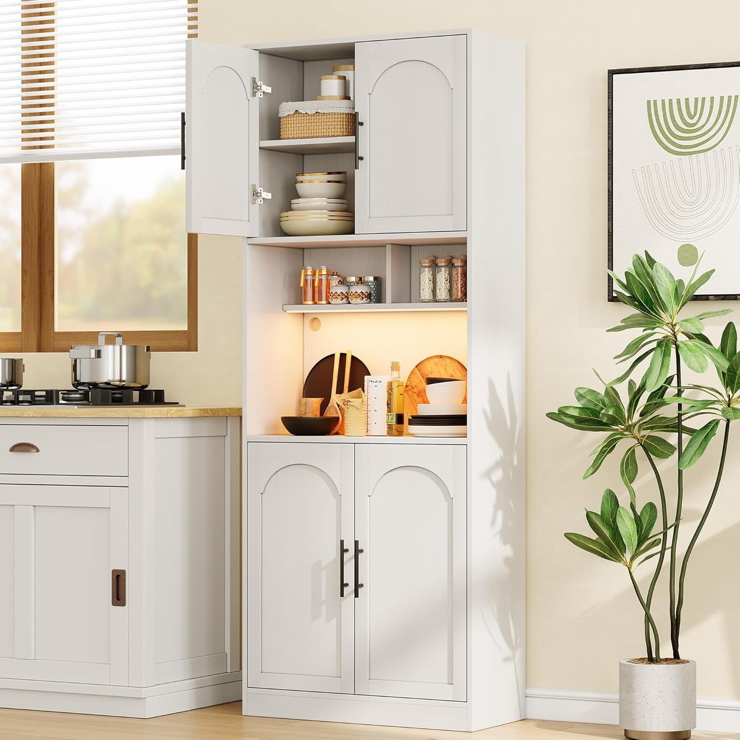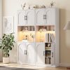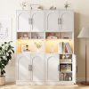 - Hutch Cabinet with Storage: Tall pantry storage cabinet with 4 doors, 2 open small cabinets, and adjustable shelves, so you get lots of storage for everything. the LED light strips that can take into account both lighting and atmosphere and can be controlled through a mobile phone APP.