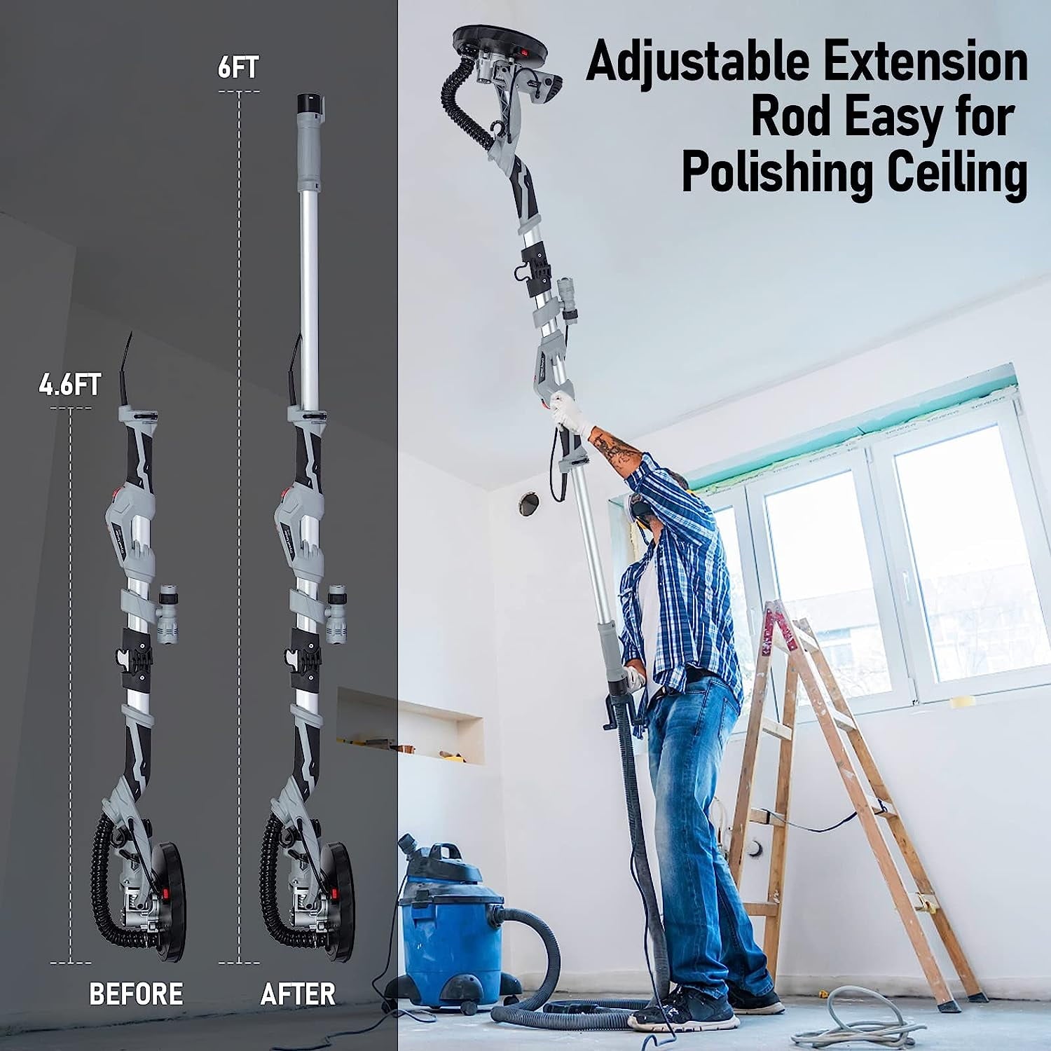 710W Drywall Sander, Electric Motor Sander with LED Flashlight, Variable Speed 800-1800RPM With Extendable & Foldable Handle, 6 Pcs Sanding Discs, Including Carrying Bag.710W ELECTRIC DRYWALL SANDER.Our Drywall Sander motor offers strong power. Speed can be adjusted from 800-1800RPM. foldable and retractable handle, vacuum cleaning system, and LED lighting. It’s ideal for grinding drywall, ceilings, interior walls, exterior walls, clearing floor residue, paint coatings and loose plaster.Meet all of your different polishing needs.Variable speed trigger and allows you to simply adjust speed anywhere from 800 to 1800 RPM.With extendable aluminum handles reach lengths up to 6-feet away