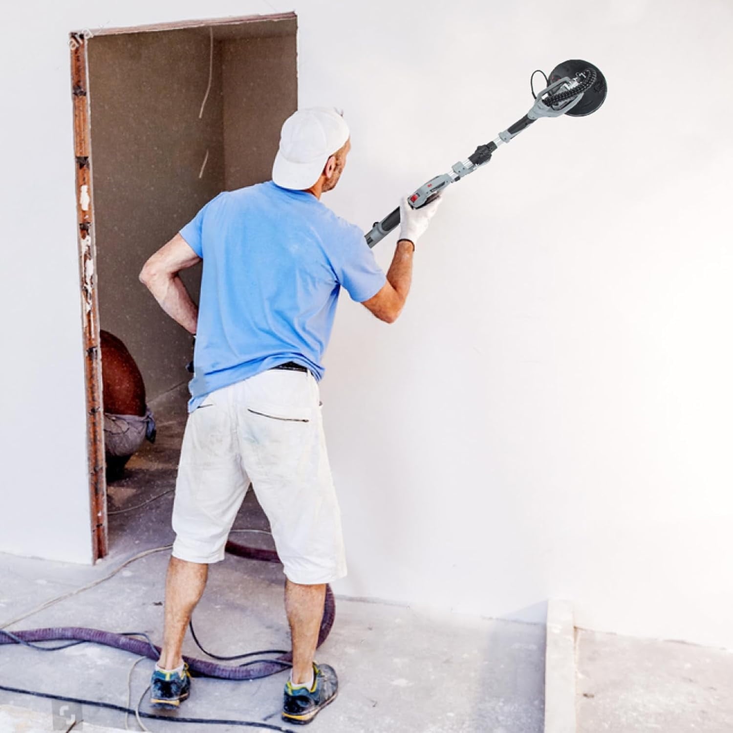 • ‌【 Powerful Performance】drywall sander is designed to meet DIYers and professionals and powered by a 710w motor that offers better performance and easy sanding, ideal for grinding drywall, popcorn walls, mudded walls, knockdown texture walls, orange peel walls.【90°Pivoting head &Folding Handle】With a 90° pivoting head that swivels in all directions, the Pioneerworks drywall sander automatically adjusts to be flush against every surface that crosses its path. Extensible handle in length from 4.6 foot to 6 foot is suitable for various height work spaces.And the foldable design allows easily for storage and transportation.【Easy to Operate】Adopts a variable speed trigger and just slide switch to change the speed,you could simply adjust the speed from 800 to 1700 RPM. This drywall sander equipped with 6 pcs combination-grit sanding discs can meet your kinds of grinding needs. Detachable sander base designs easily for sanding ceiling corner and wall right-angle. The spotlight make this drywall sander suitable for dark workplaces.【Vacuum Capacity】Combined with a 6.6ft dust hose, please use it with a vacuum cleaner, the hose is fully compatible with most of the vacuum cleaners on the market. the perfect dust collection effect provides a dust-free work, prevents you from inhaling a lot of dust, and create a healthy working environment for you.【PACKAGE CONTENTS】1 x drywall sander, 6 x sandpapers (60/80/120/150/180/240), 1 x user manual, 1 x 6.6ft dust hose,1 x carrying bag,1 x dual hook tension spring, 2 x carbon brushes, 2 x gaskets