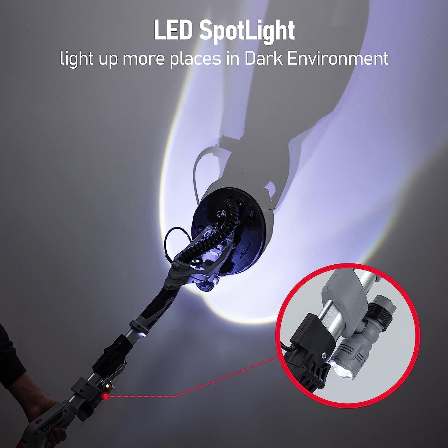 Etachable sander base designs easily for sanding ceiling corner and wall right-angle.Hook tension spring can fix the head of the sander .Just align the holes on the base with the holes on the disc.We send 6pcs sandpapers.Spotlight make this drywall sander suitable for dark workplaces.A 90° pivoting head that swivels in all directions.
