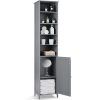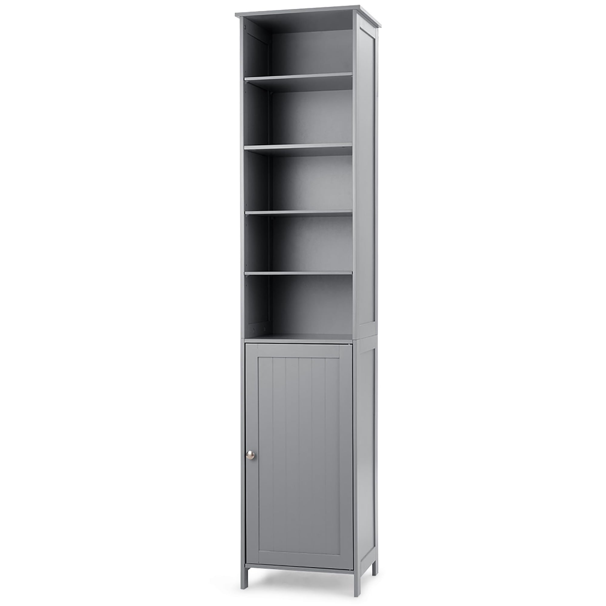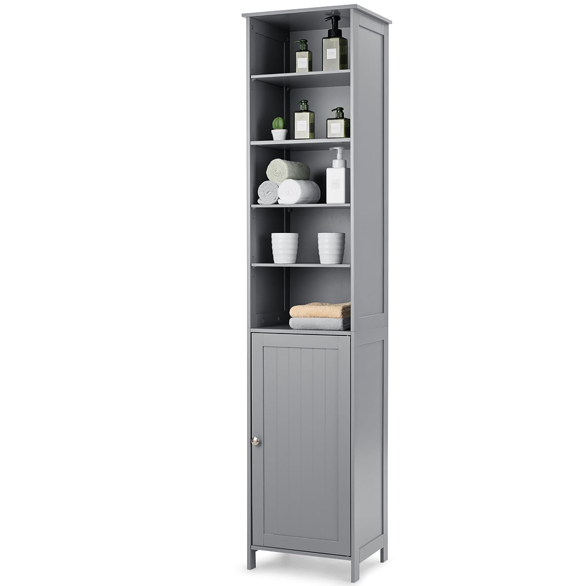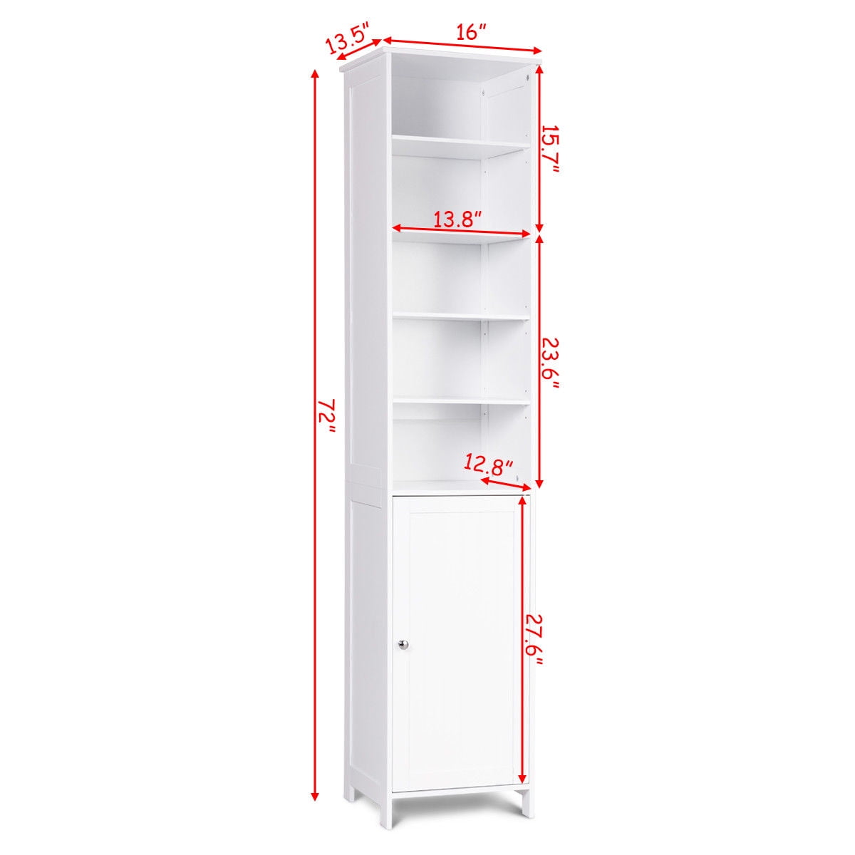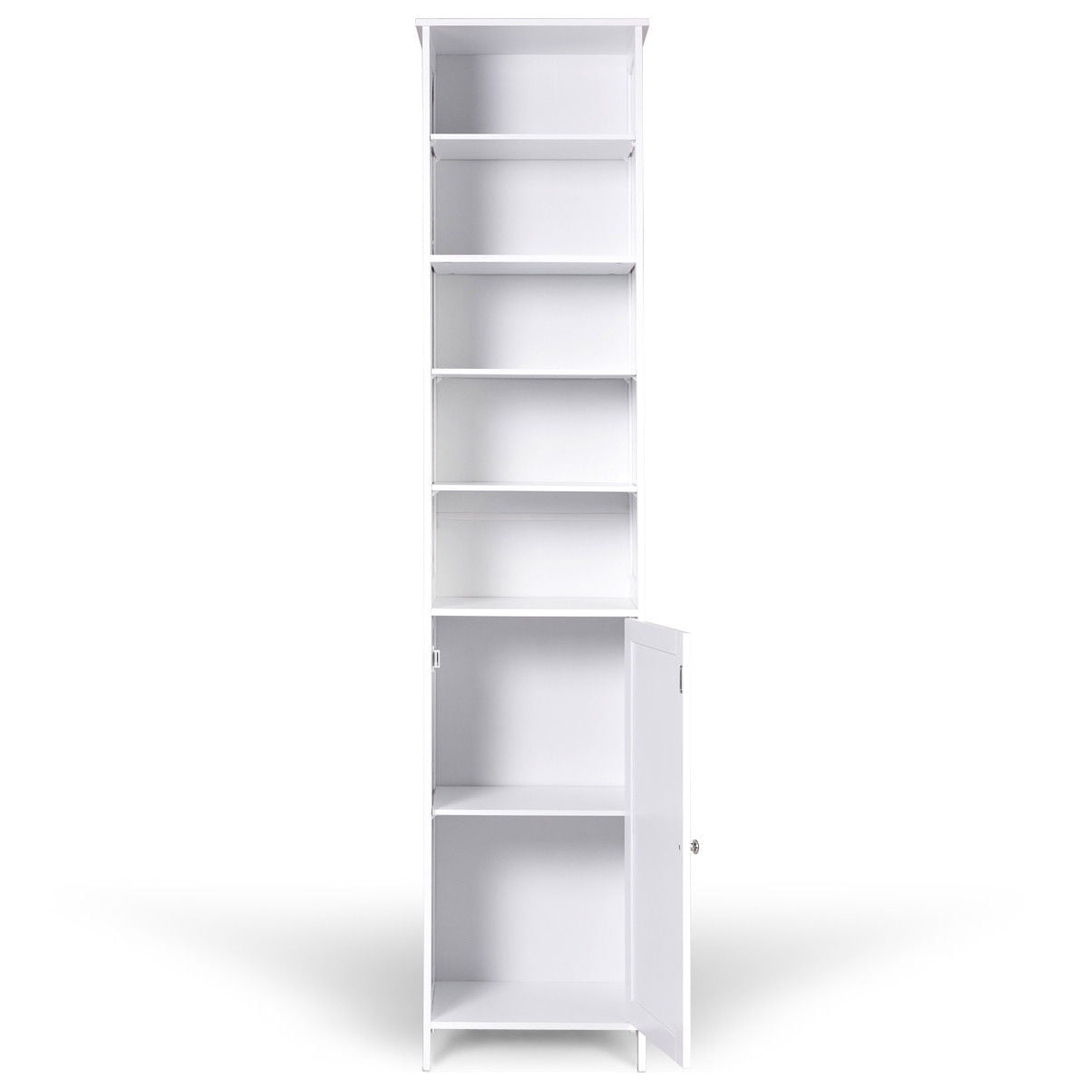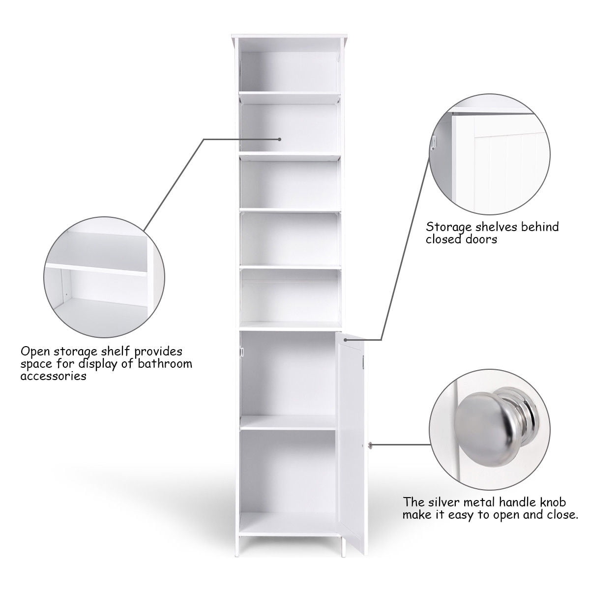 This is our new and high quality bathroom high cabinet which provides the perfect solution to your storage problems. The bathroom cabinet offers large storage capacity in a compact space so it can help you save space. It is ideal for bathroom, hallways, kitchens and beyond. Equipped with 5-shelf provide plenty of room to storage your items and a door with silver metal handle knob can keep your personal item safe. What’s more, it has movable shelves so that you can adjust the distance between layers according to your needs and the anti-dumping design can protect your safety.