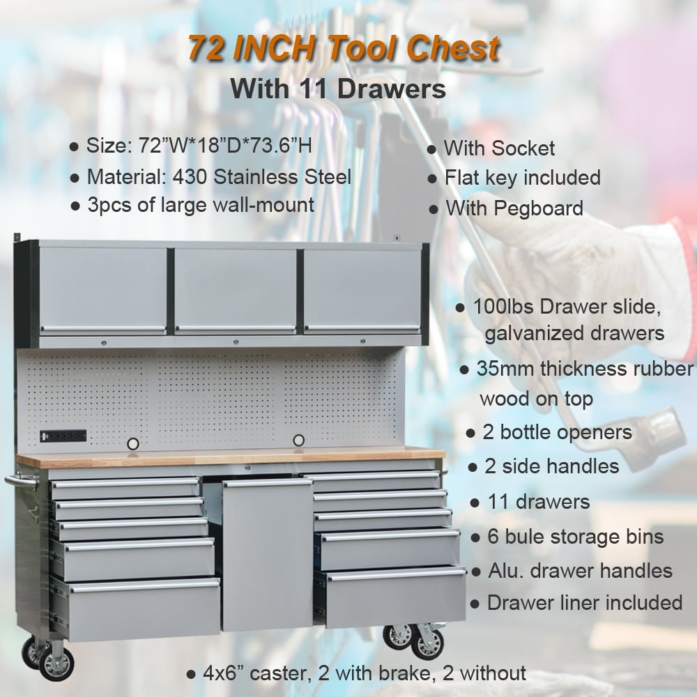 - [Formidable Storage Capacity] – Optimize your workspace with our 72-Inch Tool Chest, a pinnacle of organization. Boasting 11 drawers, 3 upper cabinets, a pegboard and 6 blue storage bins, it ensures seamless access to your tools. Embrace efficiency with our 72-Inch Tool Chest – say goodbye to the frustration of misplaced tools during critical moments.