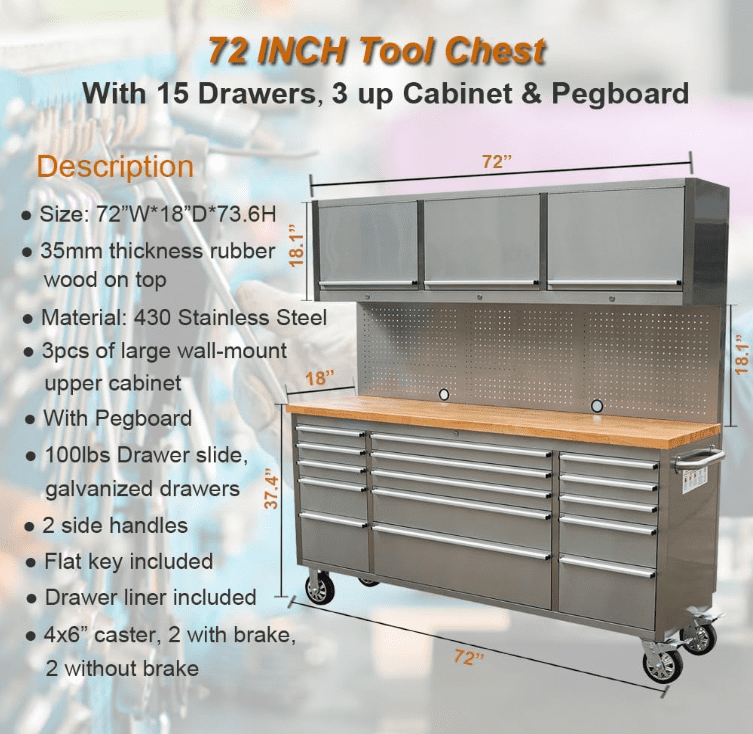 - [Durable Stainless Steel Construction] – Our tool box is made of 430 anti-fingerprint steel ensures both strength and longevity, complemented by the 1.38-inch thickness rubber wood top. This rubber wood surface provides a comfortable working area, adding a functional touch to your workspace. Enhance your workspace with a tool chest crafted from premium stainless steel. Choose a tool chest that combines durability and comfort for an enduring organizational solution.