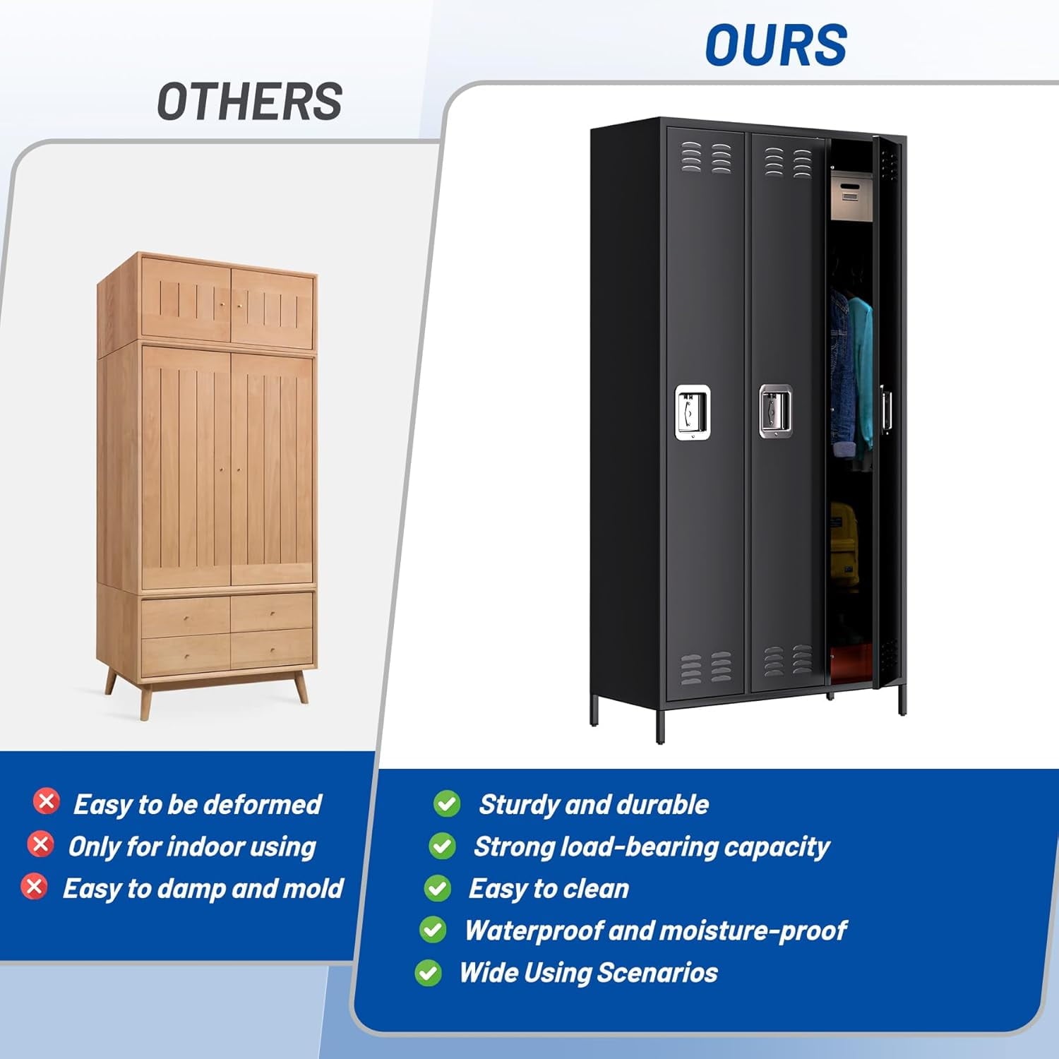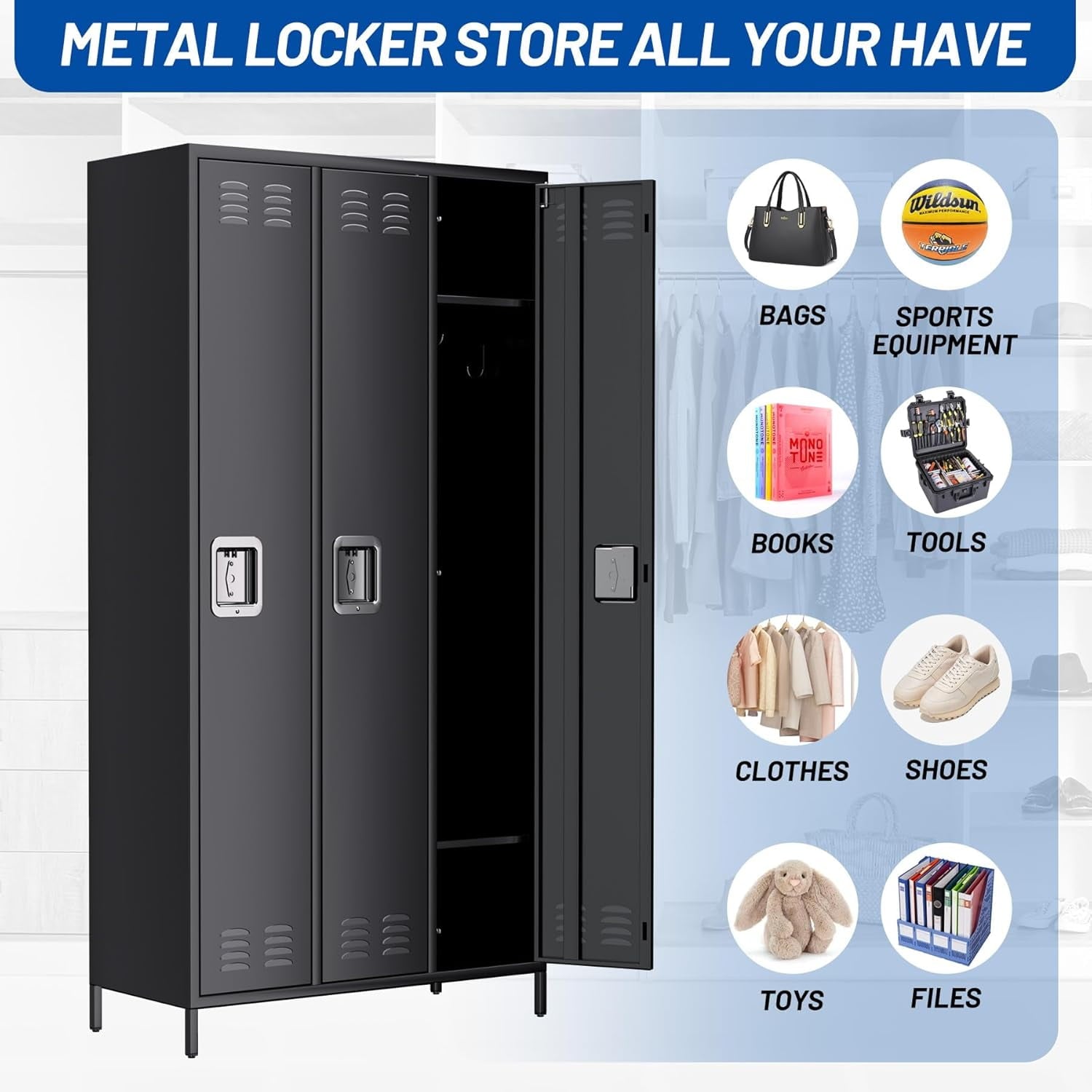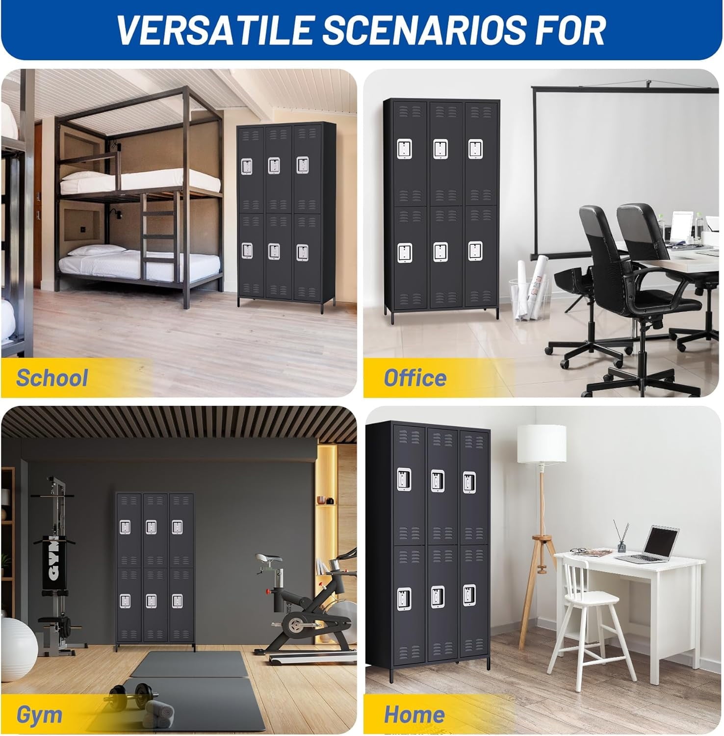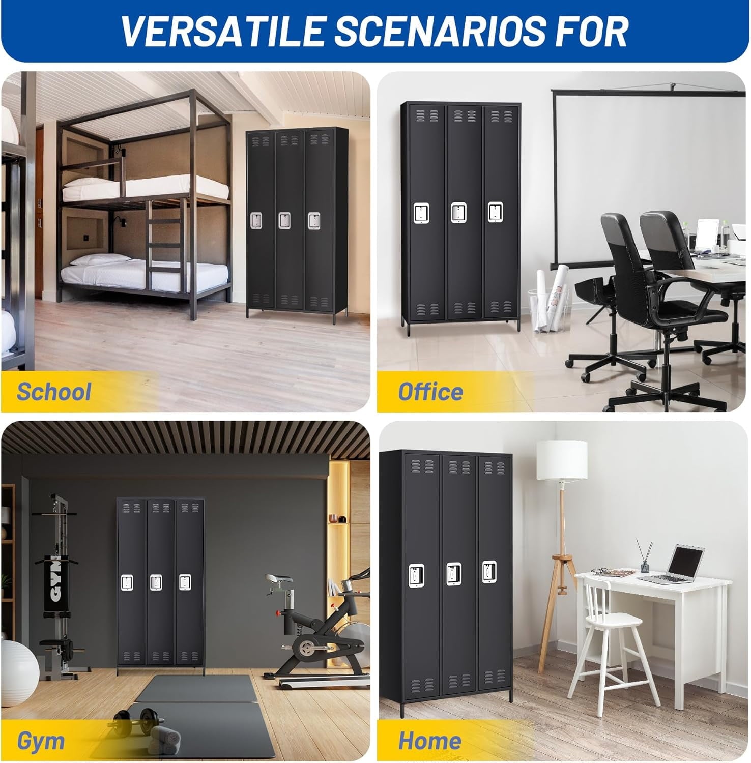 - 【Versatile Application】Ideal for home, office, gym, school, dormitories, and garages, offering secure storage for clothes, shoes, sports equipment, and supplies.