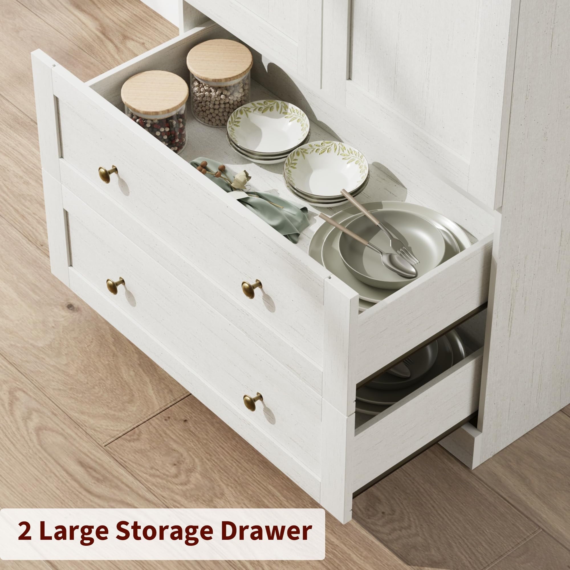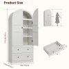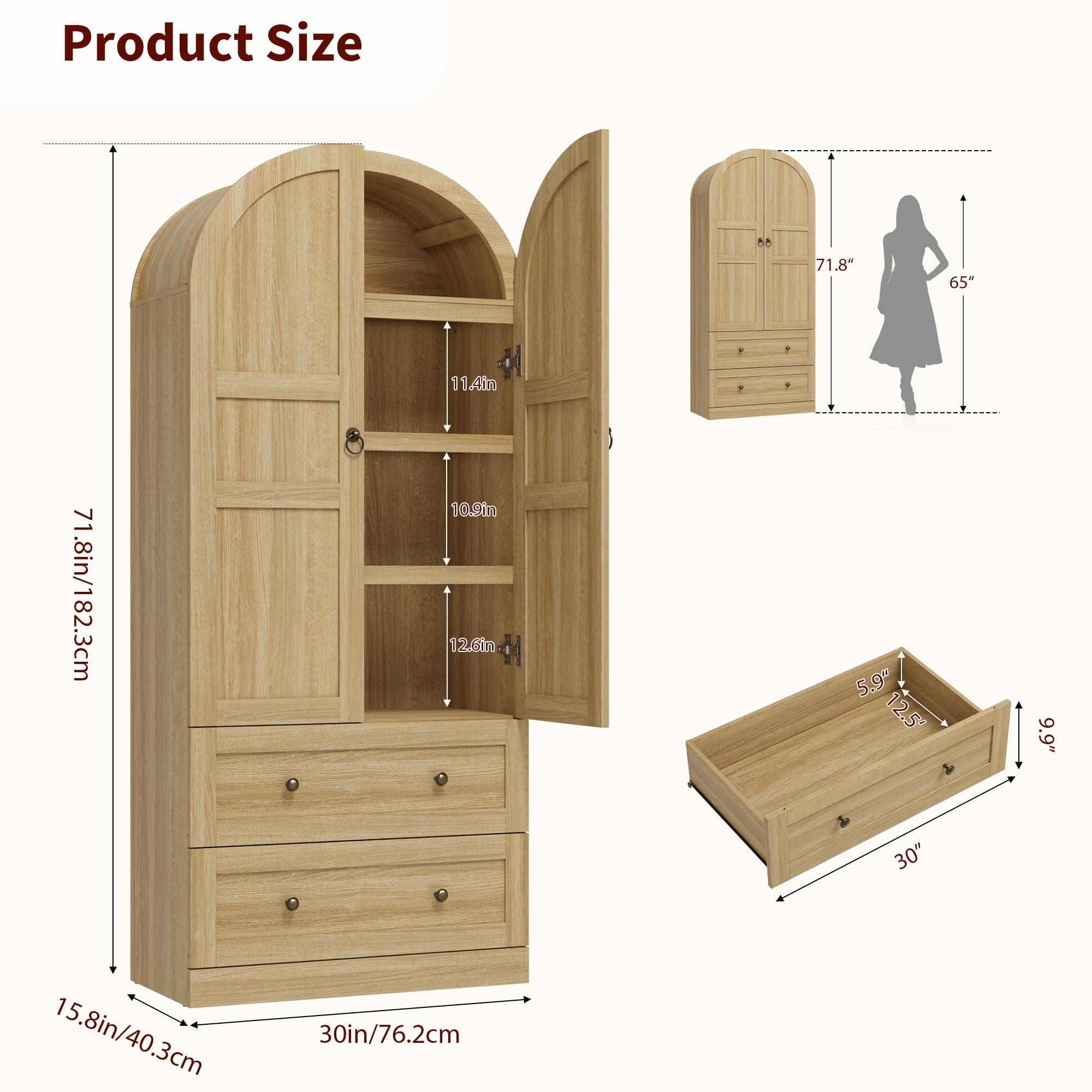 - Generous Storage Self with 2 Large Drawer :Standing at 71.8″H x 30″ W x 15.8″D, this arched pantry cabinet makes the most of your available space. 3 shelves with 4 storage divided spaces offer flexible storage; 2 larger drawers (30″L*12.5″ W*5.9″ H), more space for storage like spices, ideal for pantry essentials, small kitchen gadgets, or decorative accents to suit your lifestyle. Easily customize the layout to accommodate a variety of items, keeping your space tidy and functional