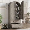 - Farmhouse Arched Pantry with Glass Door: This modern farmhouse-style kitchen pantry storage cabinet boasts a graceful arched silhouette and sophisticated glass-front doors, blending timeless charm with contemporary design. Featuring two generously sized drawers and three shelves, it keeps pantry staples neatly organized while offering convenient access. The transparent doors create an elegant showcase for your stored items, delivering both visual appeal and exceptional functionality