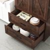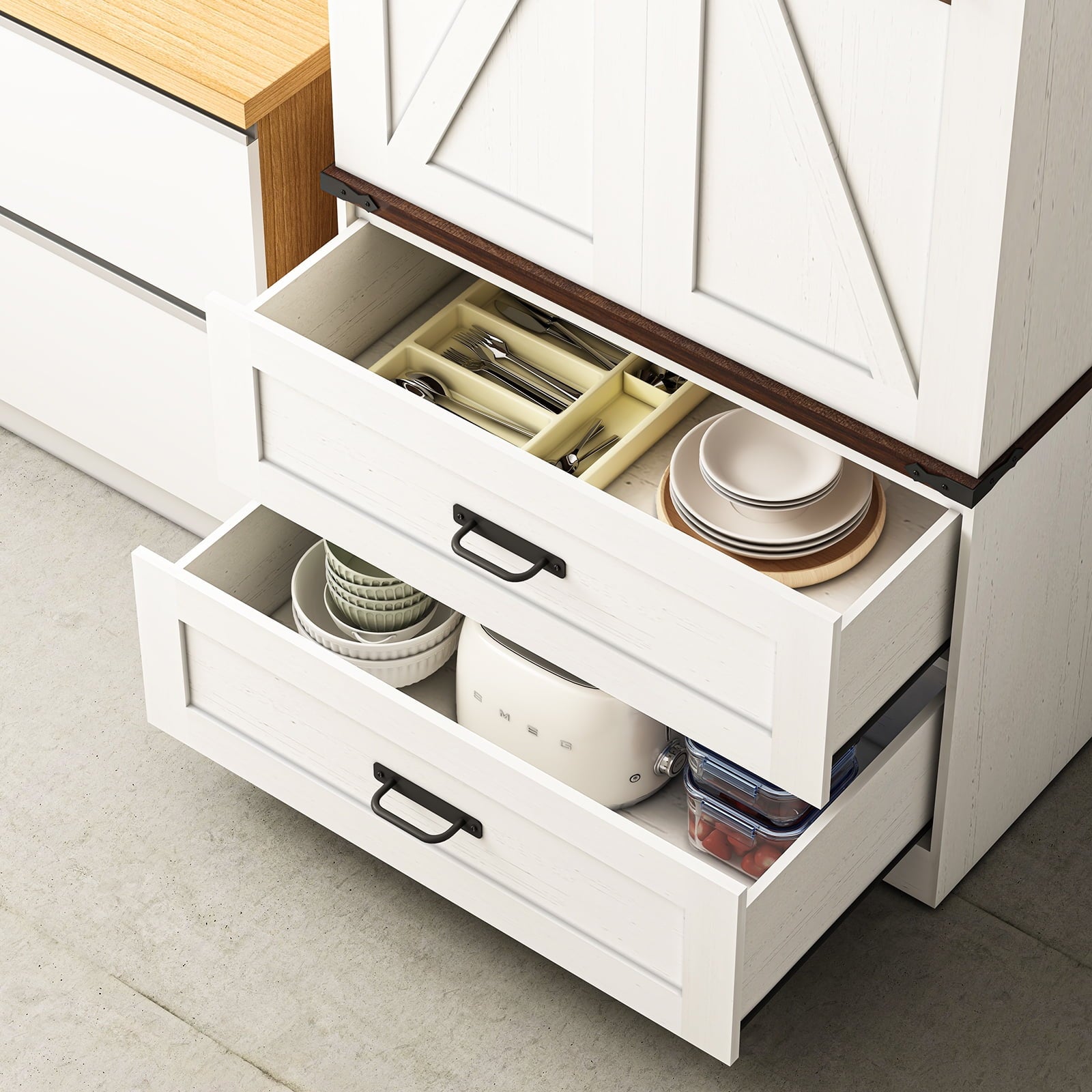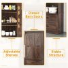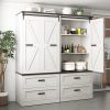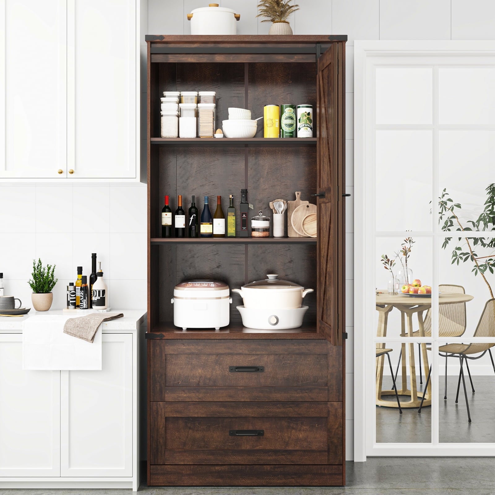 Modern Farmhouse Charm — Our tall kitchen cabinet features a sleek rectangular silhouette with 2 classic barn doors. The rustic wood texture finish, accompanied by the touch of black metal accents, masterfully fuses modern rustic aesthetics with the warmth of vintage farmhouse charm. It effortlessly breathes personality and grace into your kitchen or dining room, seamlessly complementing any furniture and decor style you embrace.
