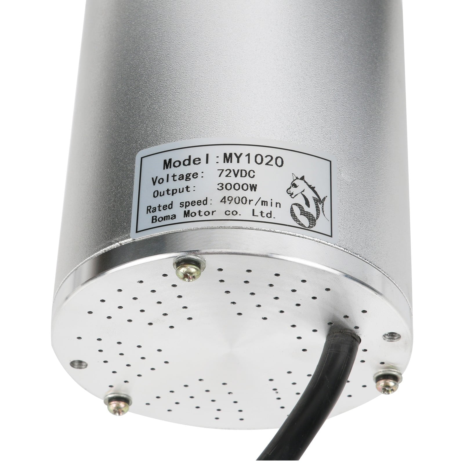 - Fundamental Parameters: This brushless electric motor is powerful and efficient. Model: MY1020D, Input Voltage: 72V DC, Output Power: 3000W, Rated Current: ≤ 43A, Rated Speed: 4900 RPM, Maximum Speed: 6500 RPM, Sprocket: T8F-11 Teeth, Horsepower: 4.07 HP, Rated Torque: 849.67 oz.in / 6 N.m, Maximum Current: 65A, No-load Current: ≤ 4.0A, Peak Efficiency:≥ 85%, Working Temperature: < 120 °C / 248 ℉.