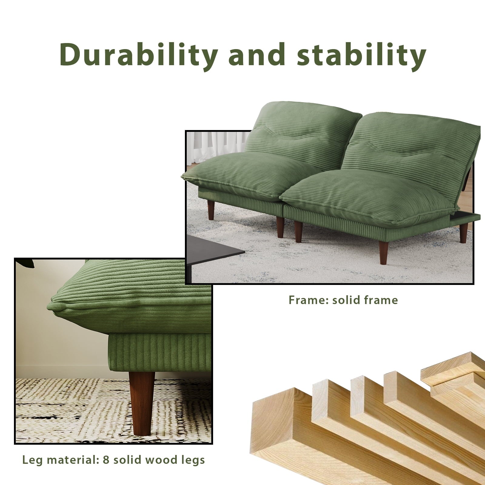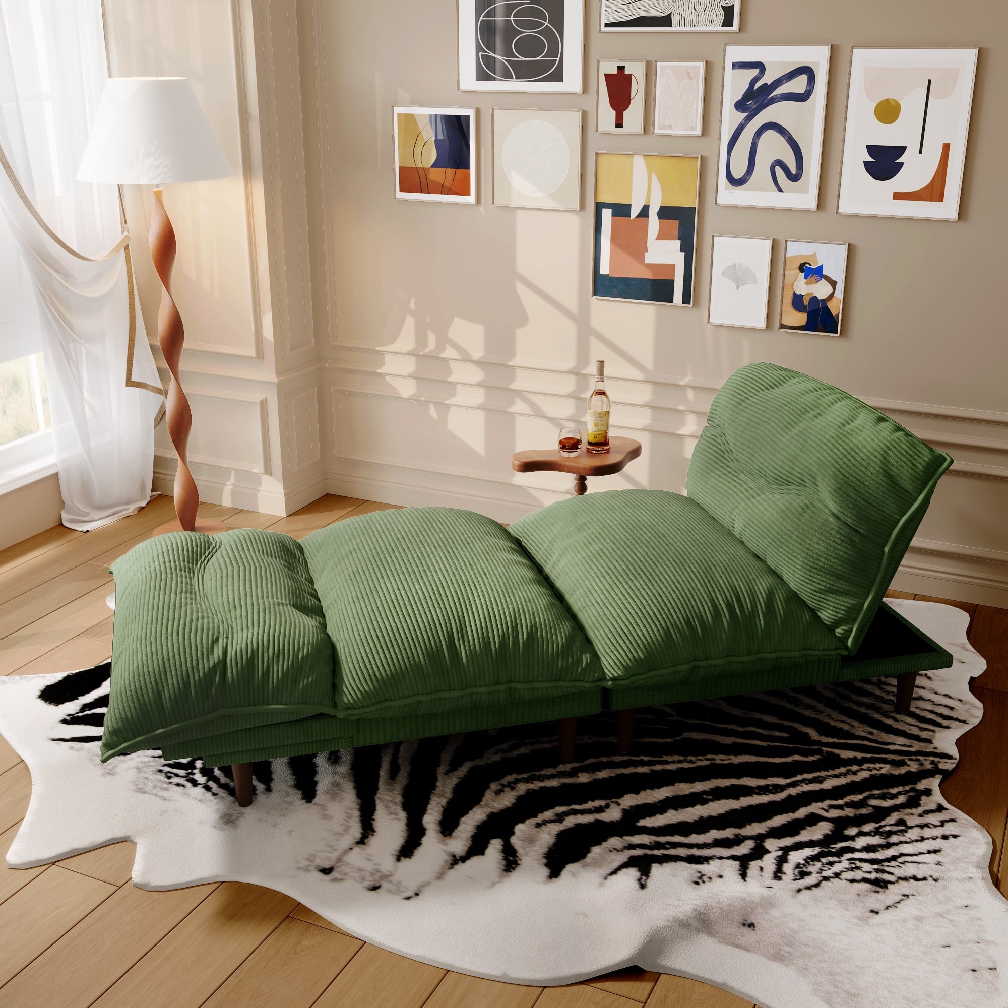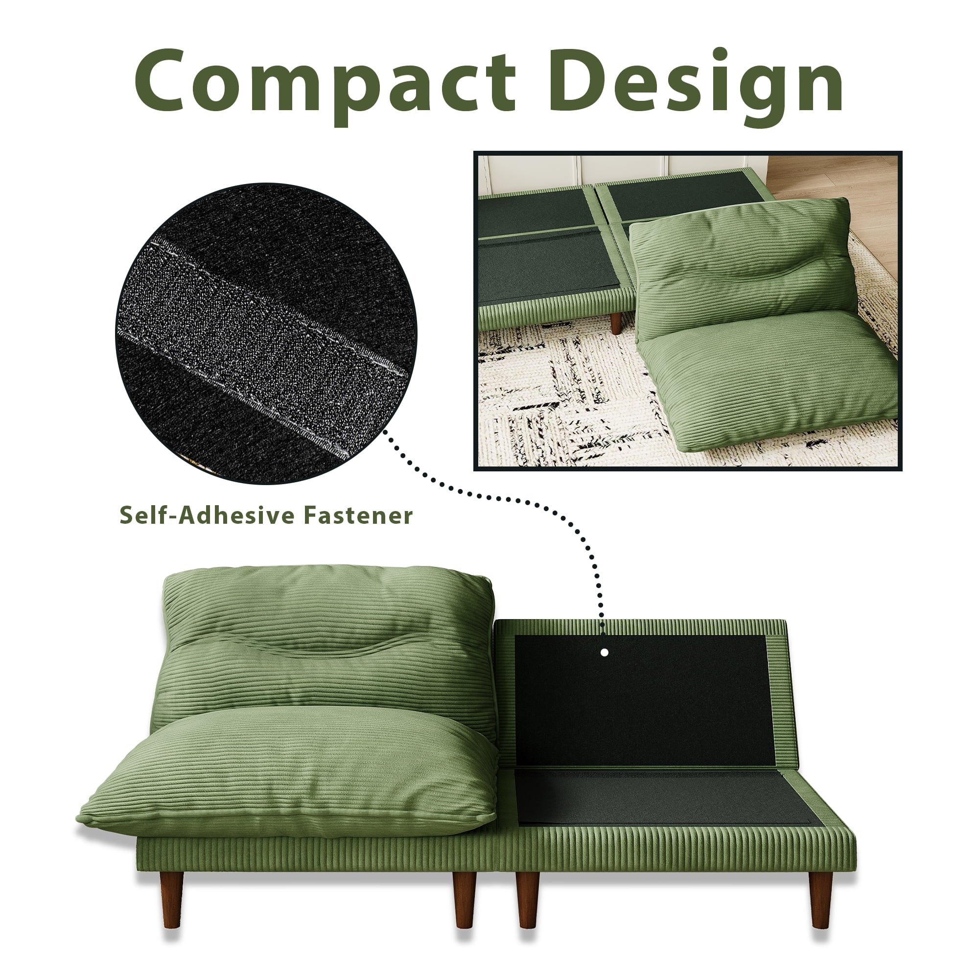 75″ 4-in-1 Corduroy Futon Couch – Convertible to Lounger, Tatami & 2 Chairs, 3-Angle Adjustable Backrest, Solid Wood Frame, 300 LBS Capacity,Green