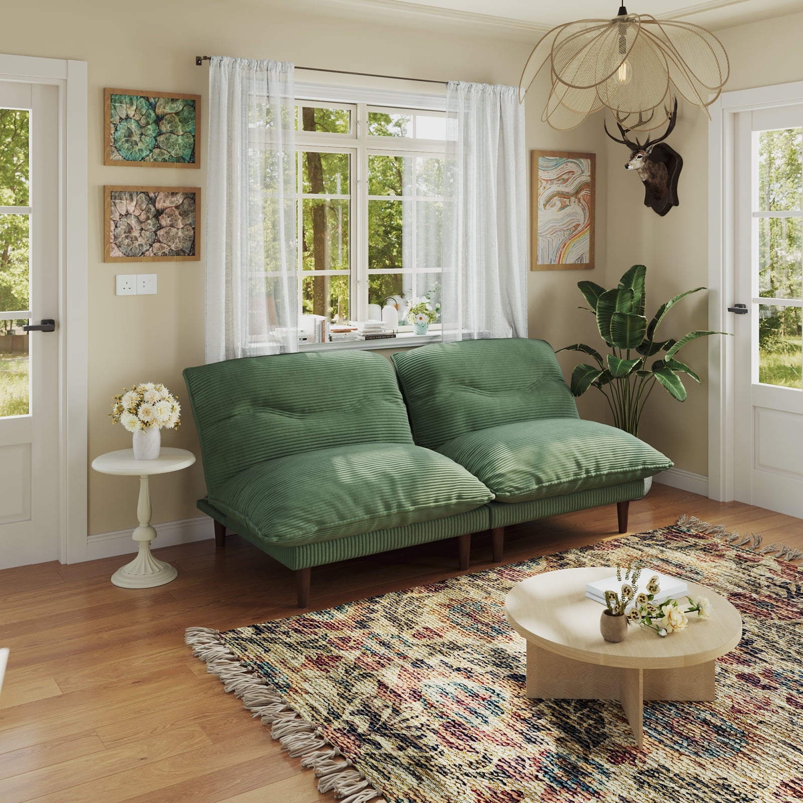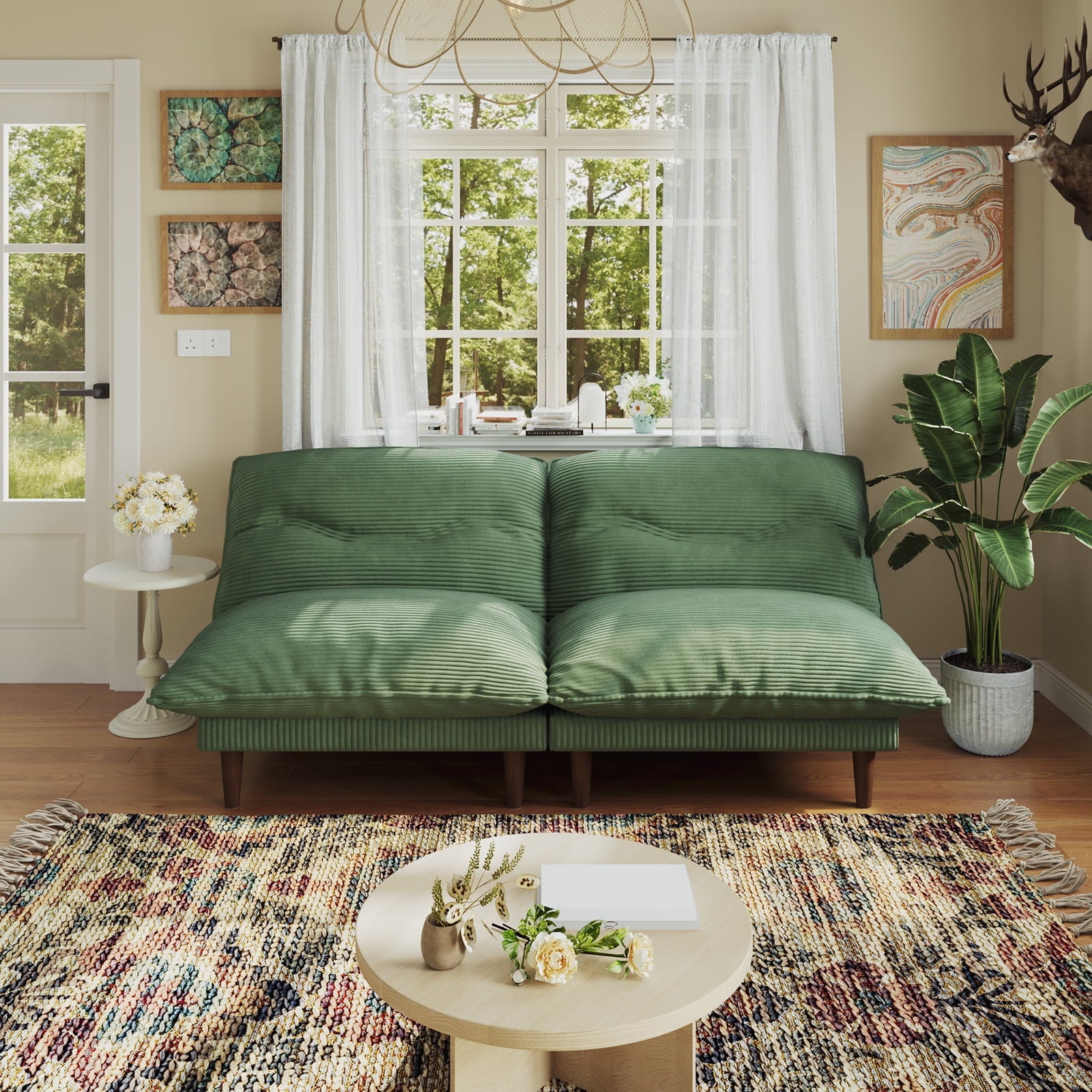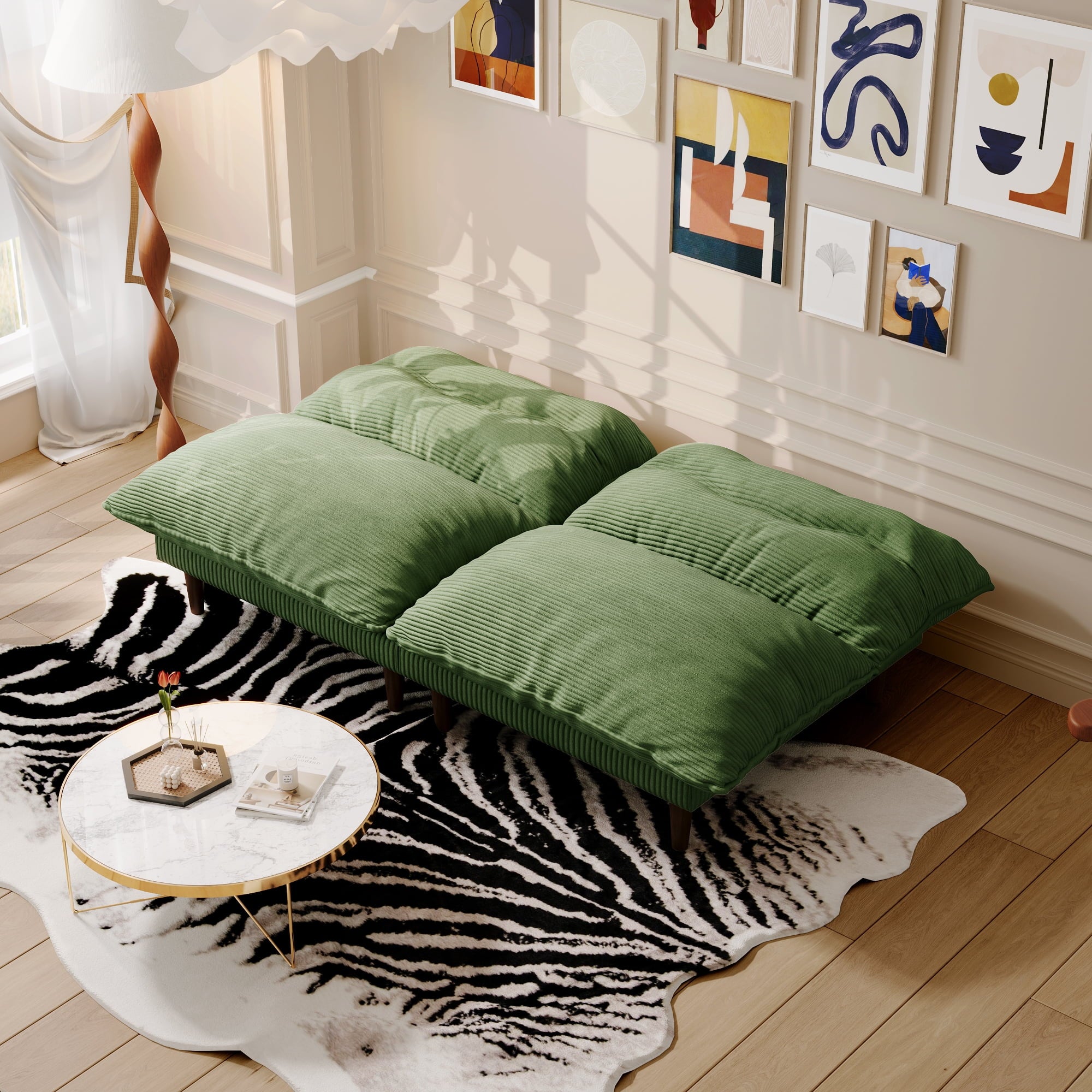 75″ 4-in-1 Corduroy Futon Couch – Convertible to Lounger, Tatami & 2 Chairs, 3-Angle Adjustable Backrest, Solid Wood Frame, 300 LBS Capacity,Green