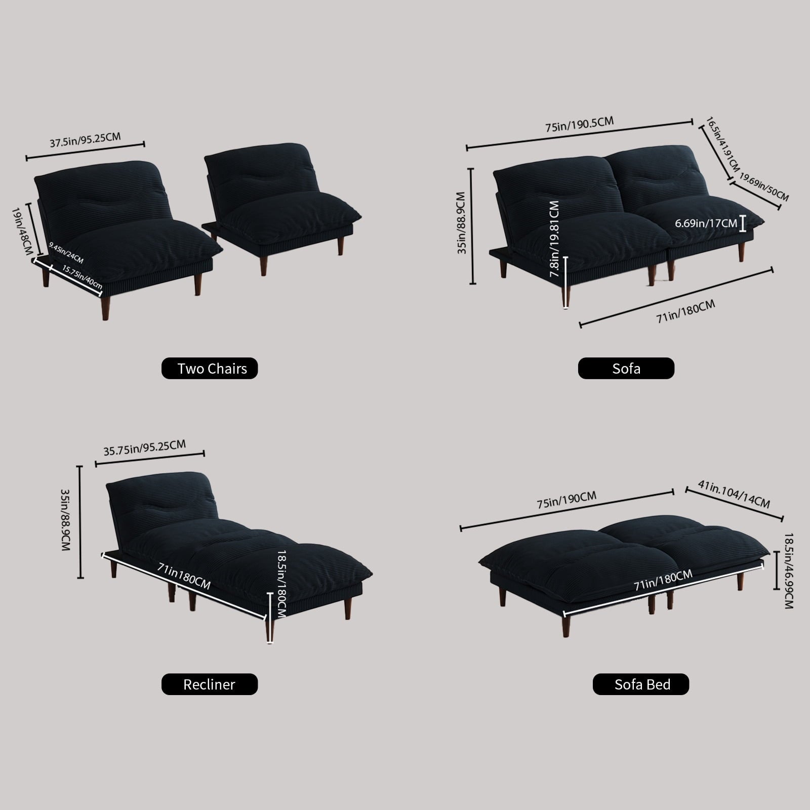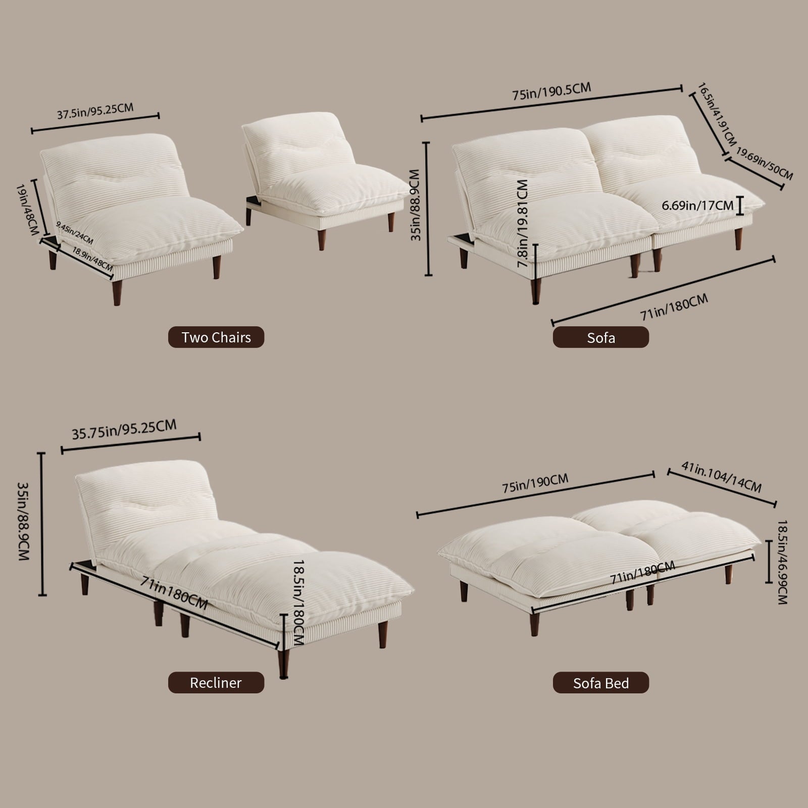 4-in-1 Design: Converts easily between sofa, sleeper sofa, recliner, and two separate chairs.​