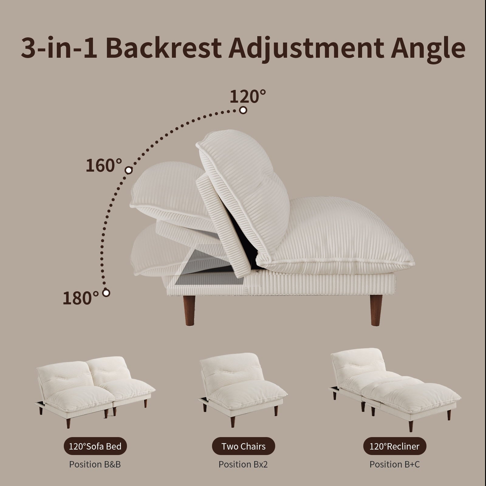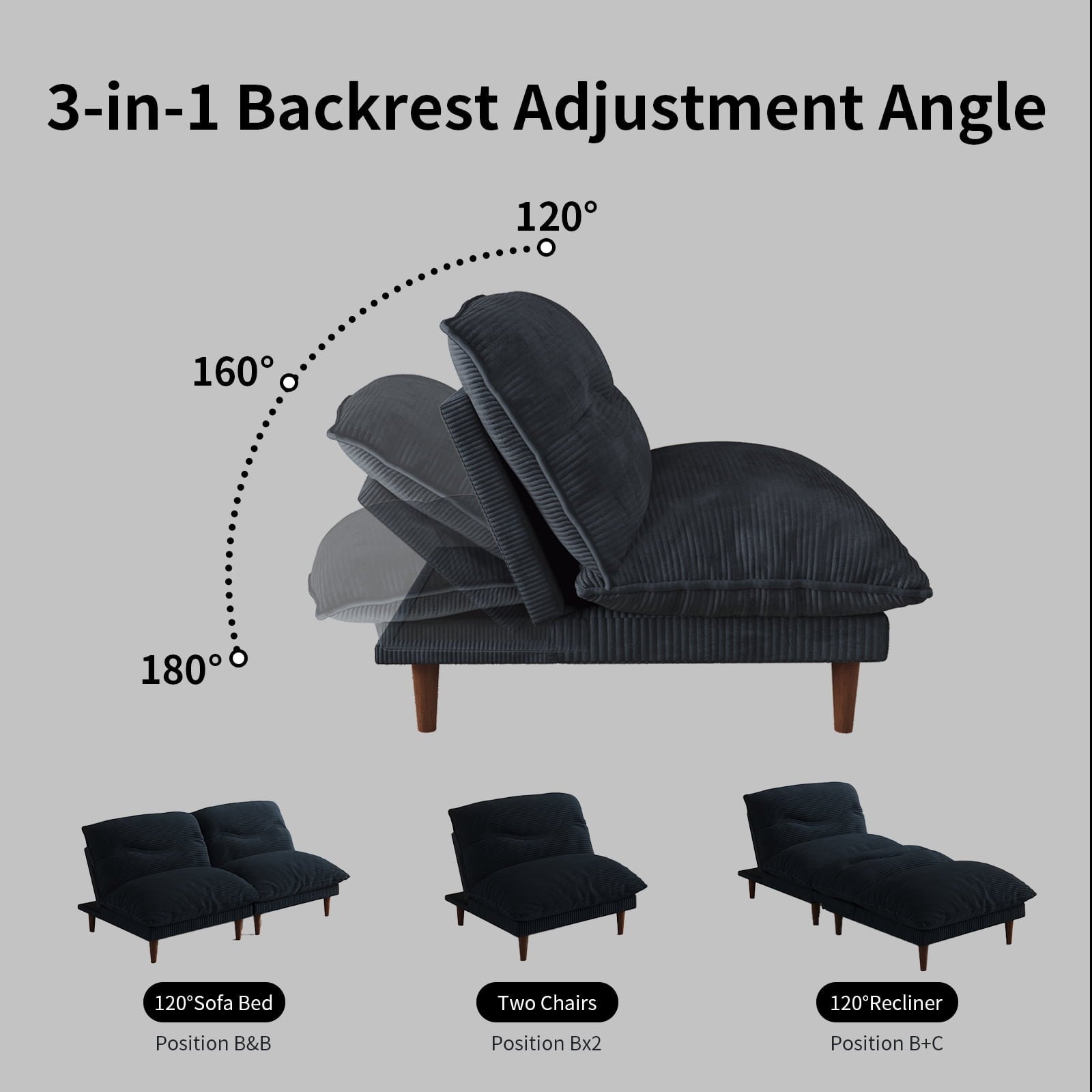 • Customizable Comfort:Adjust the backrest to 120°, 160°, or 180° for the perfect angle whether you’re binge-watching TV, reading a book, or taking a nap.