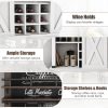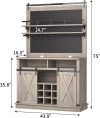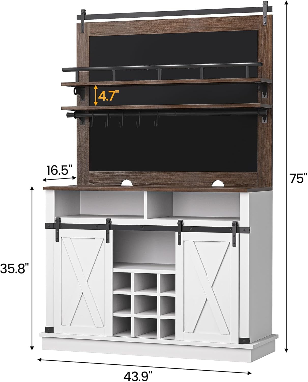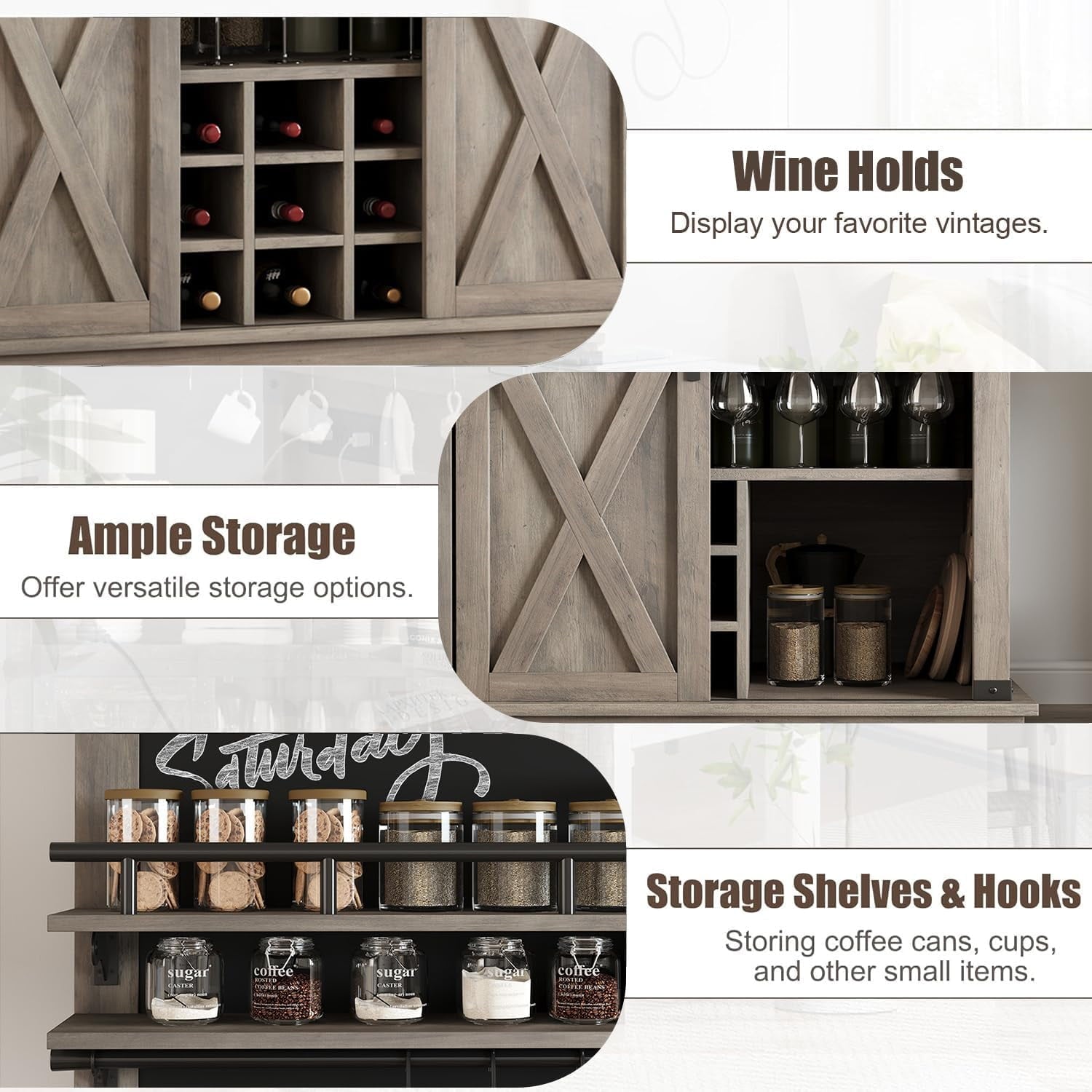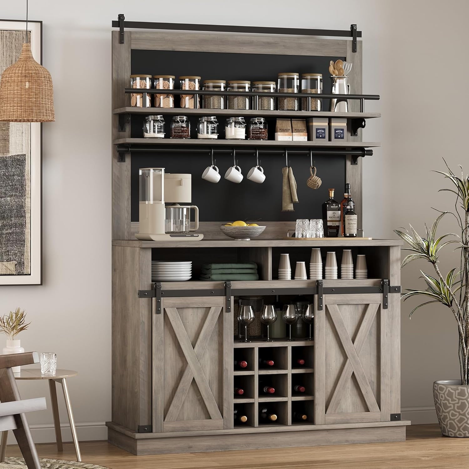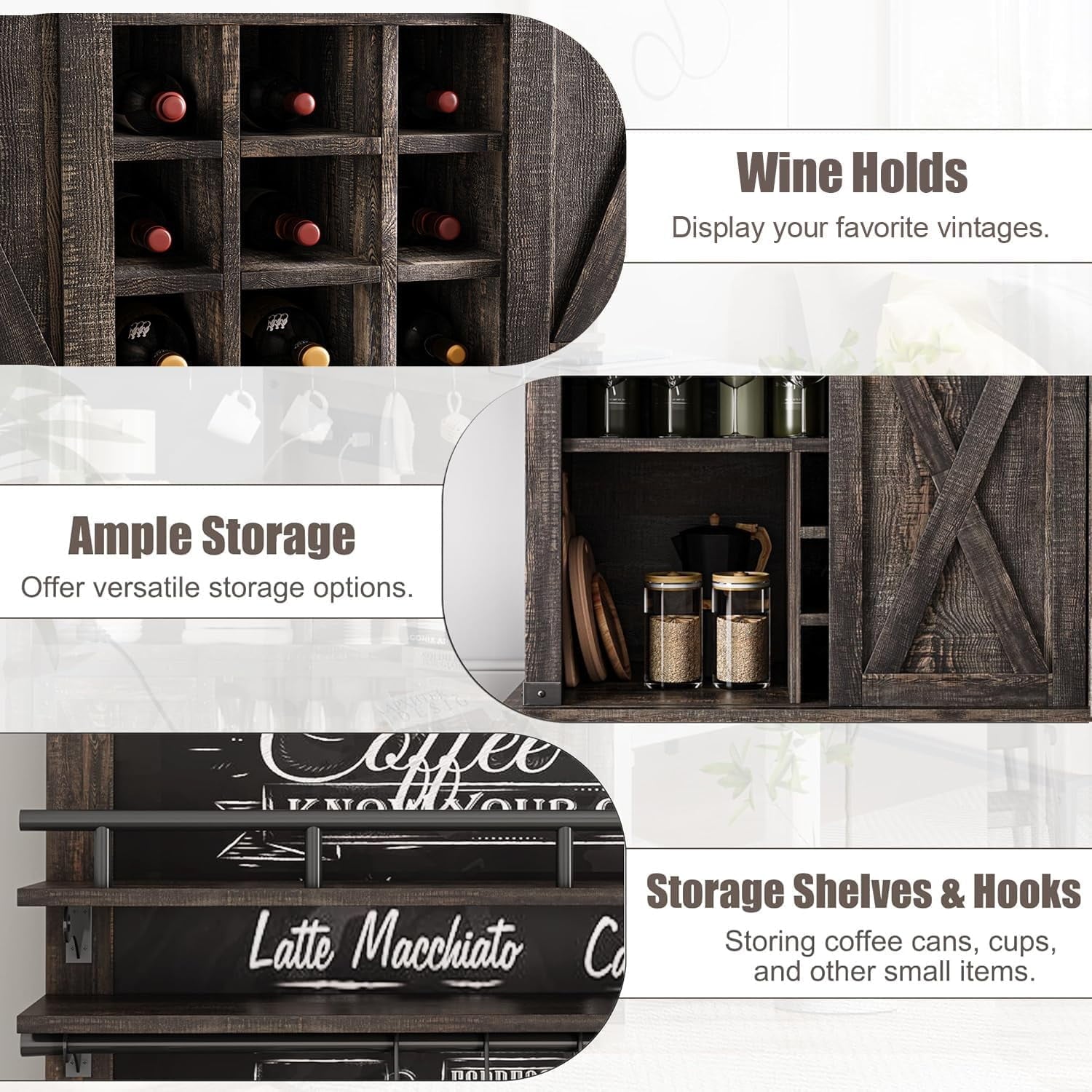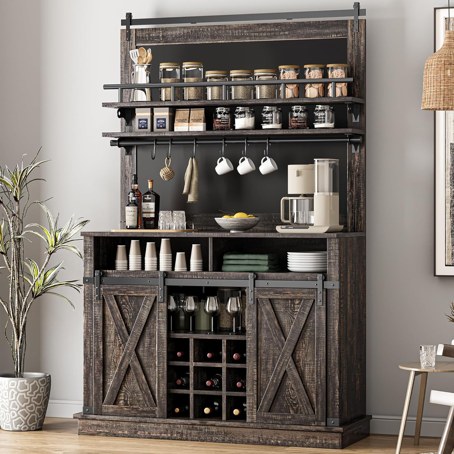 MULTI-FUNCTIONAL USE: With its spacious design, the coffee hutch provides ample storage, including two upper storage shelves ideal for coffee beans, cups, etc. The bottom features 2 barn door cabinets and 9 small storage units for convenient and organized coffee-related items, wine and more. Our buffet is versatile and can be used to its advantage as a coffee bar, sideboard, home bar furniture and more! Additionally, it comes equipped with six hooks for hanging small items for added convenience.