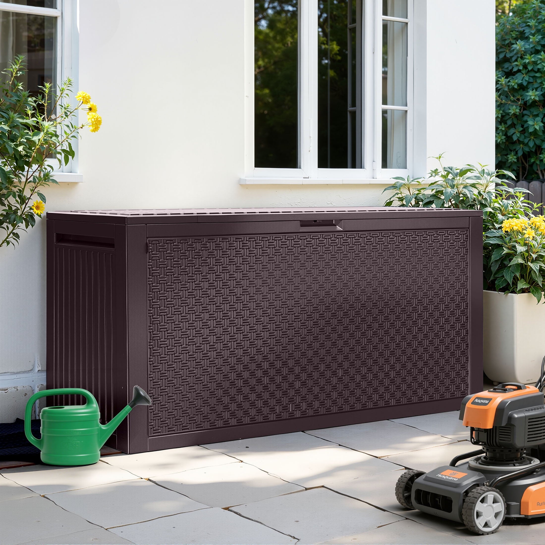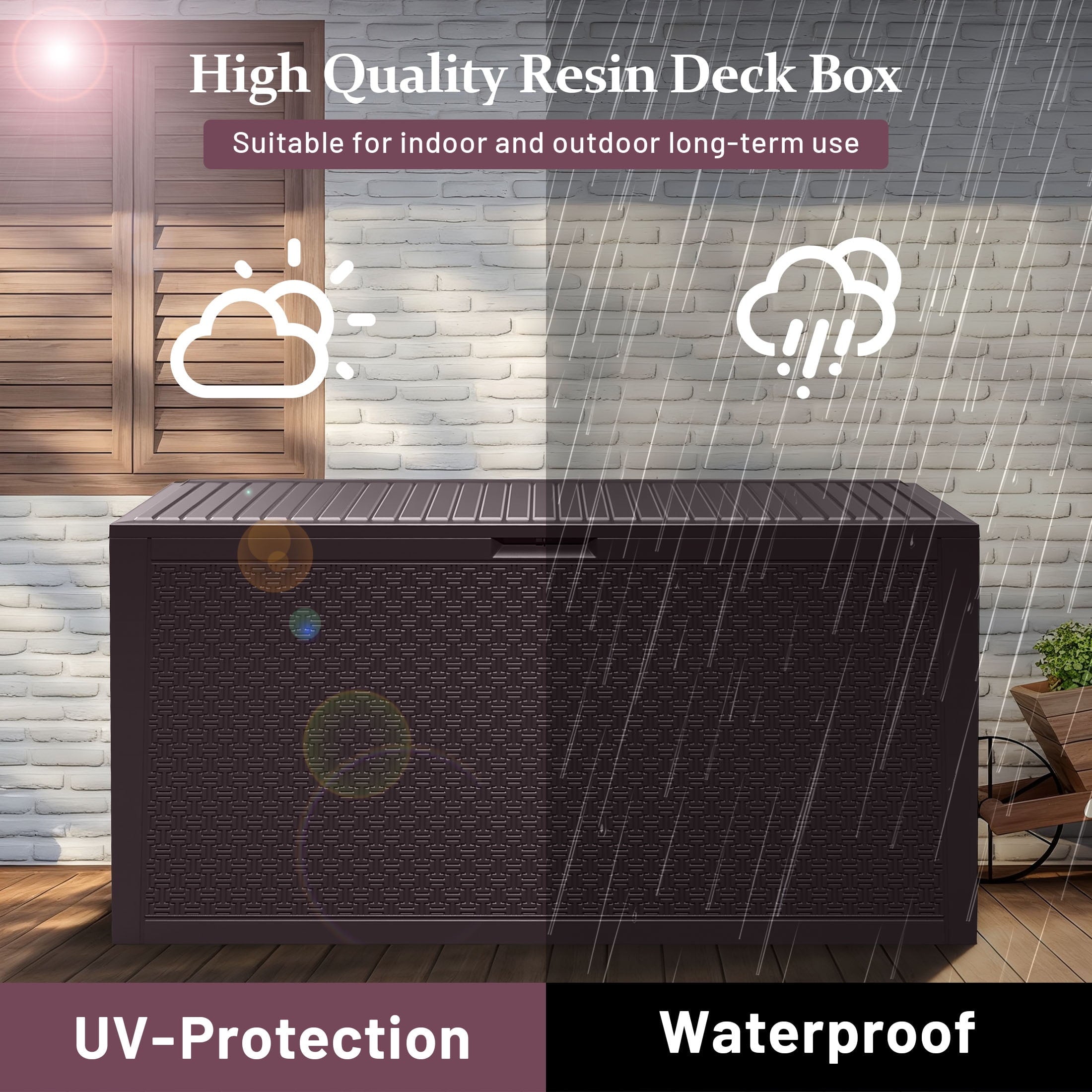 • 【 WATERPROOF & FADE PROOF】Built Tough for All Seasons! The outdoor storage box is made of resin material, which resists cracking, UV rays, and moisture. Waterproof seals protect contents; rust-proof design withstands rain, snow, and blazing sun.