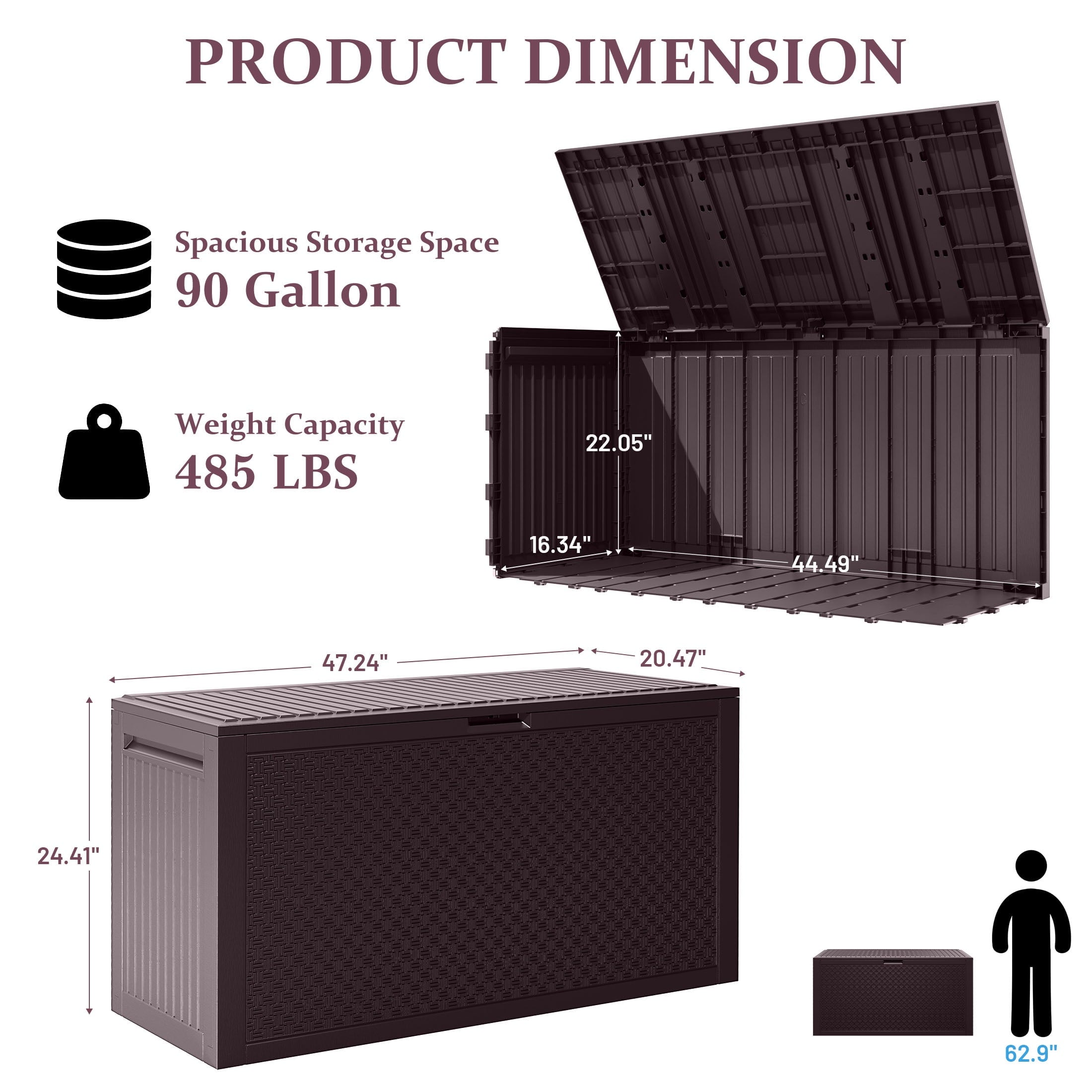 • 【AMPLE STORAGE SPACE】Exterior: 47.24 in. L x 20.47 in. D x 24.41 in. H / Interior: 44.49 in. L x 16.34 in. D x 22.05 in. H. The deck box has a storage capacity of 90 gallons and is suitable for storing outdoor furniture cushions, garden tools, etc.