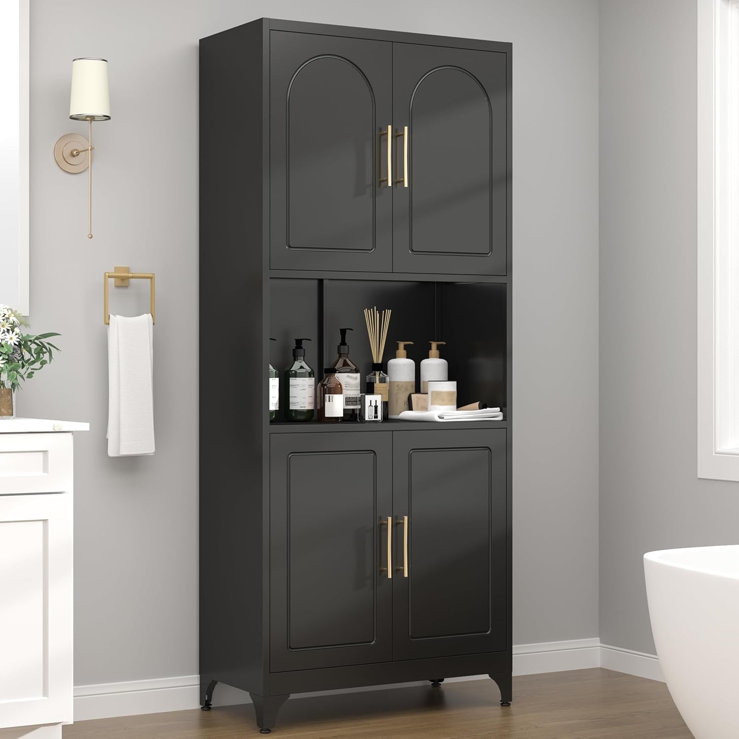 - Upgraded Stylish Design: The surface of this tall bathroom storage cabinet is curved to increase the aesthetics. Adjustable shelves in the upper and lower cabinets. It can accommodate items of different sizes. The center part is open design