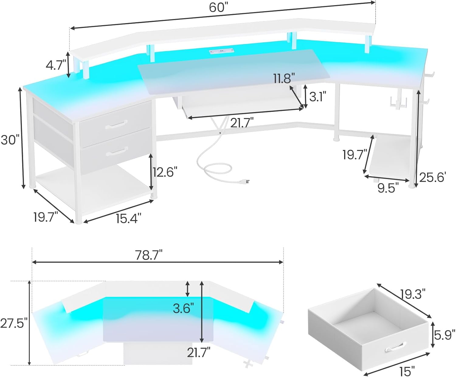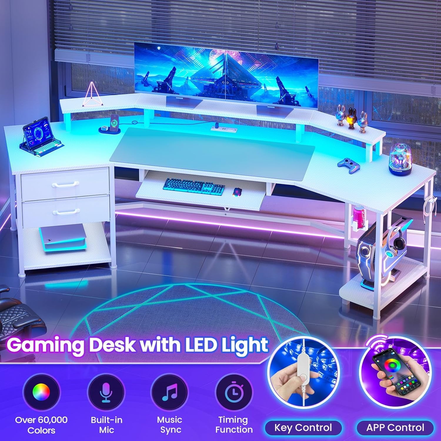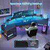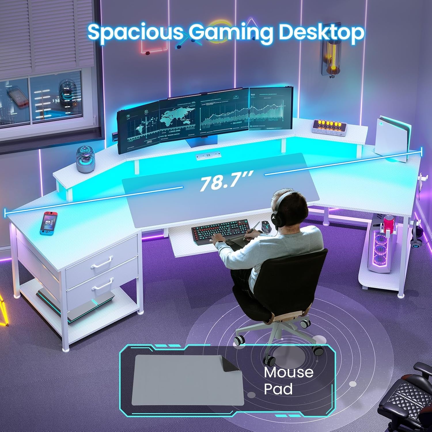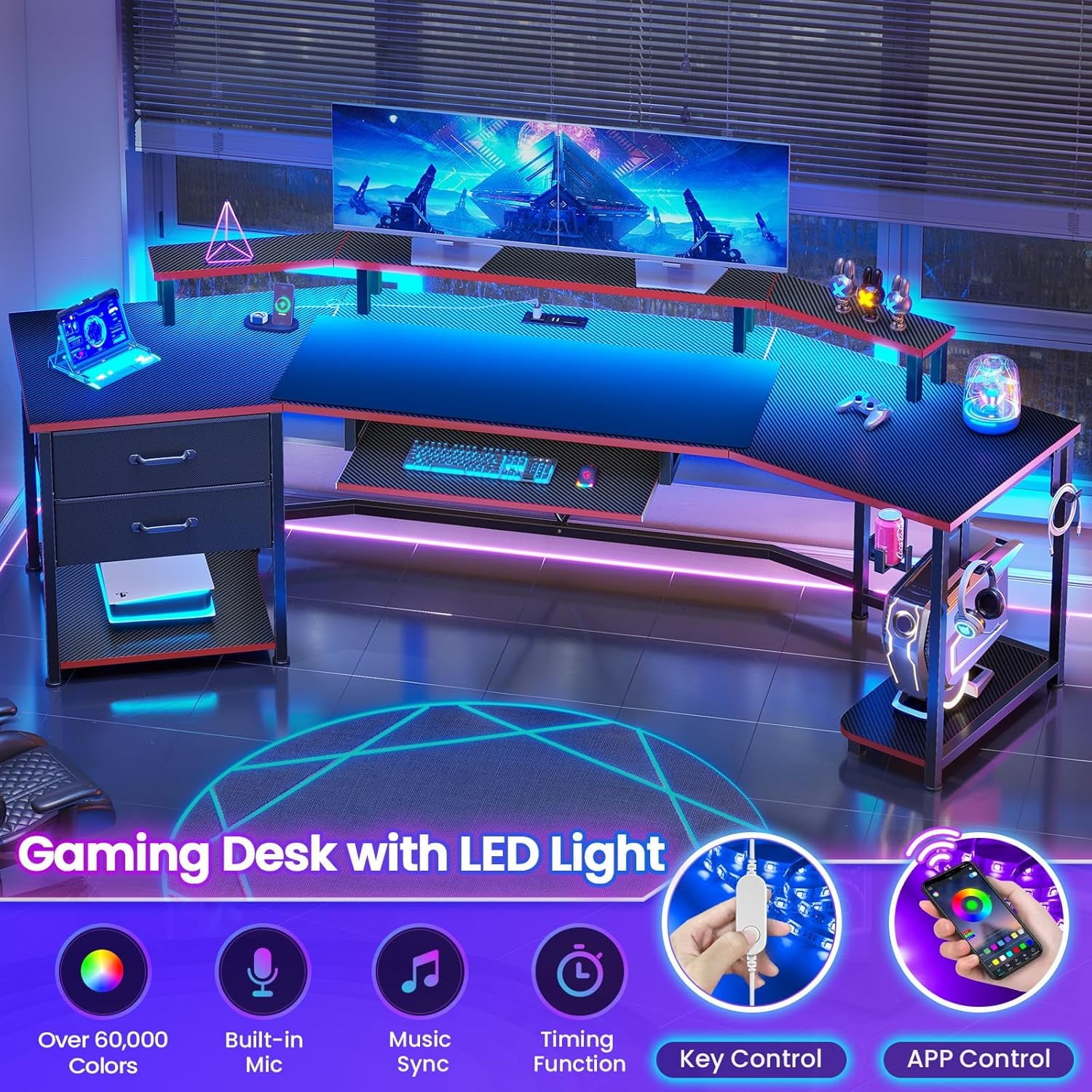 Home Desks 79″ Gaming Desk with LED Lights and Power Outlets, U Shaped Desk with Monitor Stand and Drawers, Gaming Table with Keyboard Tray, Cup Holder and CPU Stand for Bedroom, Carbon Fiber Black