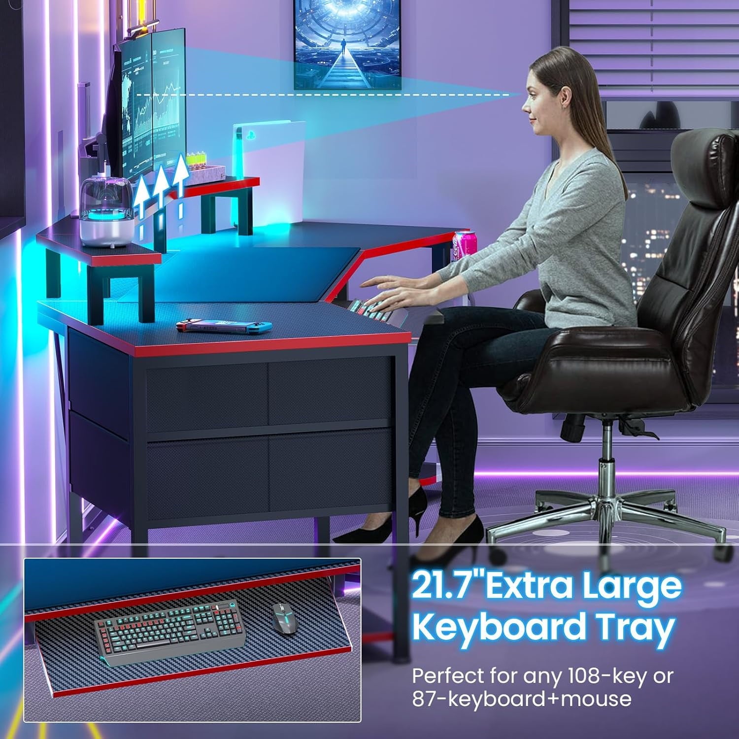 79″ Gaming Desk with LED Lights and Power Outlets, U Shaped Desk with Monitor Stand and Drawers, Gaming Table with Keyboard Tray, Cup Holder and CPU Stand for Bedroom, Carbon Fiber Black