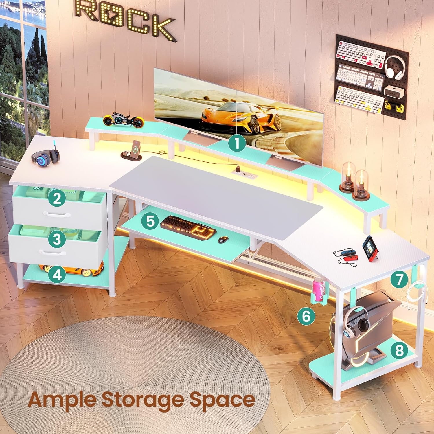 79" Gaming Desk with LED Lights and Power Outlets, U Shaped Desk with Monitor Stand and Drawers, Gaming Table with Keyboard Tray, Cup Holder and CPU Stand for Bedroom, Carbon Fiber Black