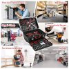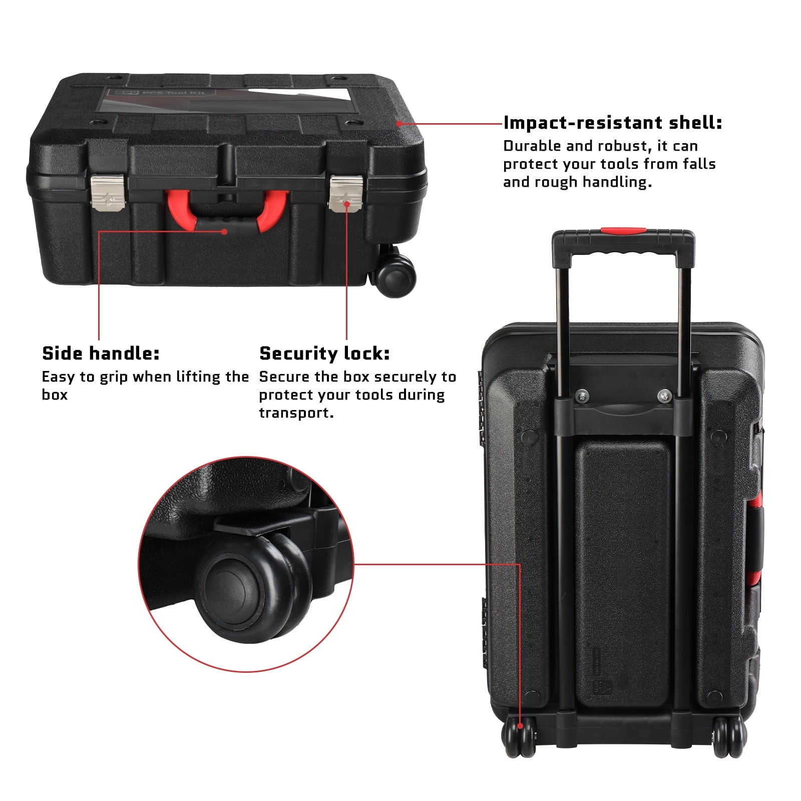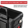 - – There are multiple compartments inside the toolbox, and each tool is protected and easy to remove. The wheels and telescopic handle make this toolbox effortless to move, go anywhere.