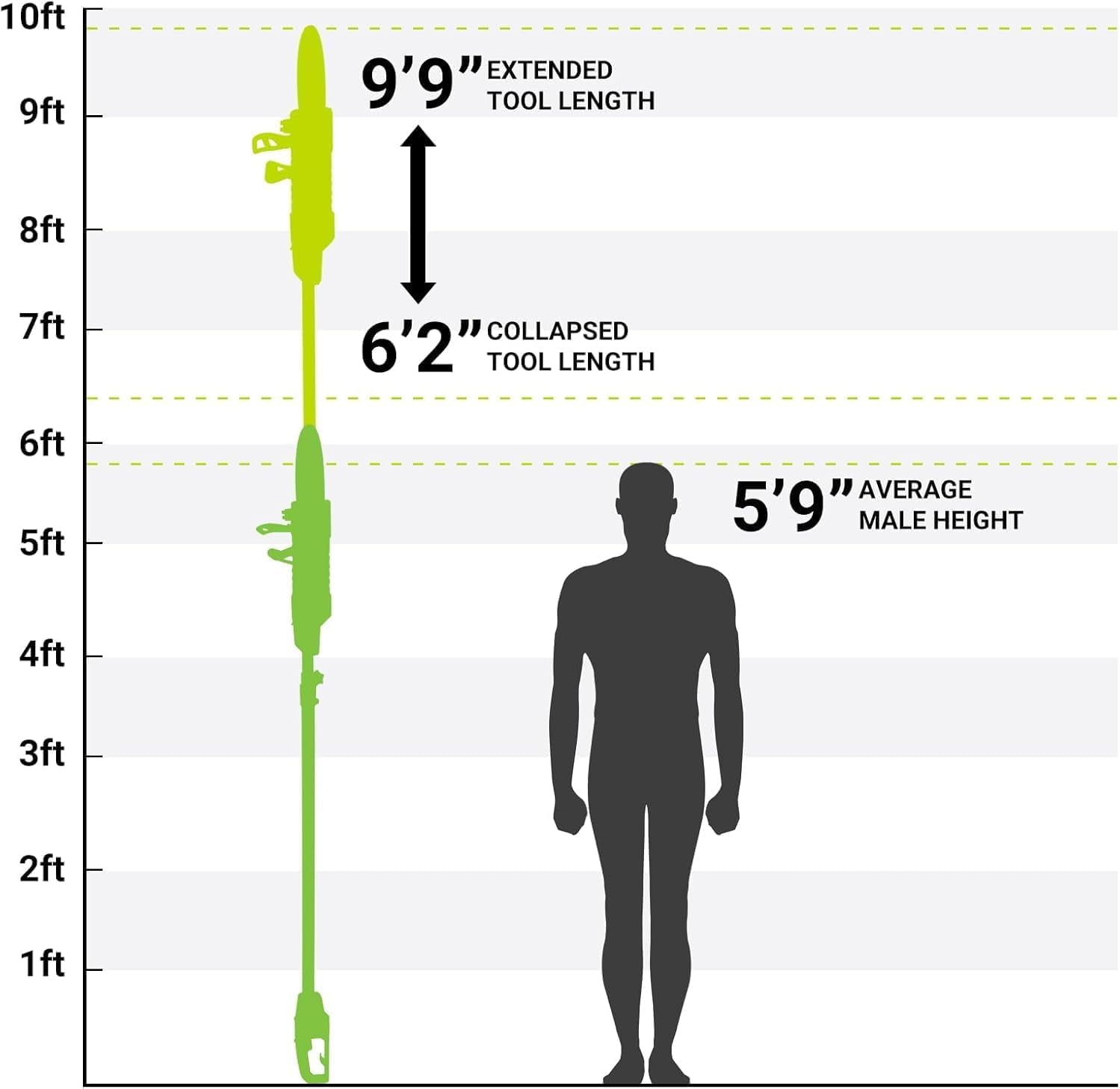 - Provides an extended reach of up to 10 feet for accessing higher branches.
