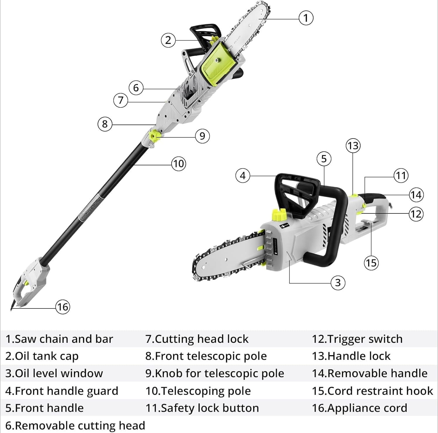 - Functions as an electric pole saw for elevated trimming tasks.