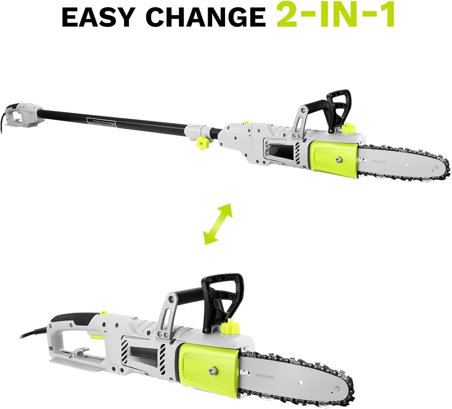 This 8 Amp corded electric pole saw offers a versatile 2-in-1 design, allowing it to function as both a pole saw for trimming high branches and a regular chainsaw for ground-level wood cutting projects. It features a 10-inch chain and bar, powered by a pure copper motor that reaches speeds up to 6500 RPM, ensuring powerful performance for various tree trimming tasks. The tool-free assembly allows for an extended reach of up to 10 feet, while its lightweight 10 lb design ensures easy handling. For enhanced safety, this green-finished tool includes a dual-button start mechanism, requiring two buttons to be pressed simultaneously to operate.