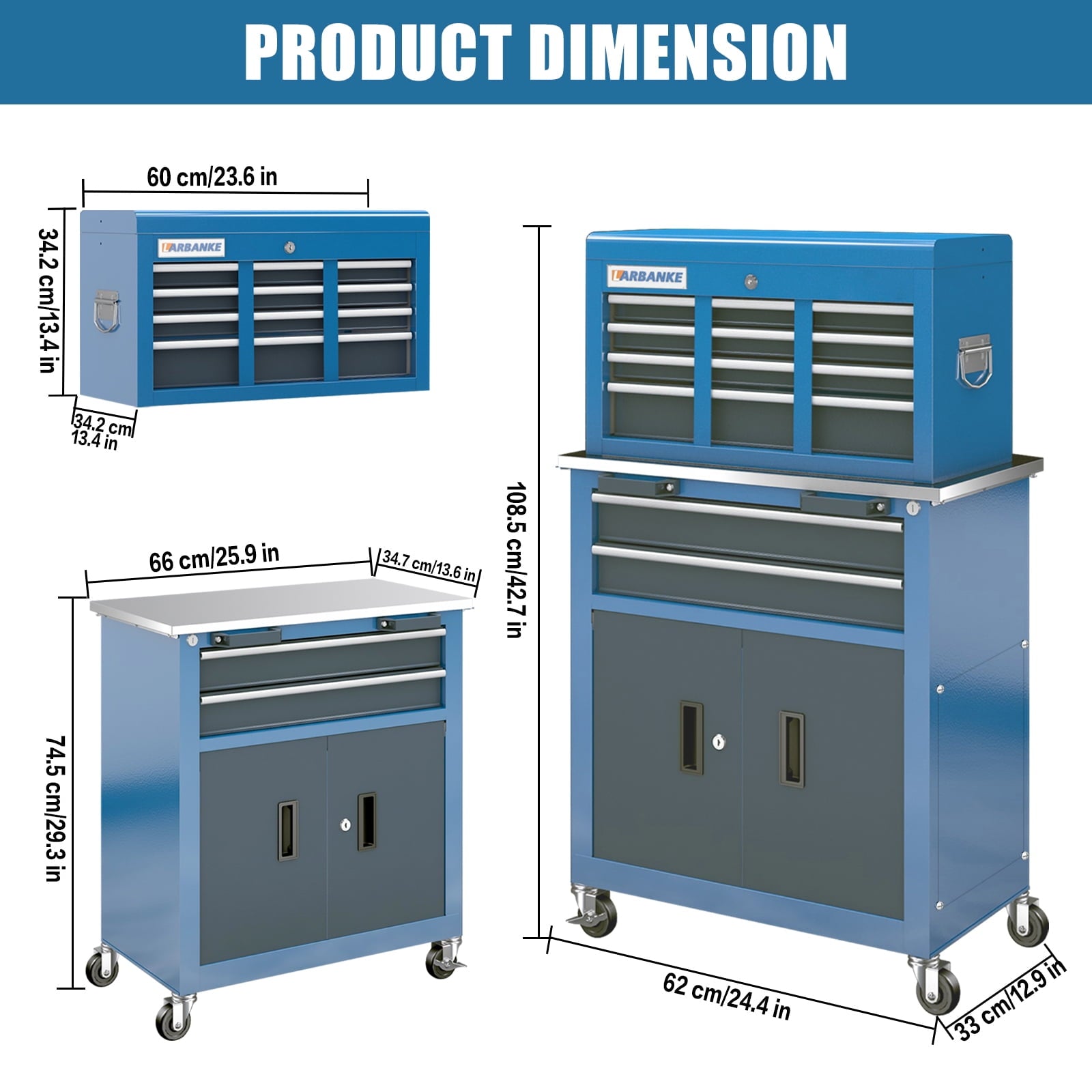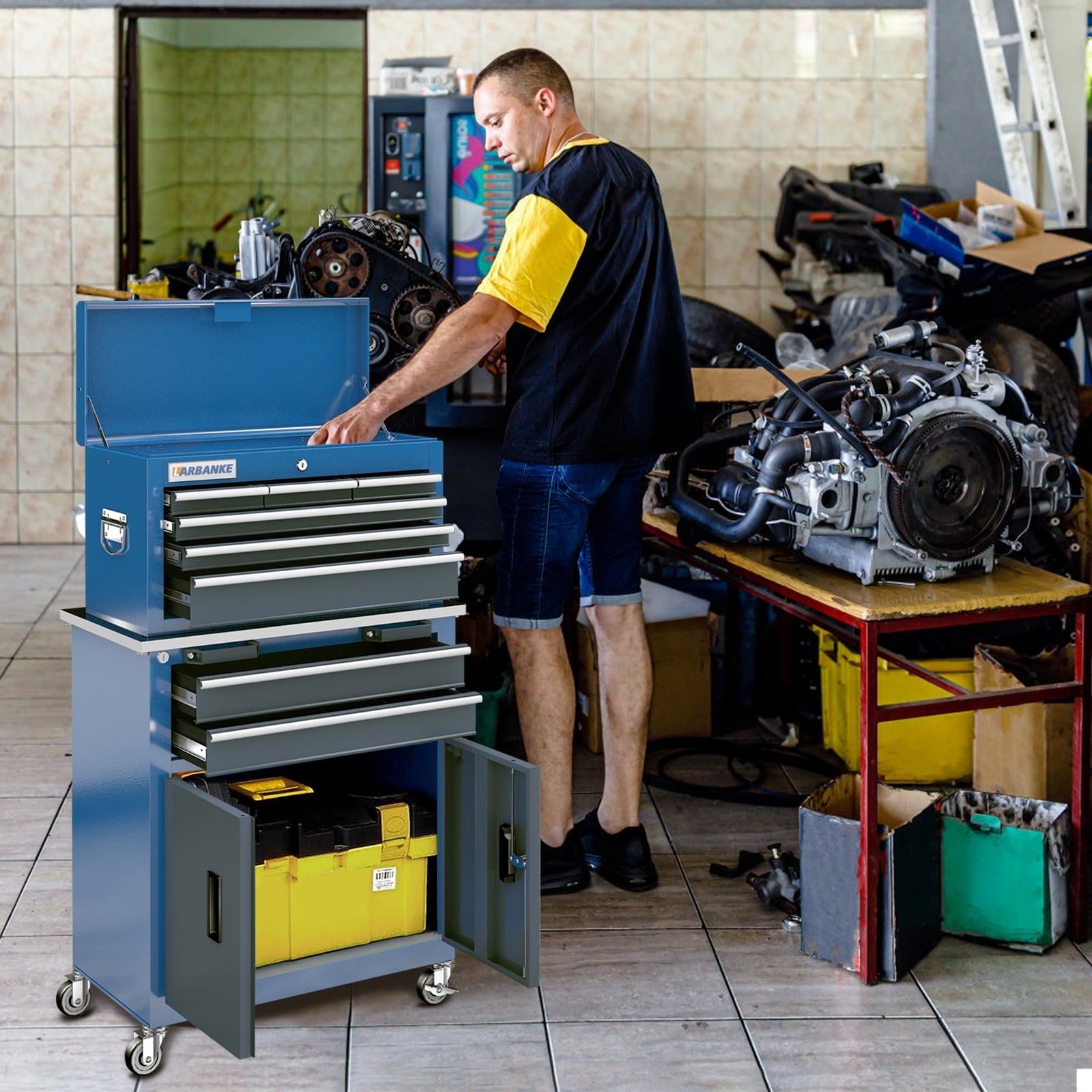 LARBANKE Pro-Grade Transformer System – The 2-in-1 toolbox/workstation revolution for American garages. Switch modes in 3 secs with patented quick-latch, combining 8-drawer storage + scratch-resistant stainless top to boost space efficiency 50%. Built with 1.2mm alloy steel frame & military-grade shock-absorbent liners, our 600lbs-capacity beast (30% above standards) keeps tools secure during transit via ASTM-certified dual locks. SilentGlide 360° magnetic casters + 35dB rubber feet protect hardwood floors, while automotive-grade anti-rust coating withstands harsh workshop conditions. Master tool/cleaning/pantry organization from factory floors to home garages with pro-level space engineering.