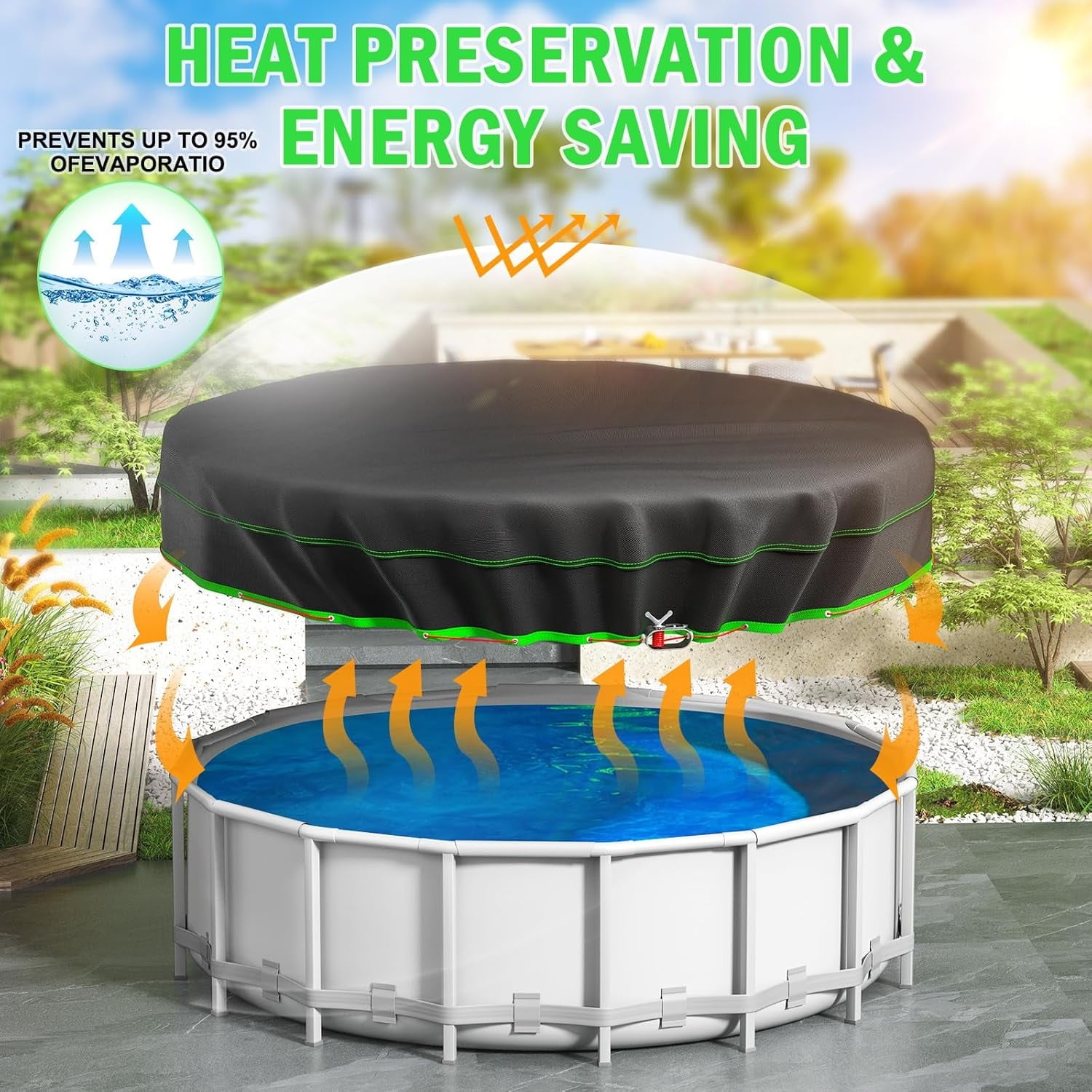 【Heat Preservation and Energy Saving】This 18 Ft round pool cover can utilize solar energy to heat the pool water, maintain and increase the water temperature, and effectively prevent 90% water evaporation, saving water and making your pool more comfortable and energy-efficient.