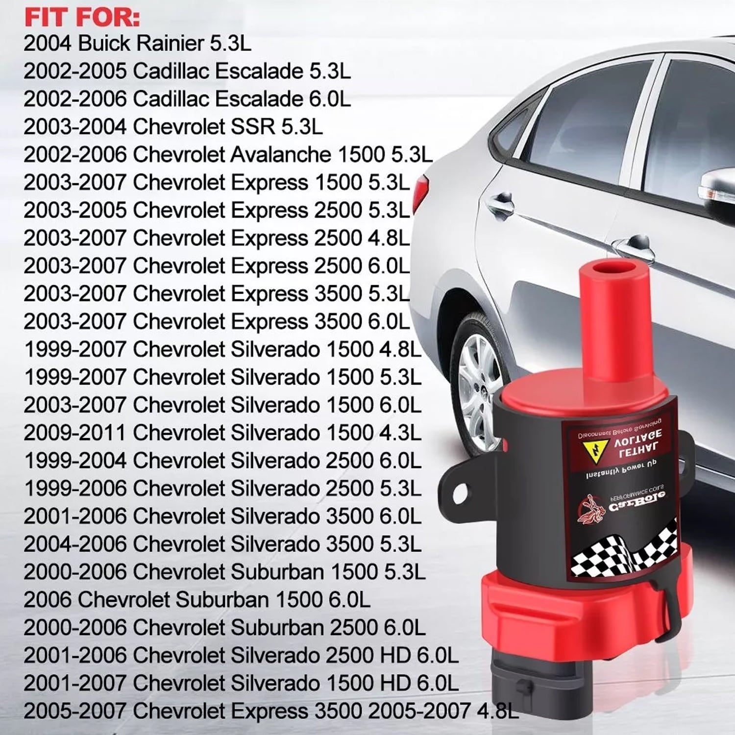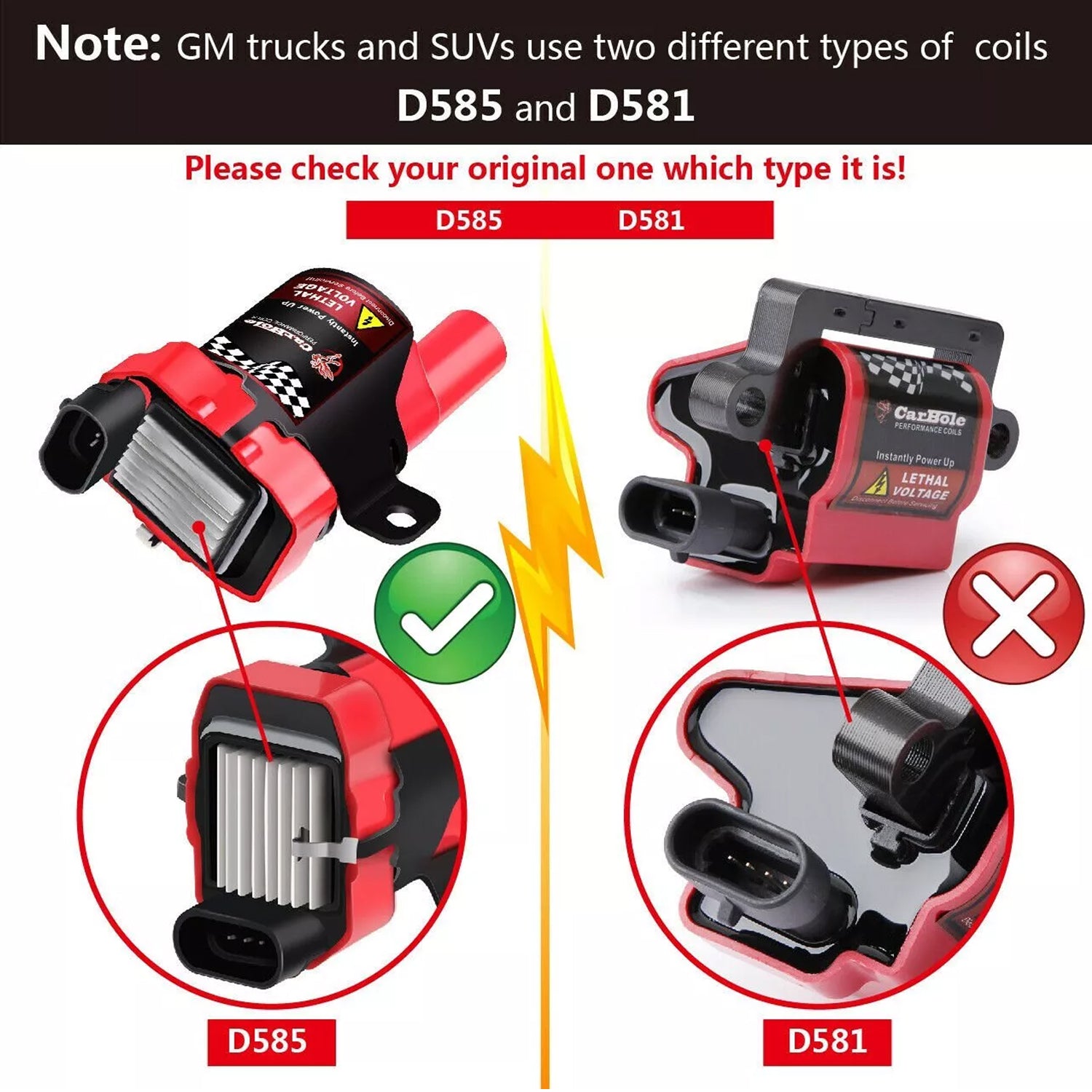 GM trucks and SUVs use two different types of coils: the MELCO style coils with the square body and the DELPHI style coils with the round body. The coils shown in the pictures are the DELPHI style with heat sinks, which look like metal fins or small radiators.