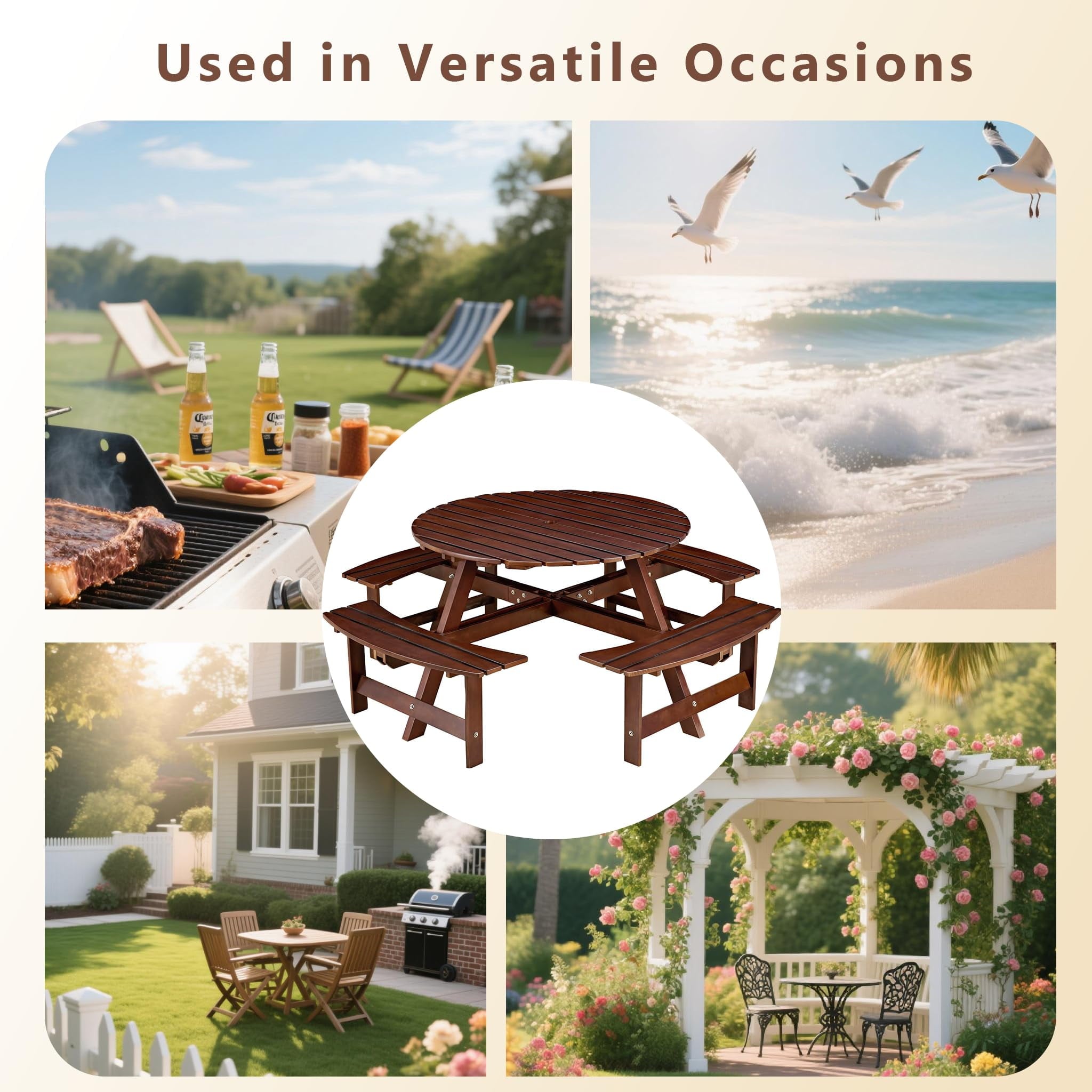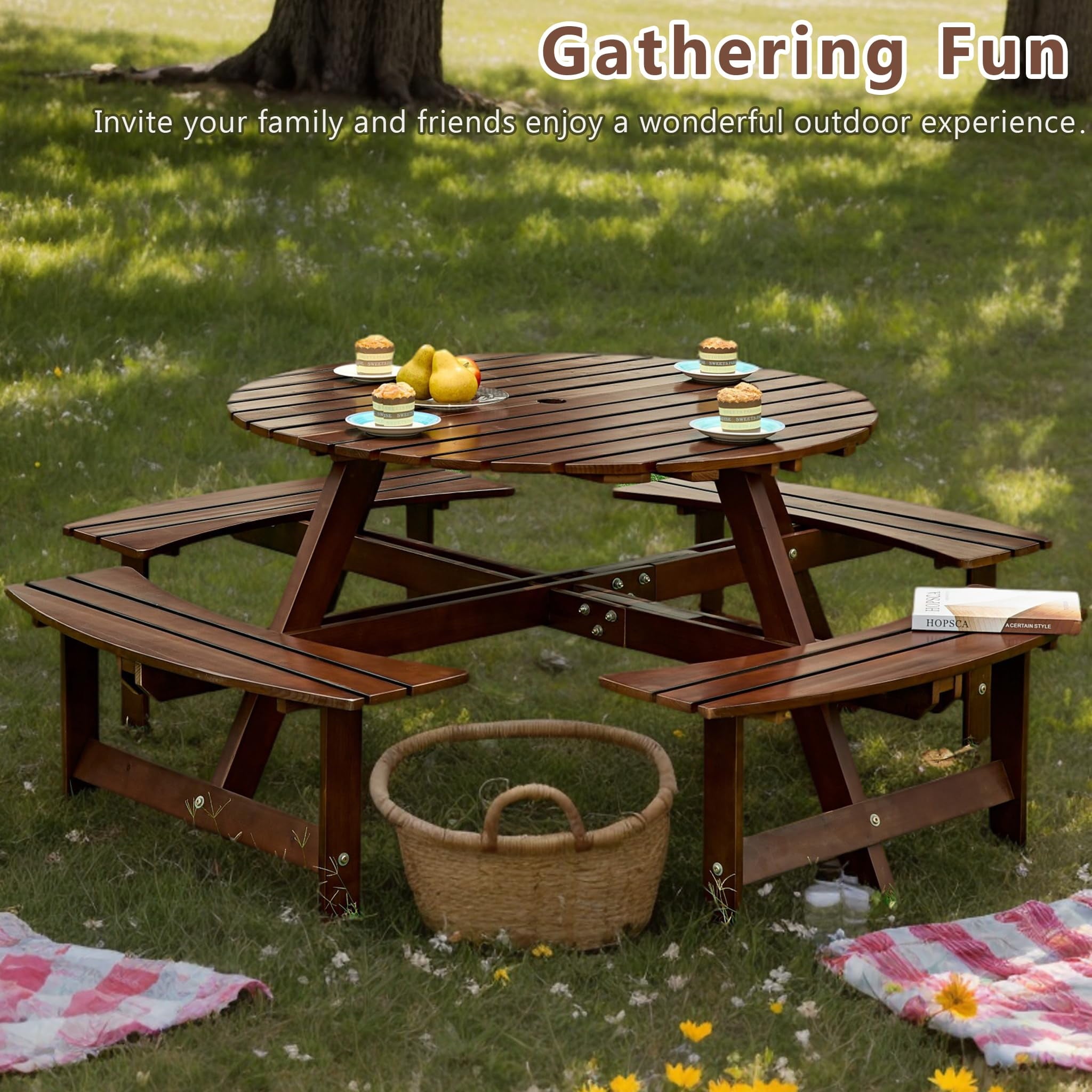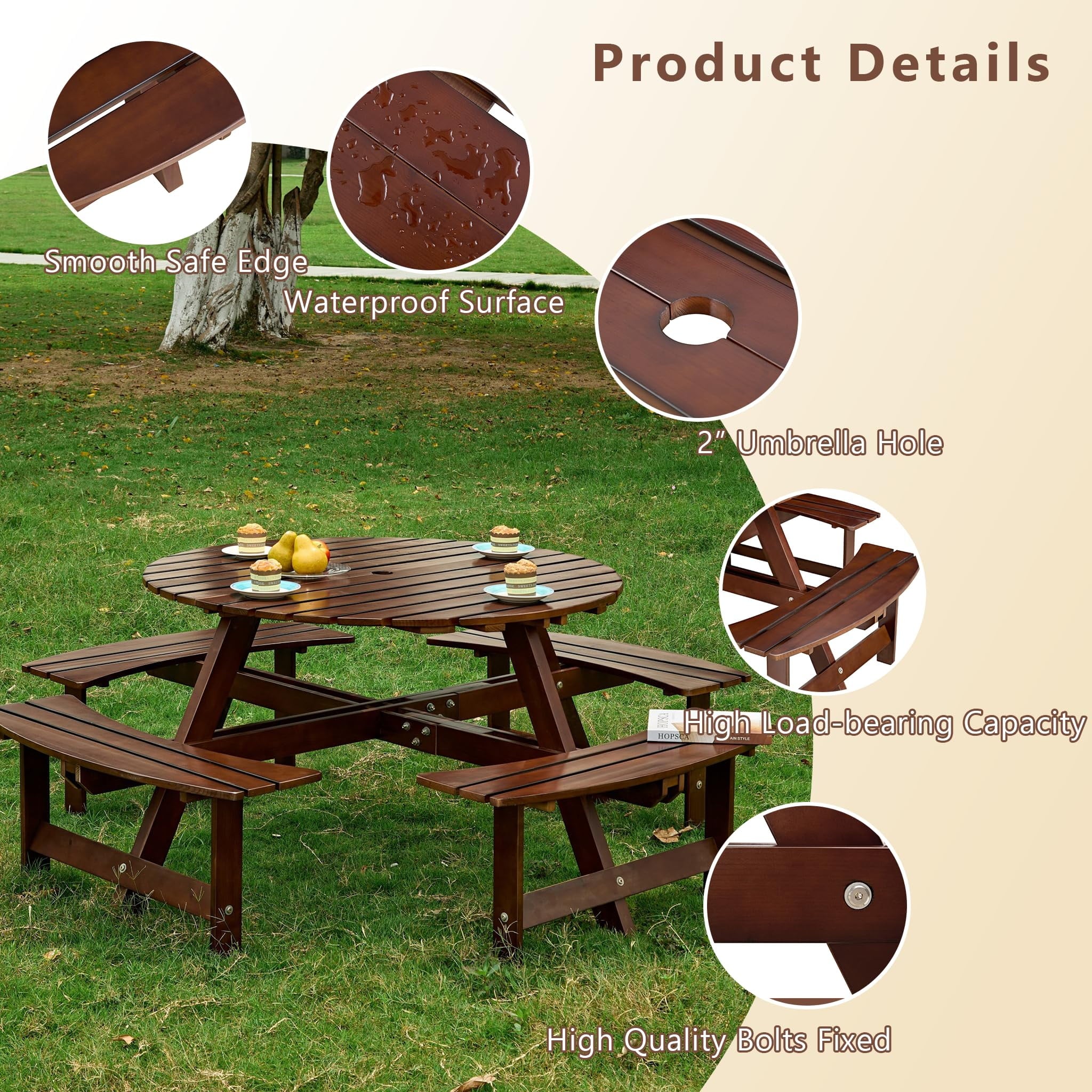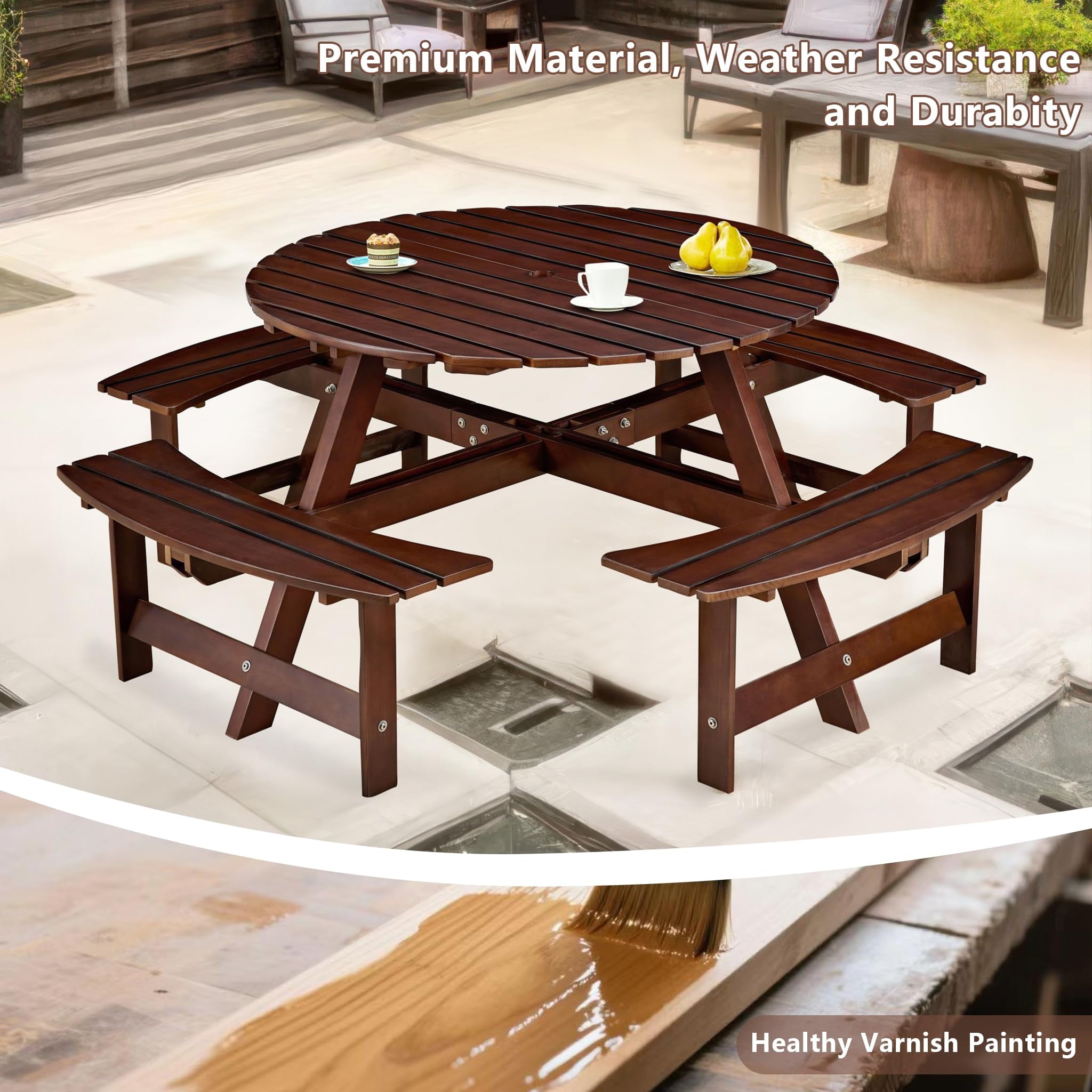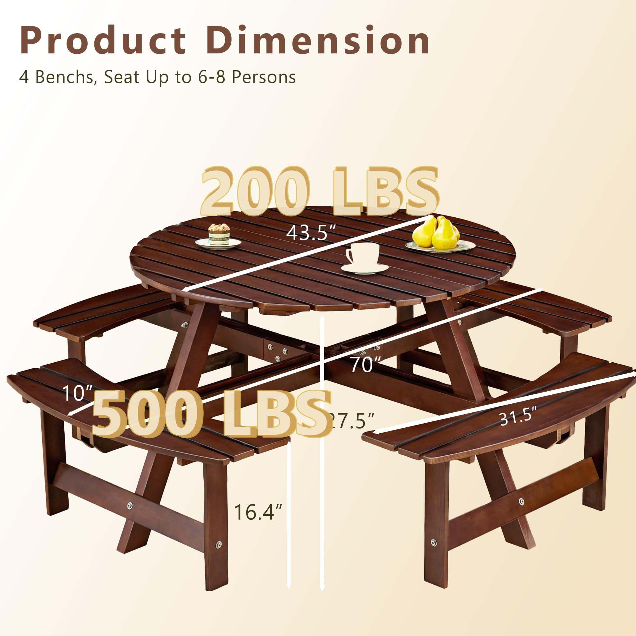- [Reinforced Construction]This circular outdoor picnic table is made of solid fir wood, which is durable, burr-free, and weather-resistant. It has a strong loading capacity of up to 500 lbs per bench and 200 lbs for the tabletop, with a total weight capacity of 2200 lbs, ensuring long-term outdoor use.