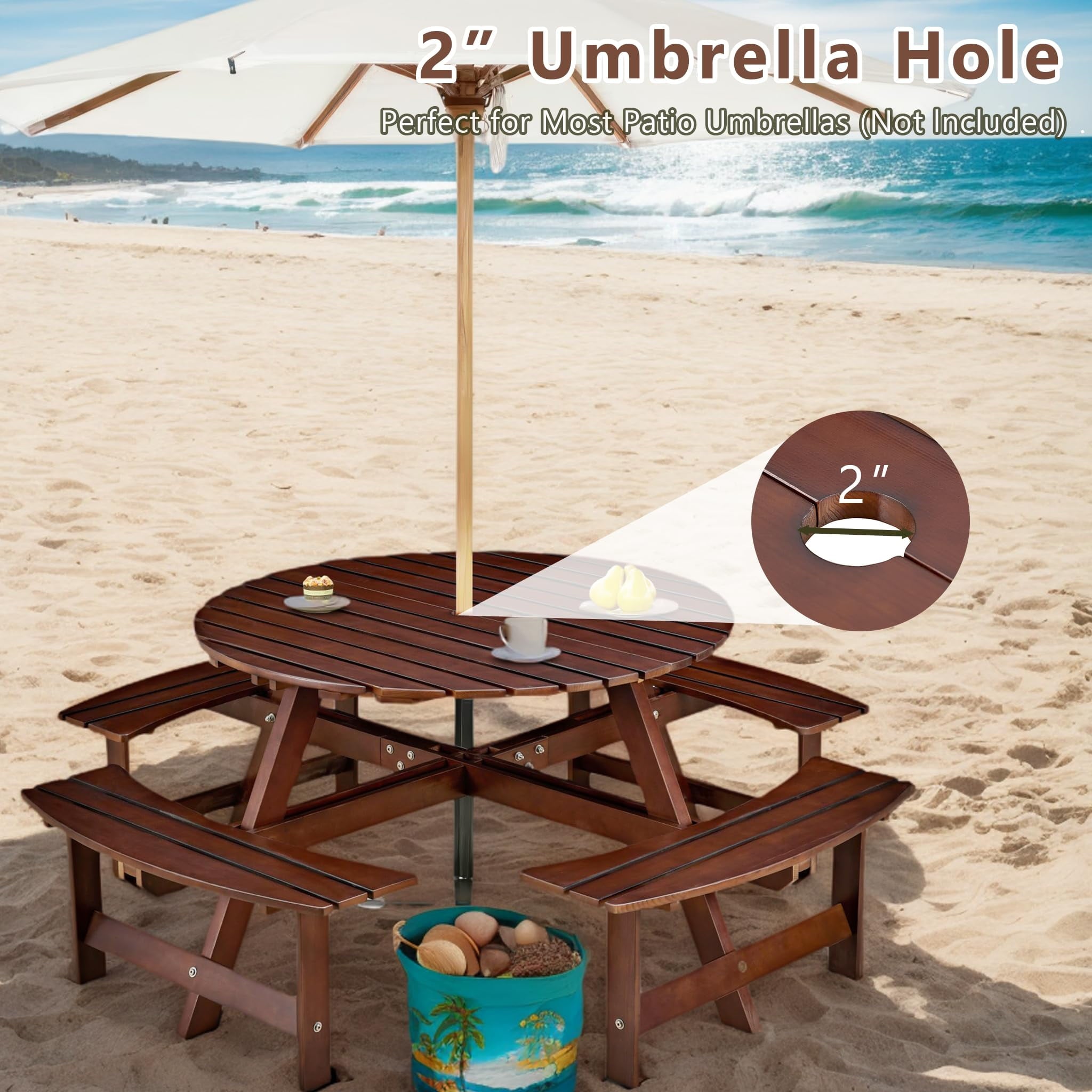 Introducing our exceptional circular outdoor picnic table! It’s crafted from durable, weather-resistant solid fir wood. With a strong loading capacity of up to 2200 lbs, it can seat 8 kids or 6 adults comfortably. The tabletop has a built-in umbrella hole for added convenience. Its natural wood grain design gives a rustic charm. Assembly is easy with clear instructions and all necessary accessories. The smooth surface is a breeze to clean. Overall dimension: 70″ x 70″ x 27.5″