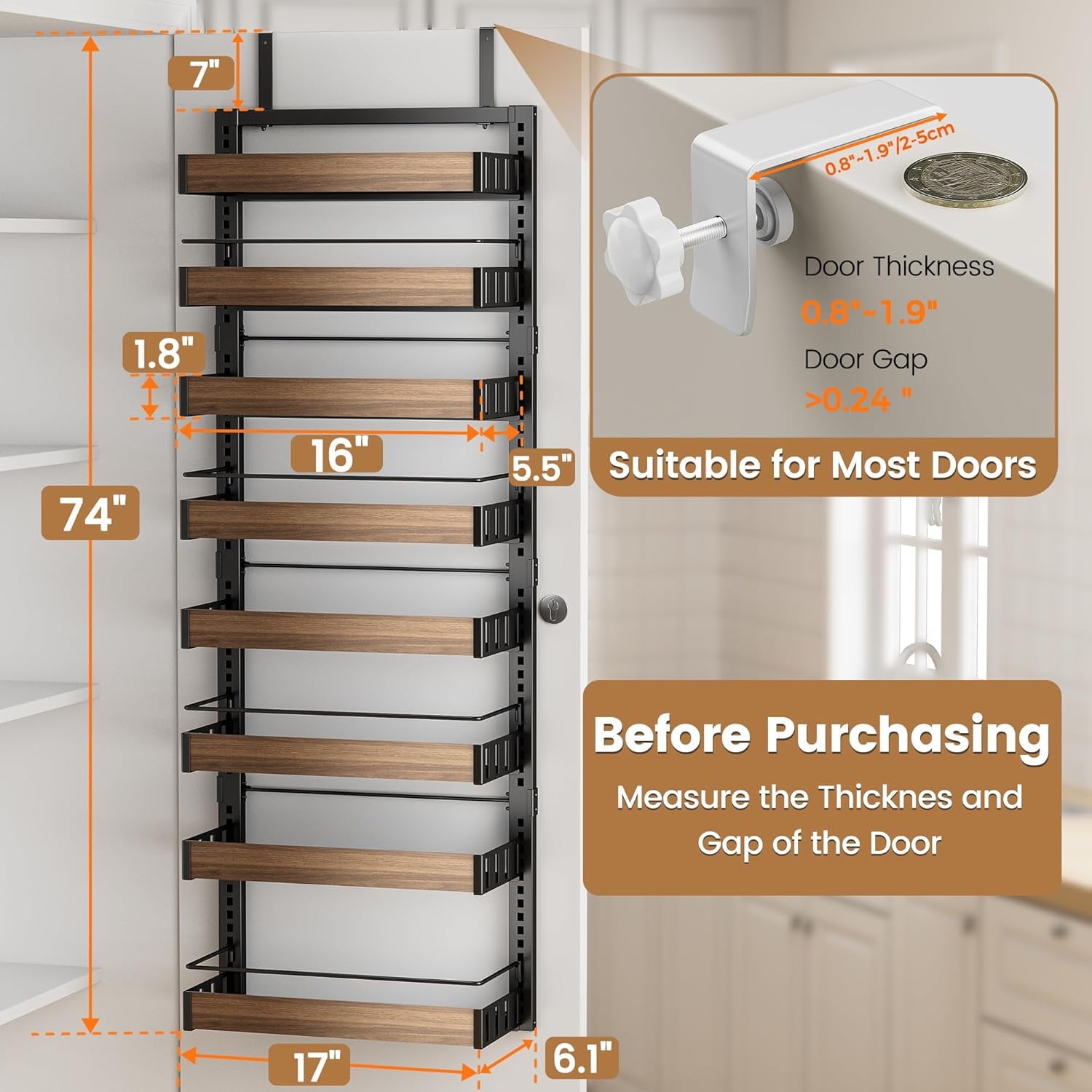 TWO MOUNTING OPTIONS FOR FLEXIBILITY: This versatile organizer can be hung over the door or affixed to the wall, making it a practical solution for pantries, kitchen cabinets, living room walls, and more. The over-the-door setup includes adjustable door hooks that can fit doors ranging from 0.8 to 1.9 inches thick. Assembly is straightforward, requiring about 10 minutes.