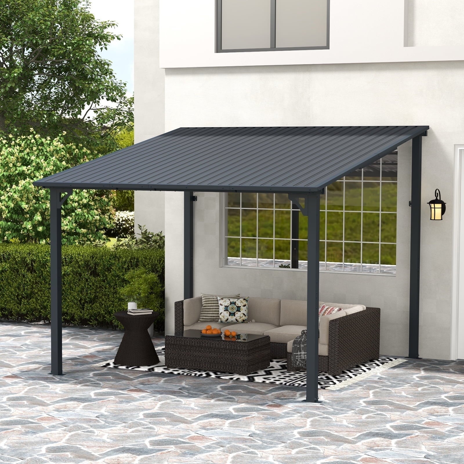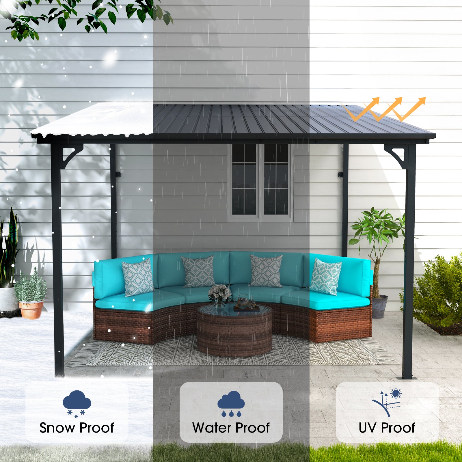 • Sturdy & Waterproof – The hard top gazebo can be securely fastened to the walls and floors, increasing stability and durability. This shade gazebo can withstand a weight of 190 pounds per square meter. The top of the gazebo is inclined and features a recessed and raised design, allowing for rapid drainage, and keeping the gazebo dry and fresh.
