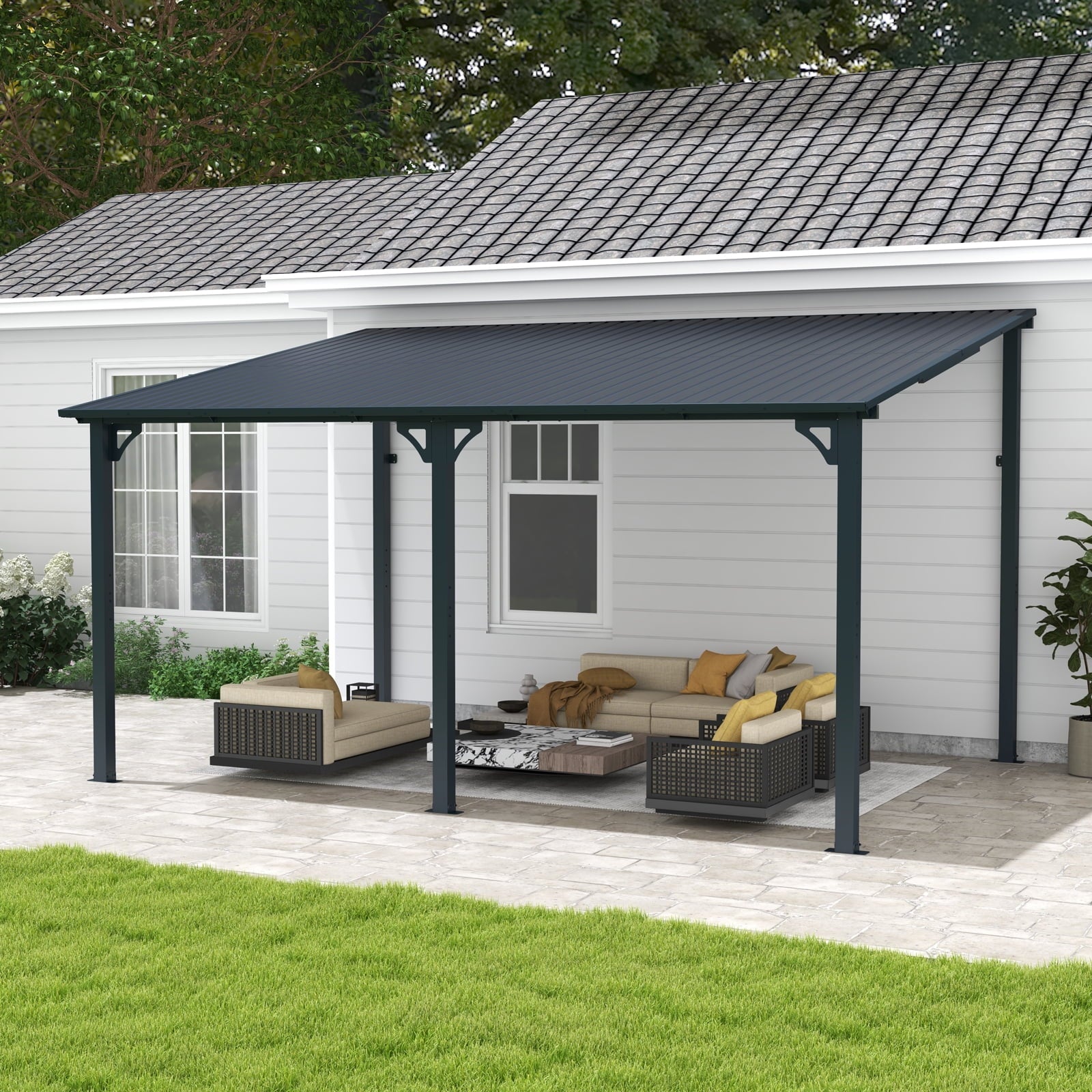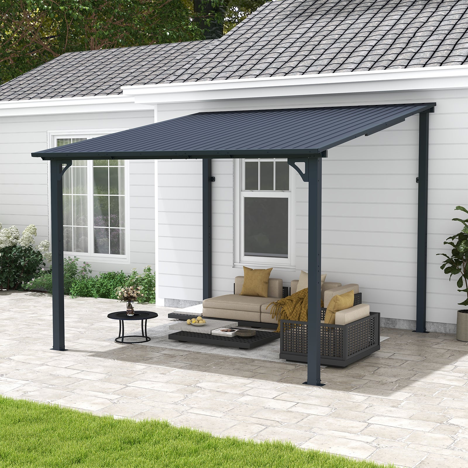8' x 10' Outdoor Pergola Gazebo, Lean to Awnings Gazebos, Heavy Duty Hard Top Metal Pergola with Roof, for Patio, Backyard, Decks, Poolside